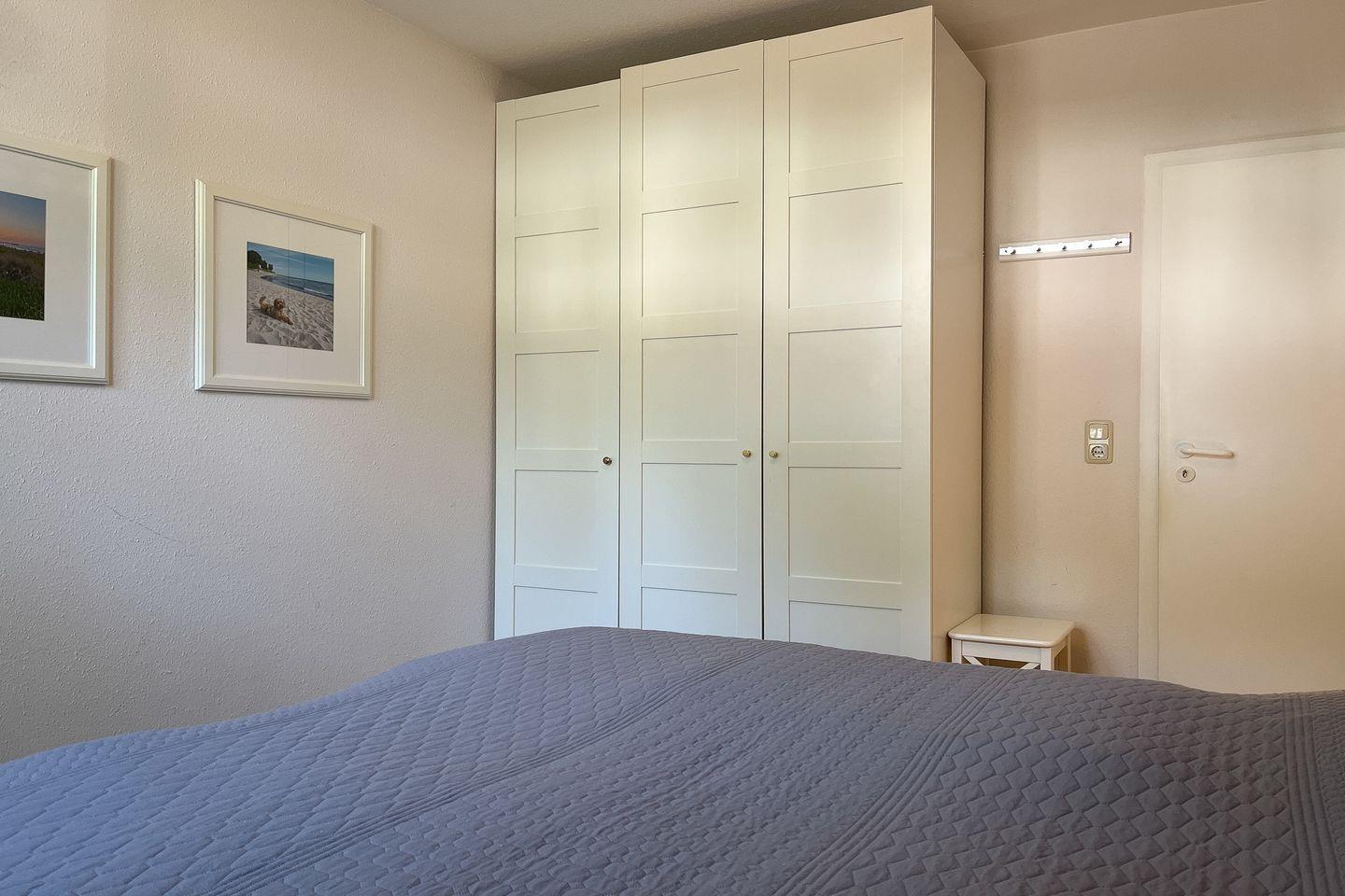 Das Schlafzimmer ist mit einem Doppelbett (2 x 90 x 200 cm) und einem großen Kleiderschrank für deine mitgebrachte Garderobe eingerichtet. Für den kleinen Urlauber stehen ein Kinderreisebett und ein Kinderhochstuhl bereit. Zur Verdunkelung gibt es Vorhänge am Fenster. Im Wohn- und Schlafbereich ist der Bodenbelag Laminat.