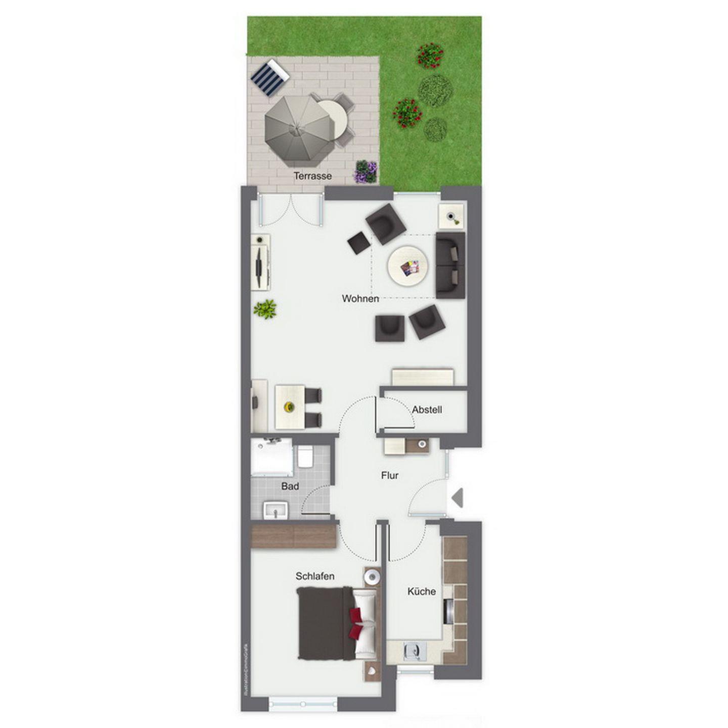 Auf ca. 54 m² erholst du dich in einer liebevoll eingerichteten 2-Zimmer-Wohung im Erdgeschoss, die über einen separaten Eingang zu erreichen ist. Zur Verfügung stehen ein Wohnzimmer mit Essbereich, ein Schlafzimmer, eine separate Küche, ein Duschbad und eine Terrasse in Süd-Ost-Ausrichtung.
