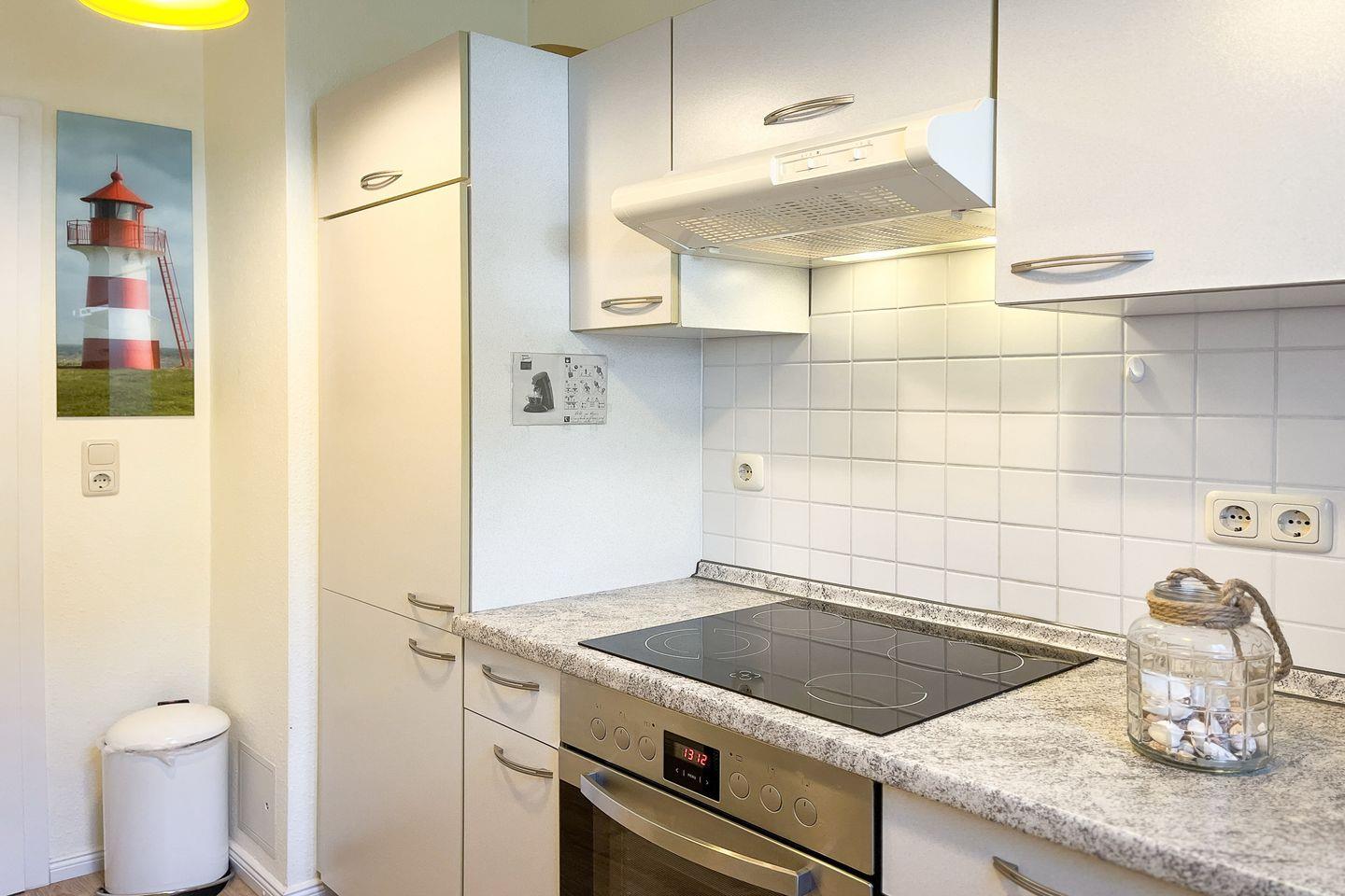 Die moderne Küche liegt separat und ist gut ausgestattet. Hier findest du neben ausreichend Geschirr für die Zubereitung deiner Mahlzeiten einen Kühlschrank mit Gefrierfach, ein Cerankochfeld, einen Backofen, eine Mikrowelle sowie einen Geschirrspüler.