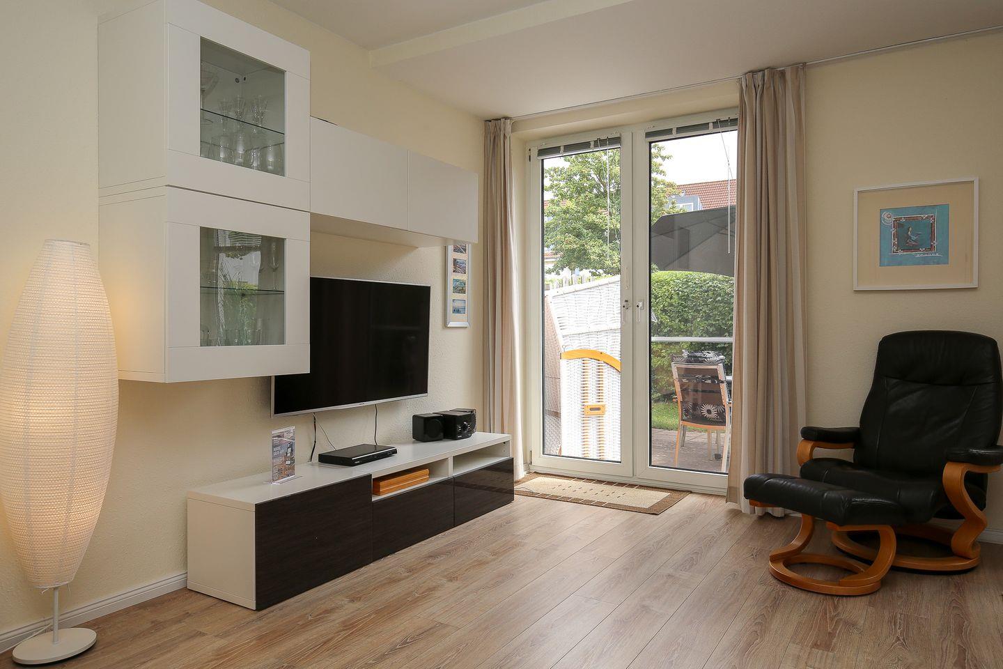 Auf die möblierte, sichtgeschützte Terrasse mit einem großen Sonnenschirm und Strandkorb gelangst du aus dem Wohnbereich. Große Terrassenfenster geben dem Wohn- und Essbereich ein helles und sonniges Raumgefühl. Die Doppelschlafcouch (140 x 200 cm) lässt sich im Handumdrehen in ein bequemes Bett mit echter Matratze verwandeln. Der moderne Essplatz bietet mit einer Bank und zwei Stühlen vier Personen ausreichend Platz. Zur Unterhaltung können ein Flachbild-TV, ein DVD-Player und eine Stereoanlage genutzt werden.