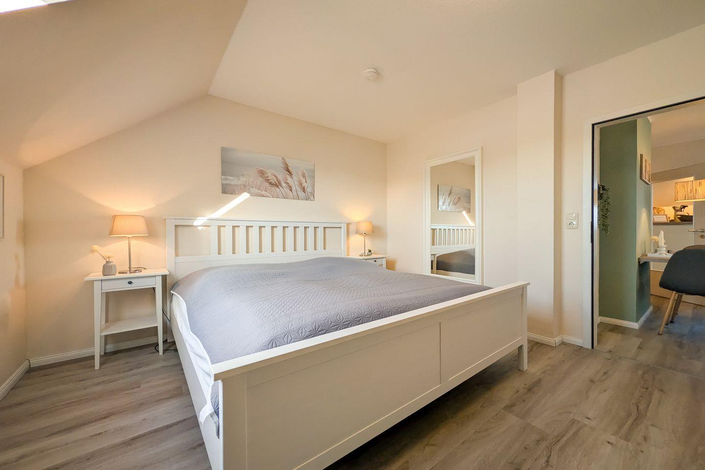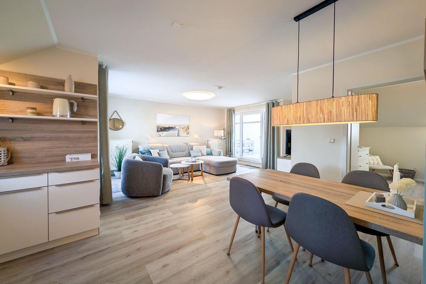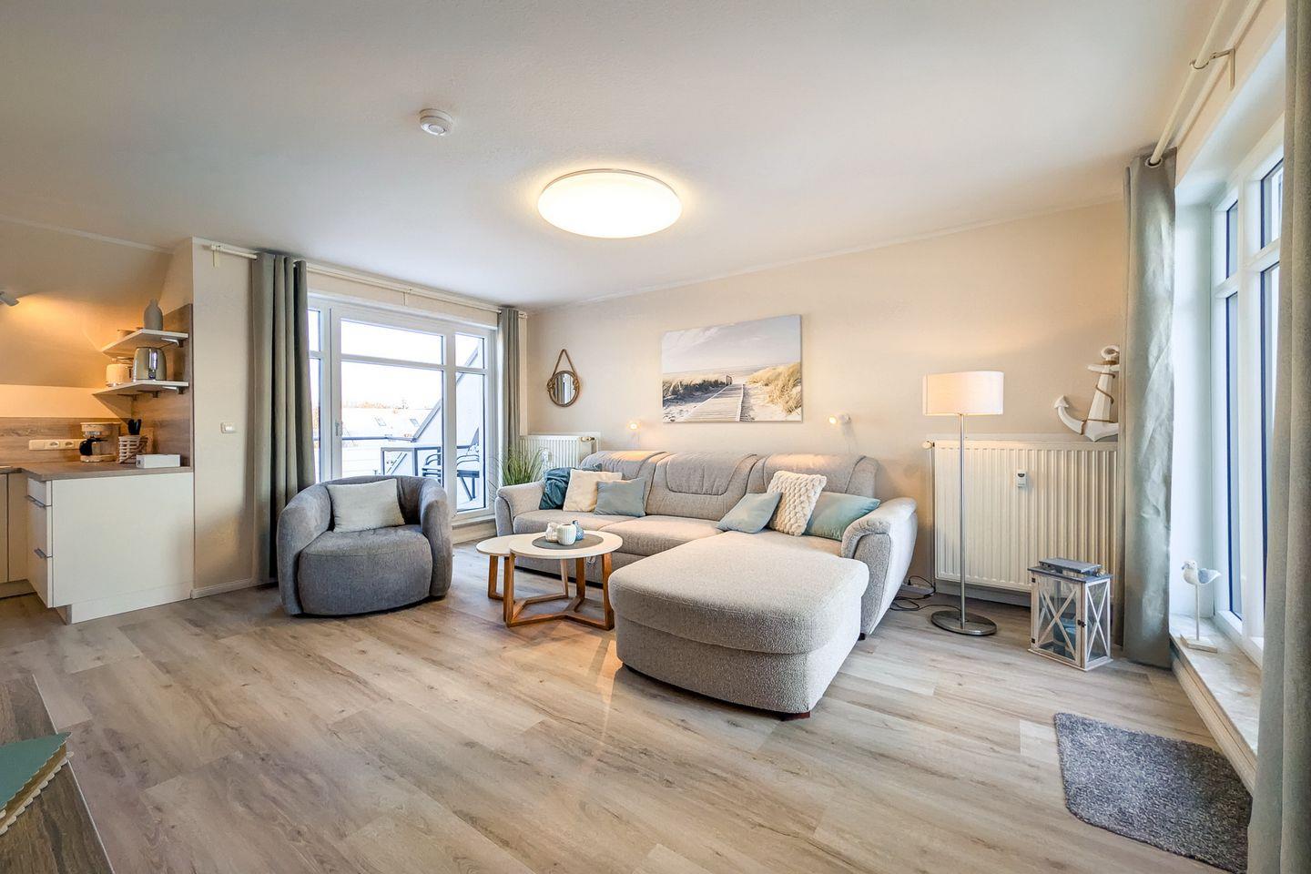 Diese im modernen Stil eingerichtete und exklusive Ferienwohnung liegt im DG und verfügt auf ca. 54 m² über ein Wohnzimmer mit Küchenzeile, ein Schlafzimmer, ein Duschbad und zwei Balkone. Zum Strand sind es nur ca. 100 m.