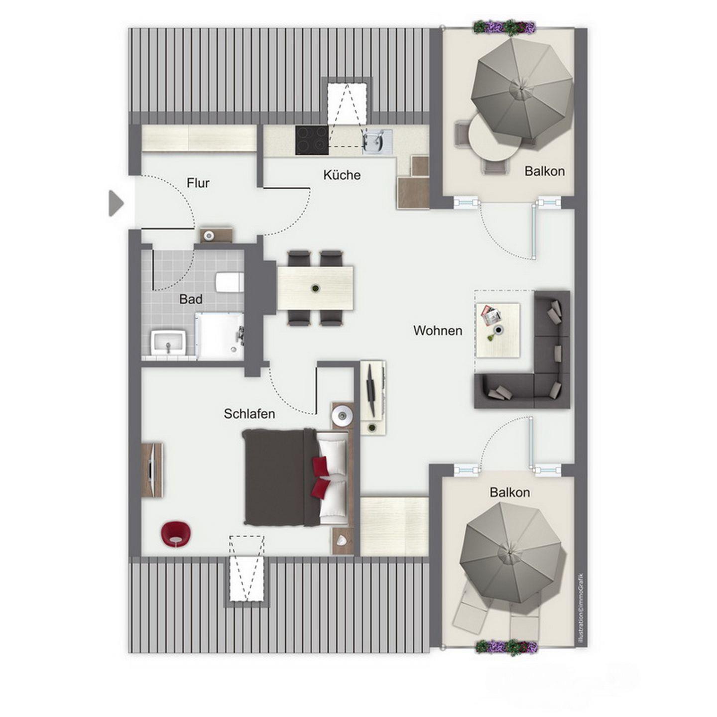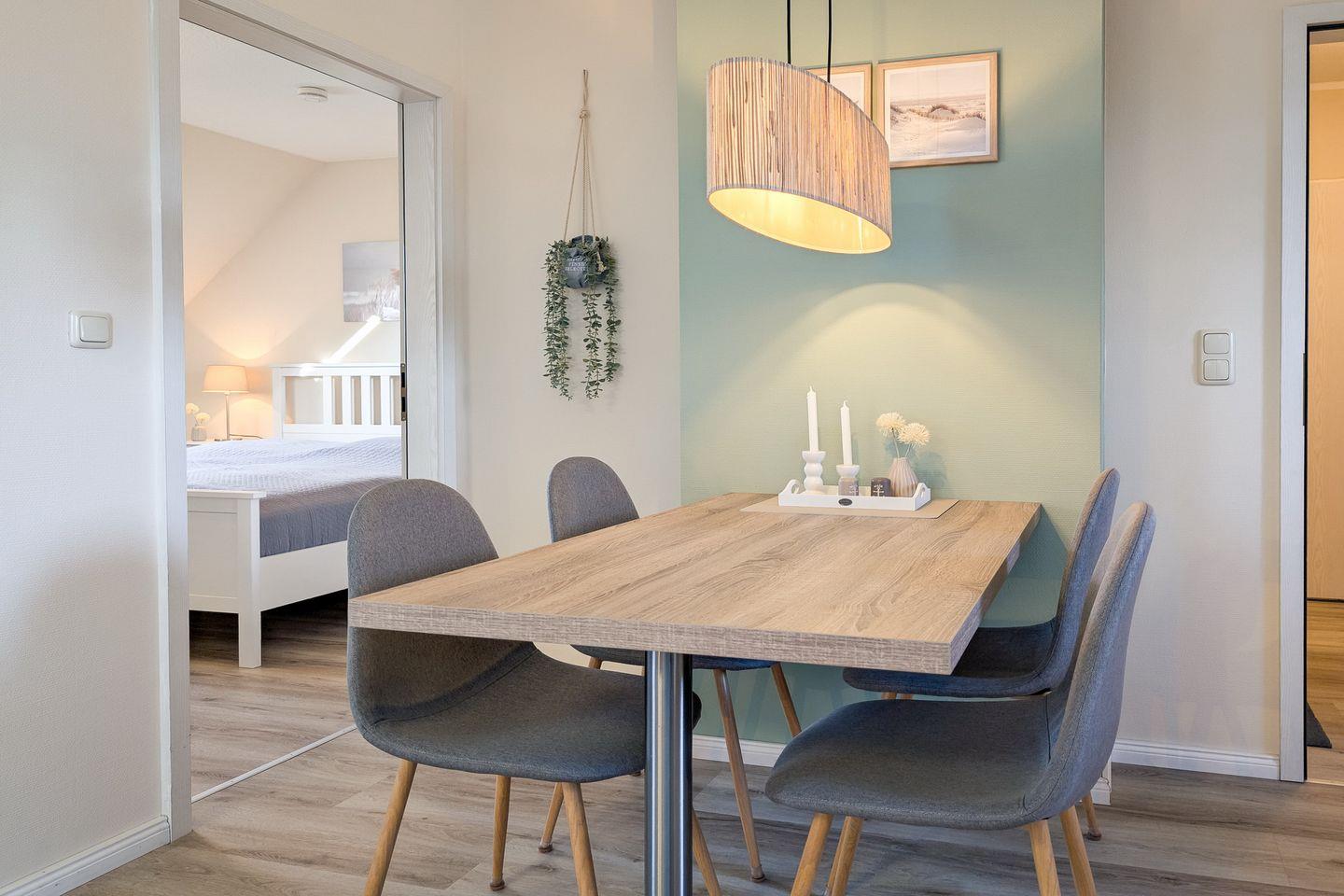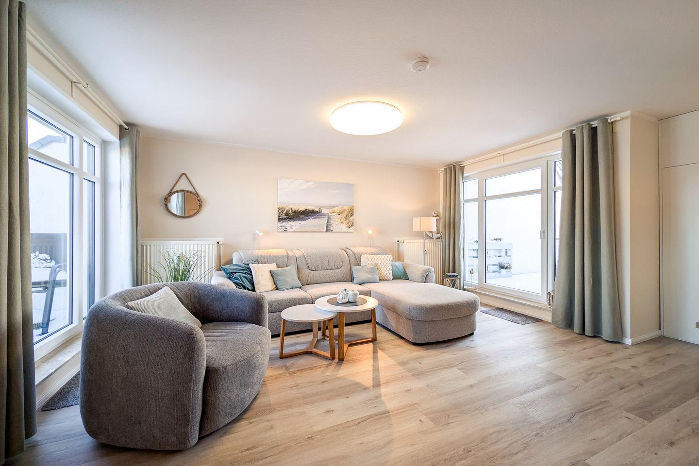 Diese im modernen Stil eingerichtete und exklusive Ferienwohnung liegt im DG und verfügt auf ca. 54 m² über ein Wohnzimmer mit Küchenzeile, ein Schlafzimmer, ein Duschbad und zwei Balkone. Zum Strand sind es nur ca. 100 m.