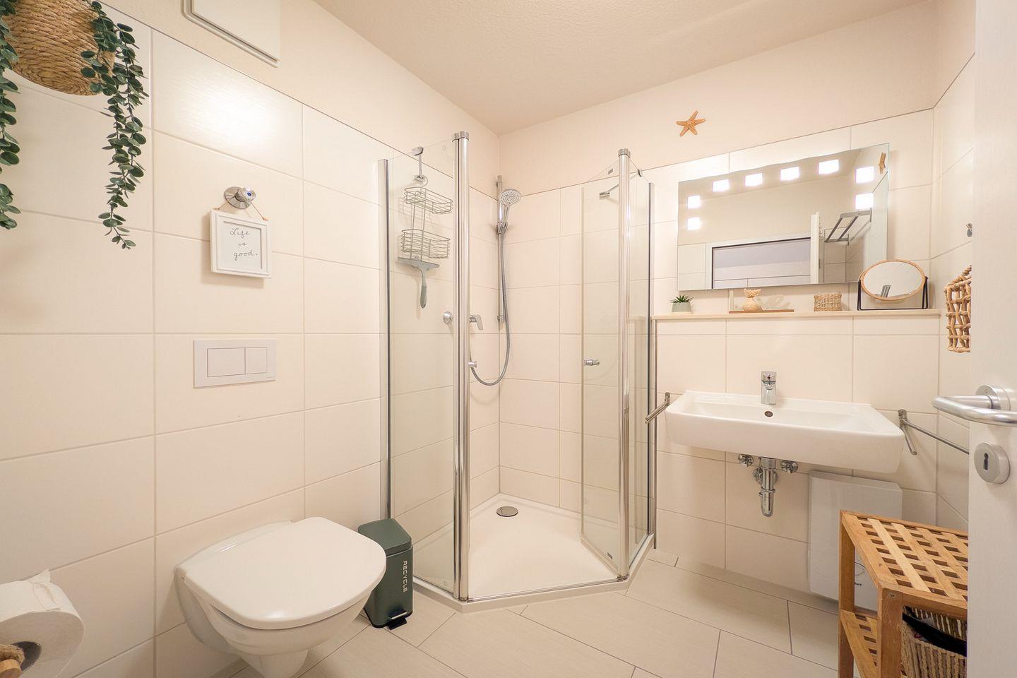 Die Küchenzeile ist voll ausgestattet mit Kühlschrank, einem 4-Platten-Cerankochfeld, Minibackofen und Geschirrspüler. Angrenzend an die Küchenzeile befindet sich ein ansprechender Essplatz – hier kannst du entspannt dinieren. Selbstverständlich ist das funktionale, geflieste Duschbad.