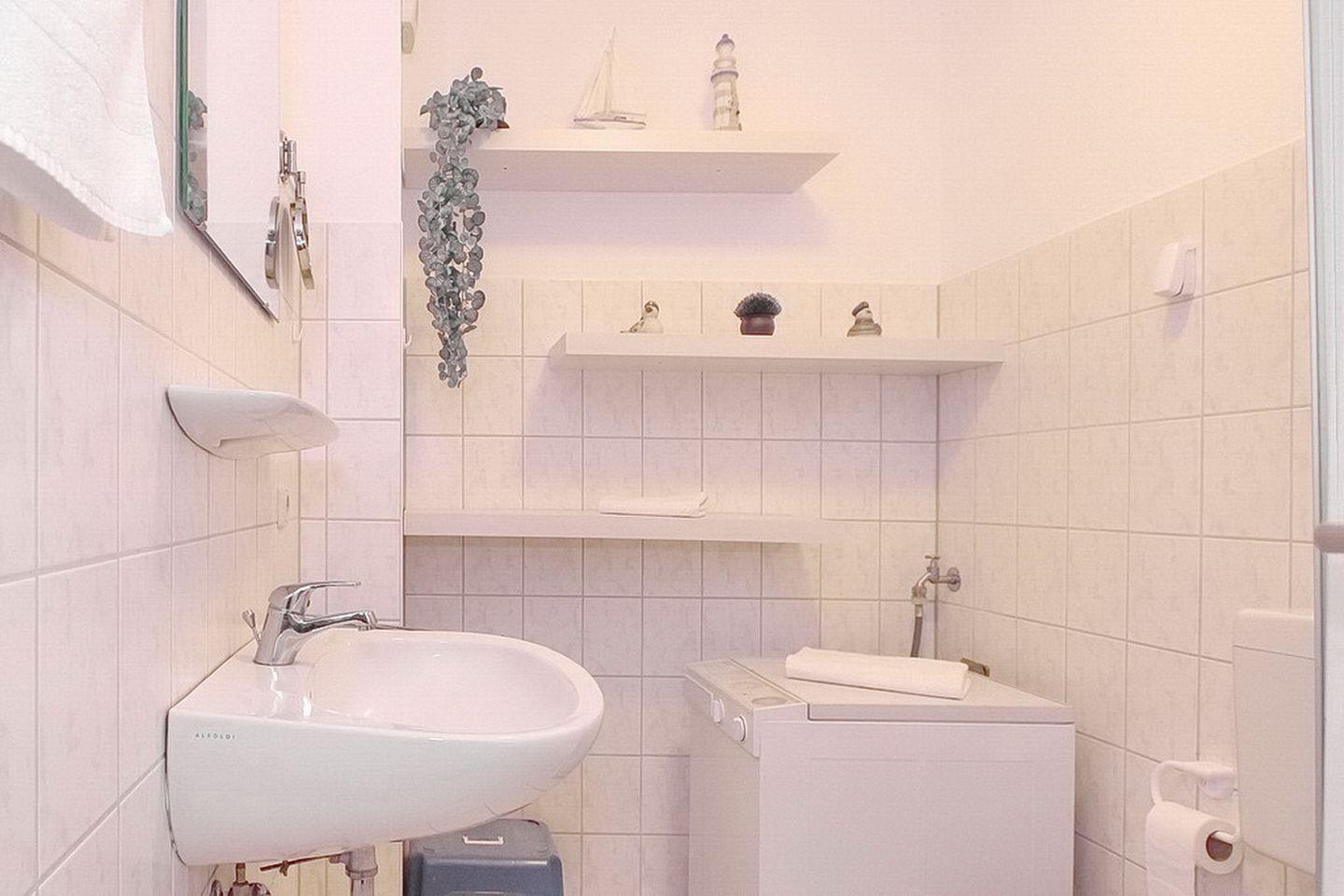 Die Küche ist mit Mikrowelle, 4-Platten-Cerankochfeld, Backofen, Eierkocher, Kühlschrank, Kaffeemaschine, Wasserkocher und Geschirr für vier Personen voll ausgestattet. Das Duschbad verfügt zusätzlich über eine Waschmaschine.
