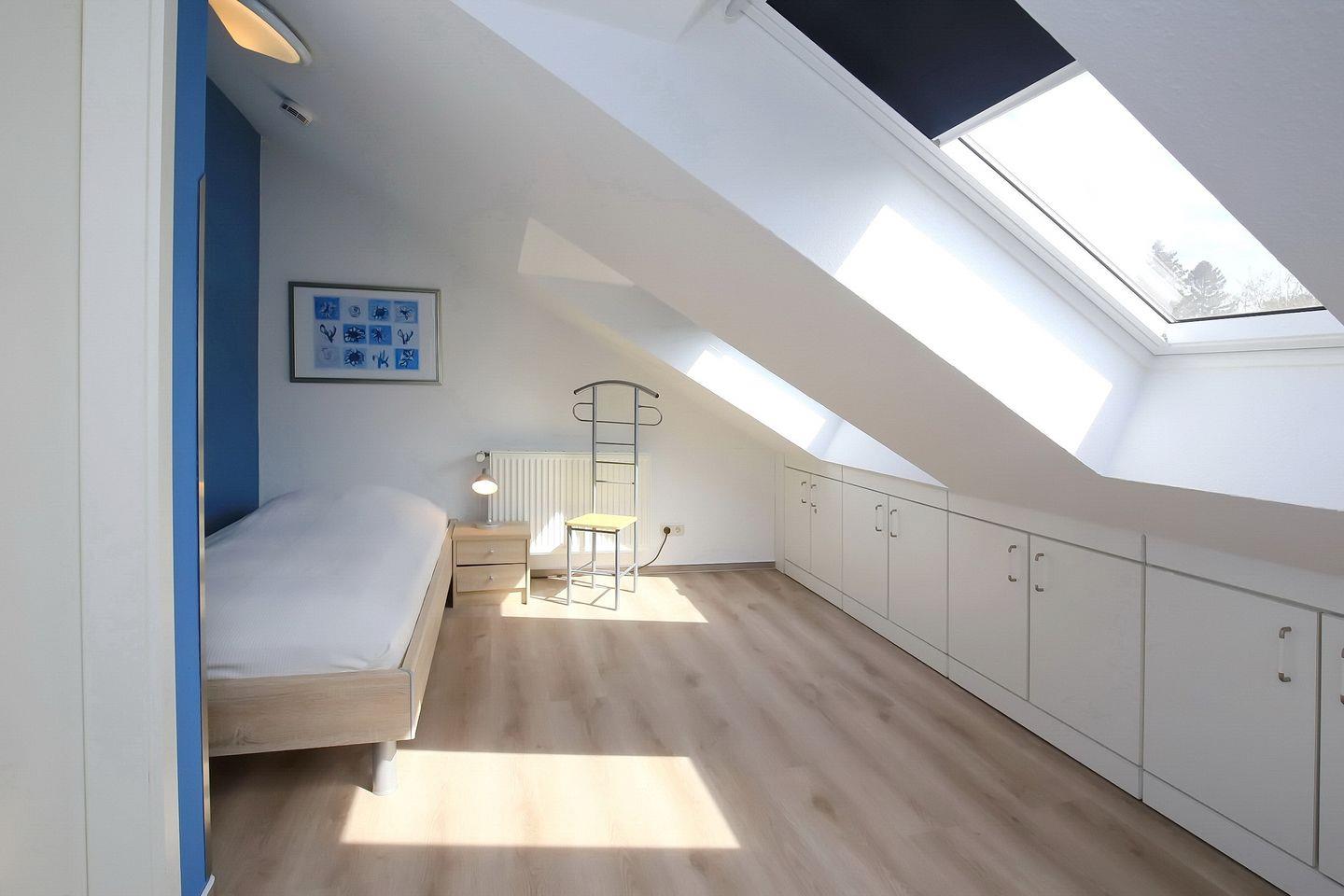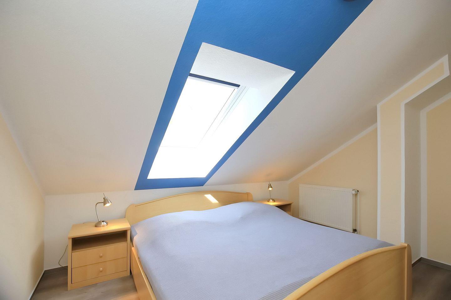 Über die Treppe im Flur gelangst du ins Obergeschoss des Ferienhauses zu den beiden Schlafzimmern. Ein Schlafzimmer ist mit einem Doppelbett