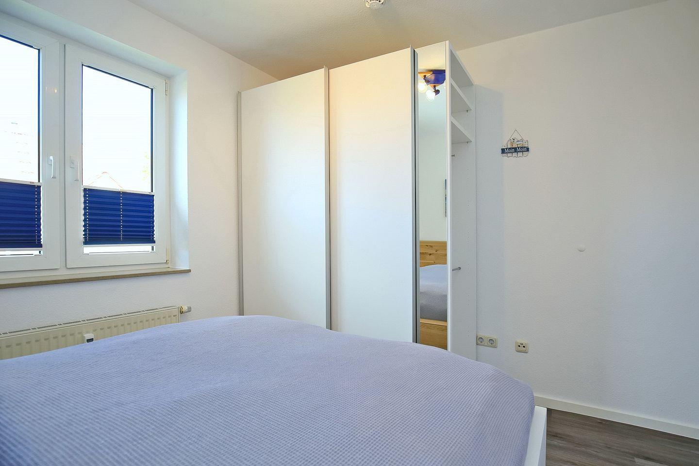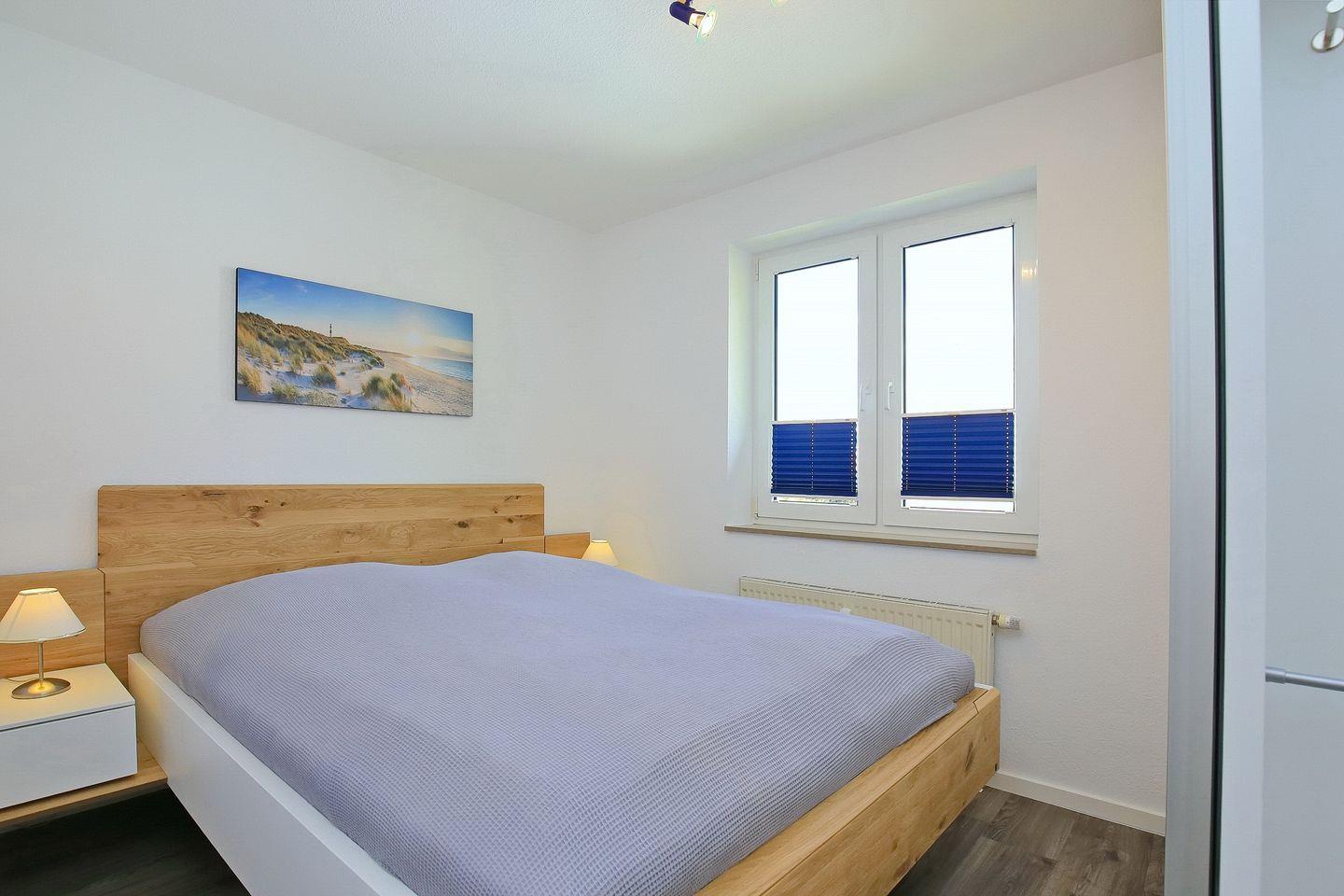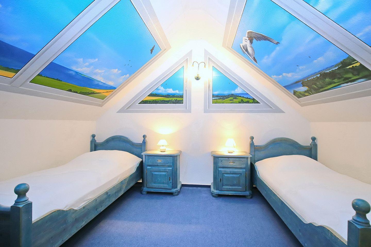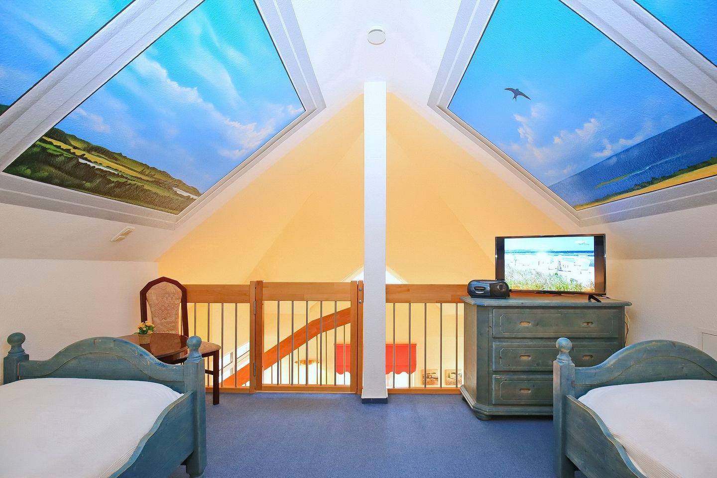 Eine Treppe führt vom Wohnraum aus in die offene, im maritimen Stil gestaltete Schlafgalerie mit zwei Einzelbetten (90 x 180 cm) und einem zweiten Flatscreen-TV. Die Fenster im Spitzboden sind nur als Dekobilder vorhanden. Des Weiteren verfügt die Ferienwohnung über ein Schlafzimmer mit Doppelbett (2 x 90 x 200 cm). Auch ein Tageslichtbadezimmer ist vorhanden. Als Sichtschutz dienen hier Plissees, ein Rollo sowie Vorhänge. Die Böden sind mit Parkett, Teppich und auch Fliesen ausgelegt.