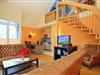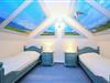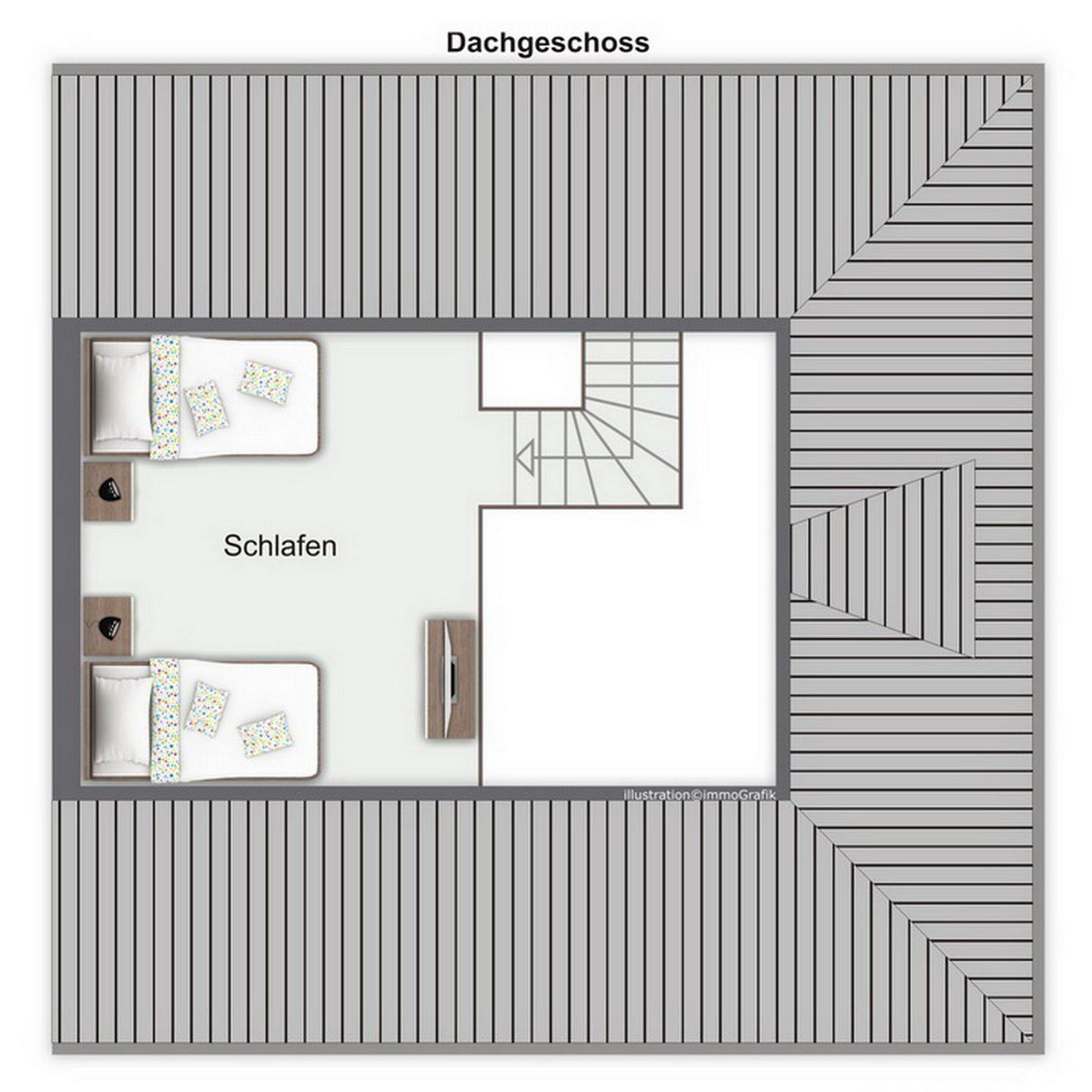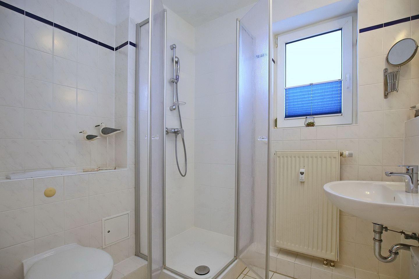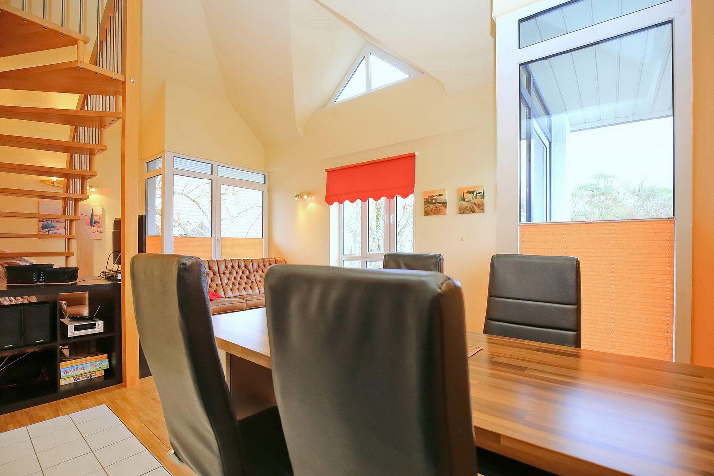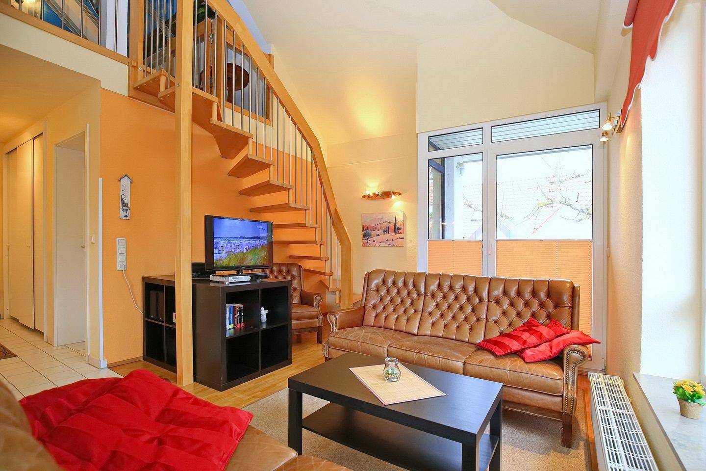 Eine Treppe führt vom Wohnraum aus in die offene, im maritimen Stil gestaltete Schlafgalerie mit zwei Einzelbetten (90 x 180 cm) und einem zweiten Flatscreen-TV. Die Fenster im Spitzboden sind nur als Dekobilder vorhanden. Des Weiteren verfügt die Ferienwohnung über ein Schlafzimmer mit Doppelbett (2 x 90 x 200 cm). Auch ein Tageslichtbadezimmer ist vorhanden. Als Sichtschutz dienen hier Plissees, ein Rollo sowie Vorhänge. Die Böden sind mit Parkett, Teppich und auch Fliesen ausgelegt.