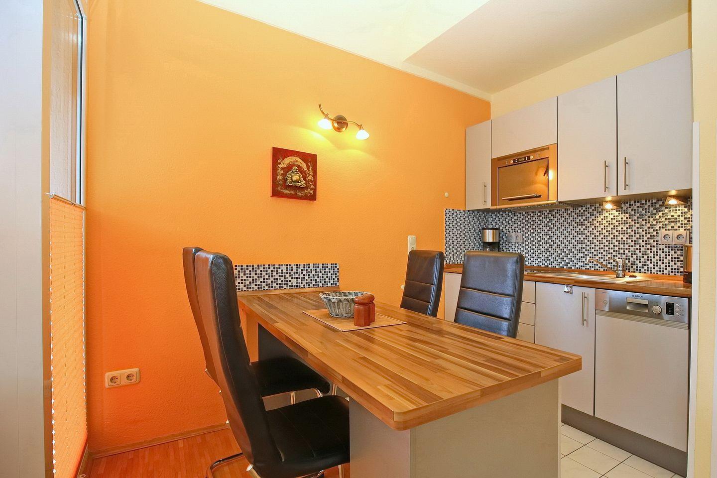 Die in den Wohnraum integrierte Küchenzeile ist mit Kühlschrank mit Gefrierfach, Geschirrspüler, Mikrowelle sowie einem 2-Platten-Cerankochfeld voll ausgestattet. Vor der Küchenzeile befindet sich der gemütliche Essplatz für 4 Personen.