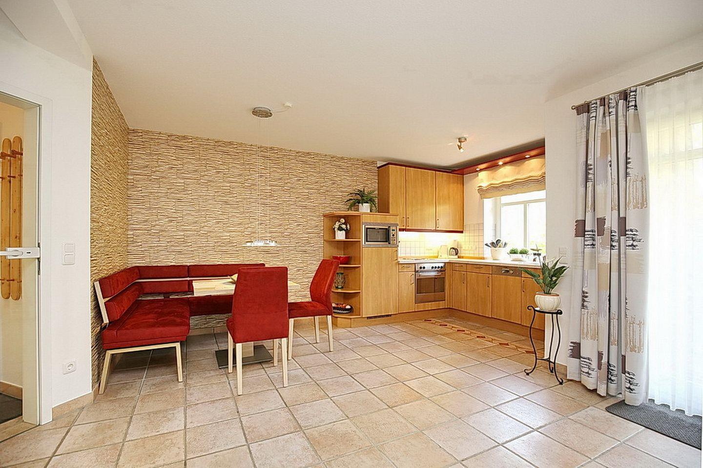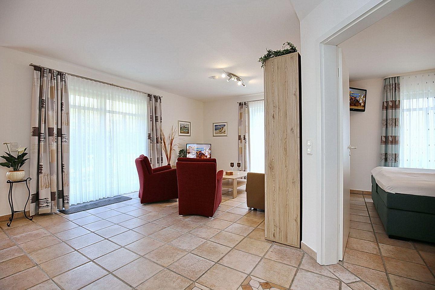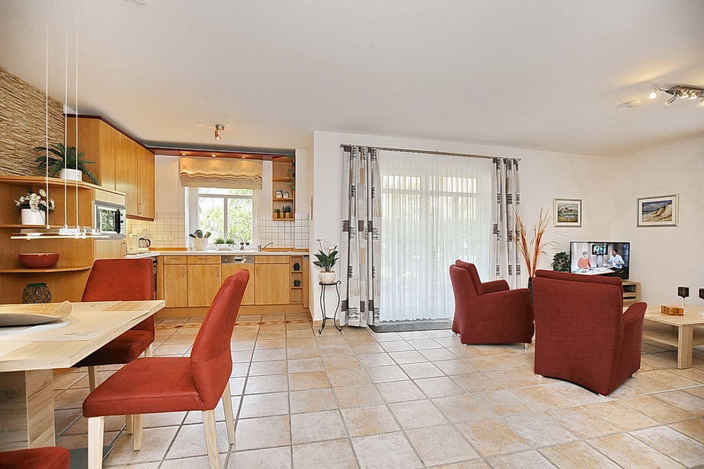 Die Ferienwohnung Nr. 13 liegt im Erdgeschoss und verfügt auf ca. 53 m² über eine Terrasse, auf der du die Nachmittagssonne genießen kannst, ein Wohnzimmer mit Küchenzeile, ein Schlafzimmer sowie ein Duschbad. Die Entfernung zum Strand beträgt ca. 100 Meter.