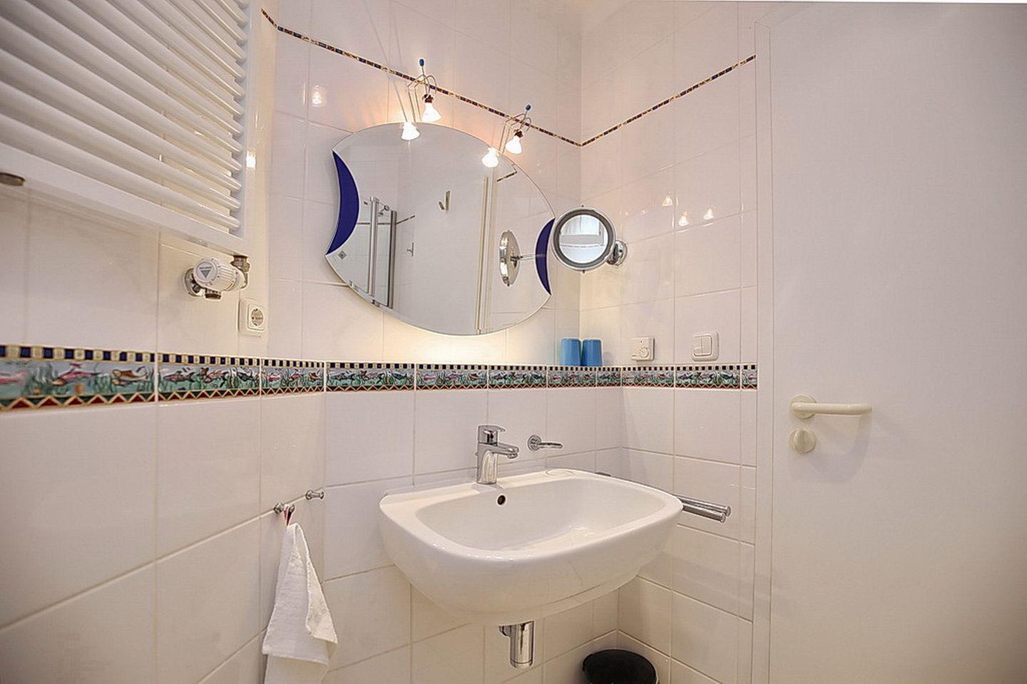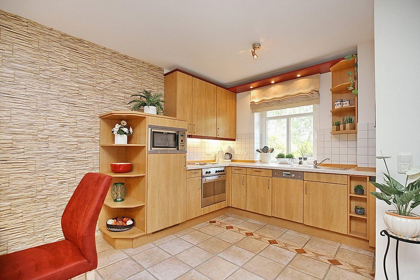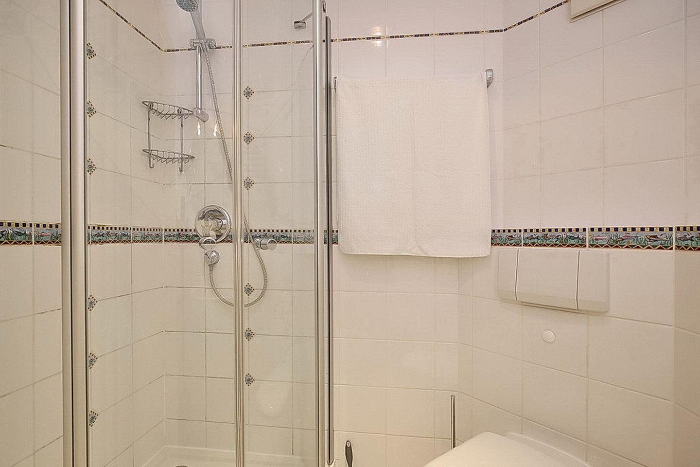 Hochwertig ist auch die im Wohnzimmer integrierte Küchenzeile. Neben reichlich Geschirr, Kühlschrank, einem 4-Platten-Cerankochfeld und Backofen sowie einer Mikrowelle findest du außerdem einen Geschirrspüler vor. Selbstverständlich gehört auch ein Duschbad zur Wohnung.