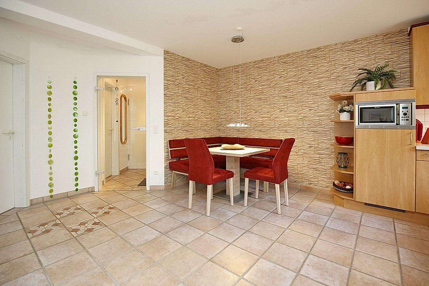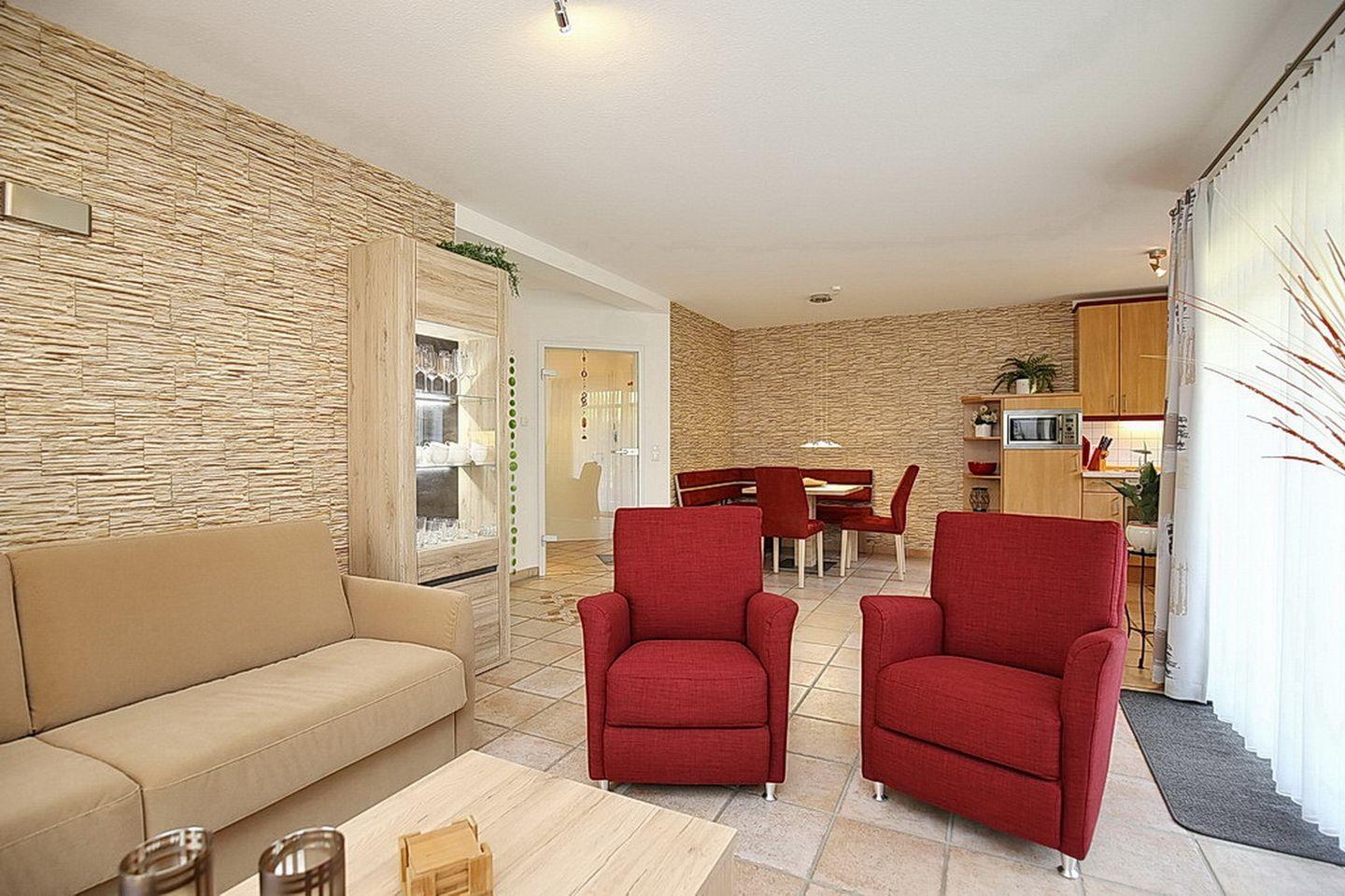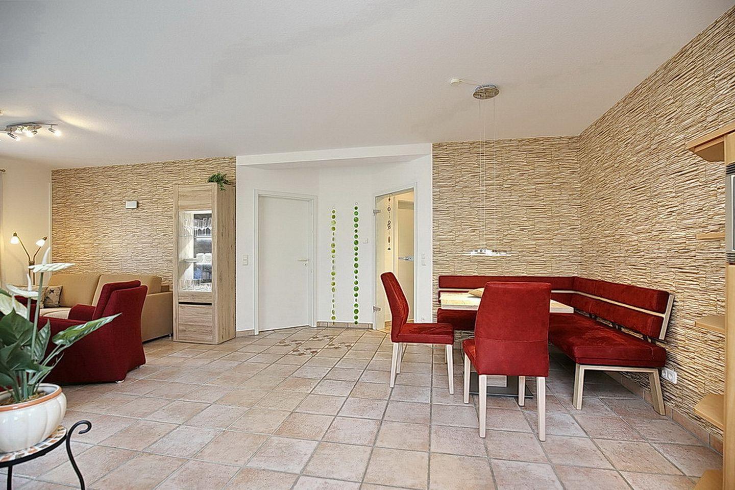 Das Wohn-, Esszimmer mit Fußbodenheizung ist mit Fliesen ausgelegt und verfügt selbstverständlich über einen TV/Flatscreen und eine Stereoanlage. Hier findest du auch eine Doppelschlafcouch (160 x 200 cm).