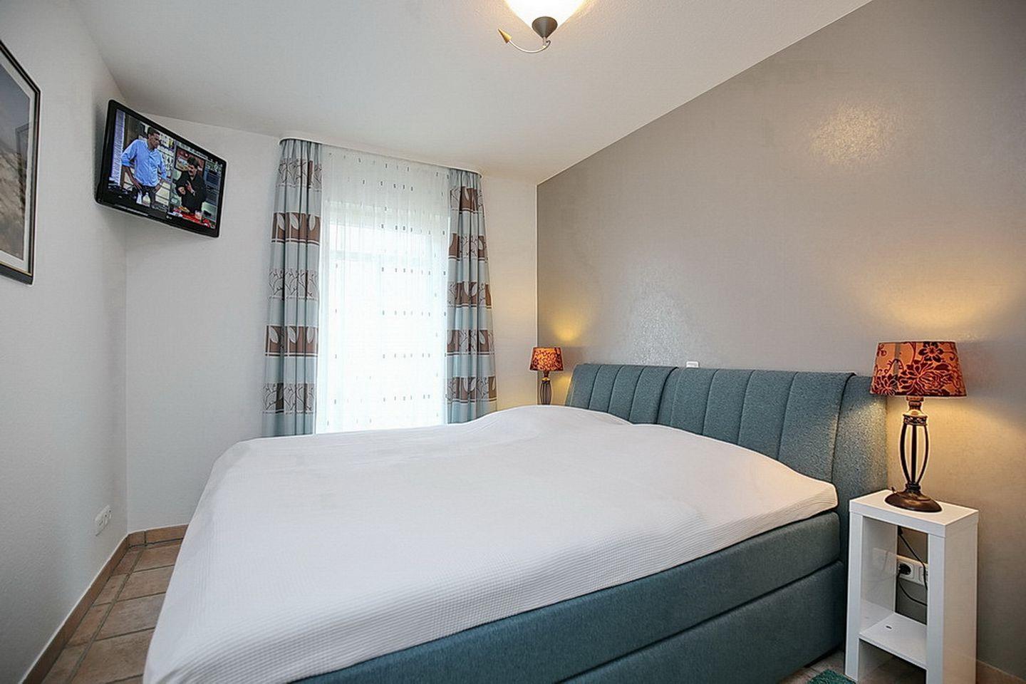 Im Schlafzimmer verspricht das komfortable Boxspringbett (180 x 200 cm) erholsamen Schlaf. Viel Stauraum für deine Urlaubsgarderobe bietet der 2-türige Kleiderschrank. Auch ein zweiter Flachbild-Fernseher befindet sich hier. Vorhänge befinden sich an den Fenstern. Der Boden ist gefliest.