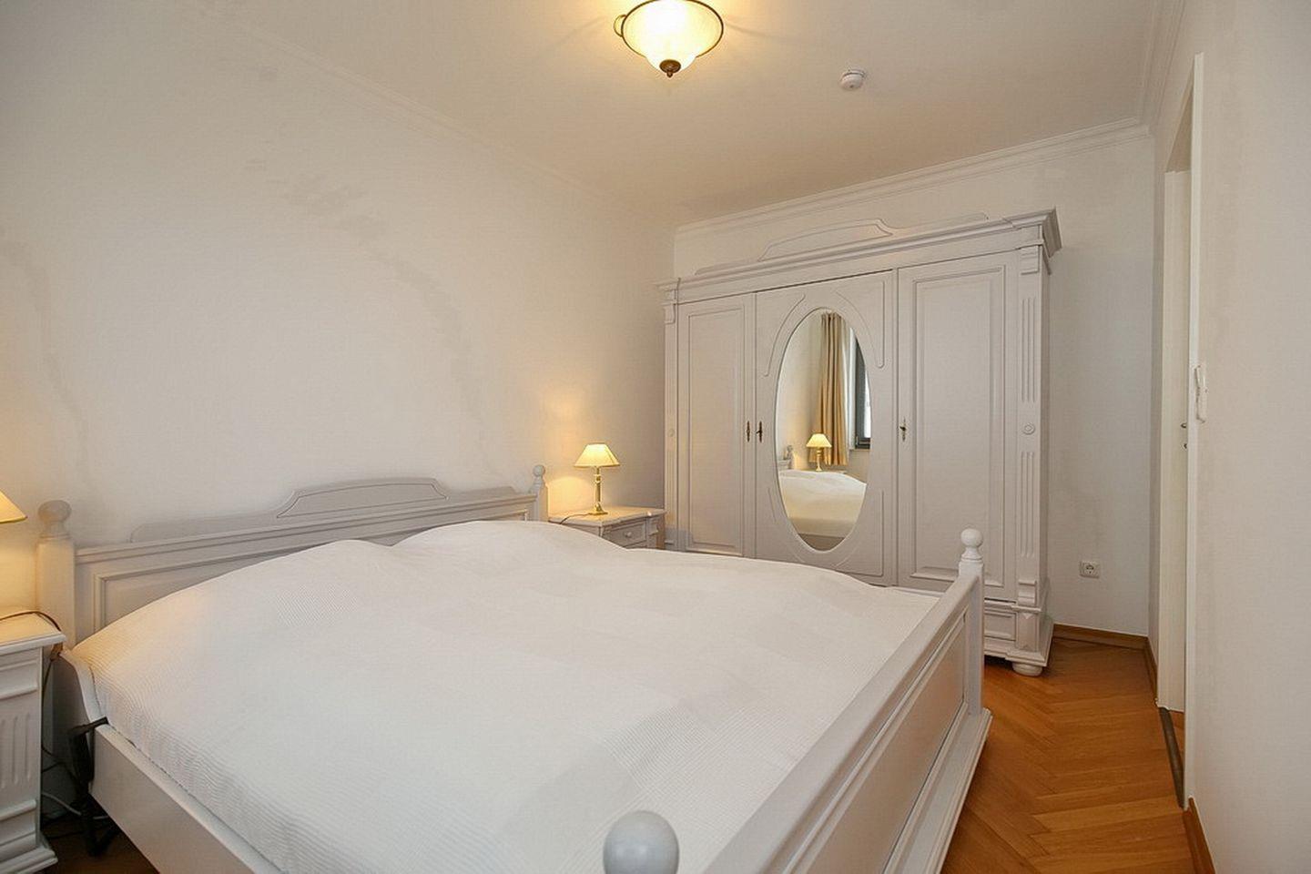 In dem ebenfalls mit Parkett ausgelegten Schlafzimmer lädt das Doppelbett (2 x 90 x 200 cm) mit verstellbarem Kopfteil zum Träumen ein. Der große Kleiderschrank bietet viel Stauraum für deine Urlaubsgarderobe. Jalousien und Vorhänge dienen zur Verdunkelung.