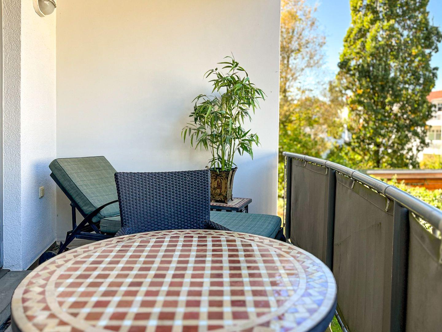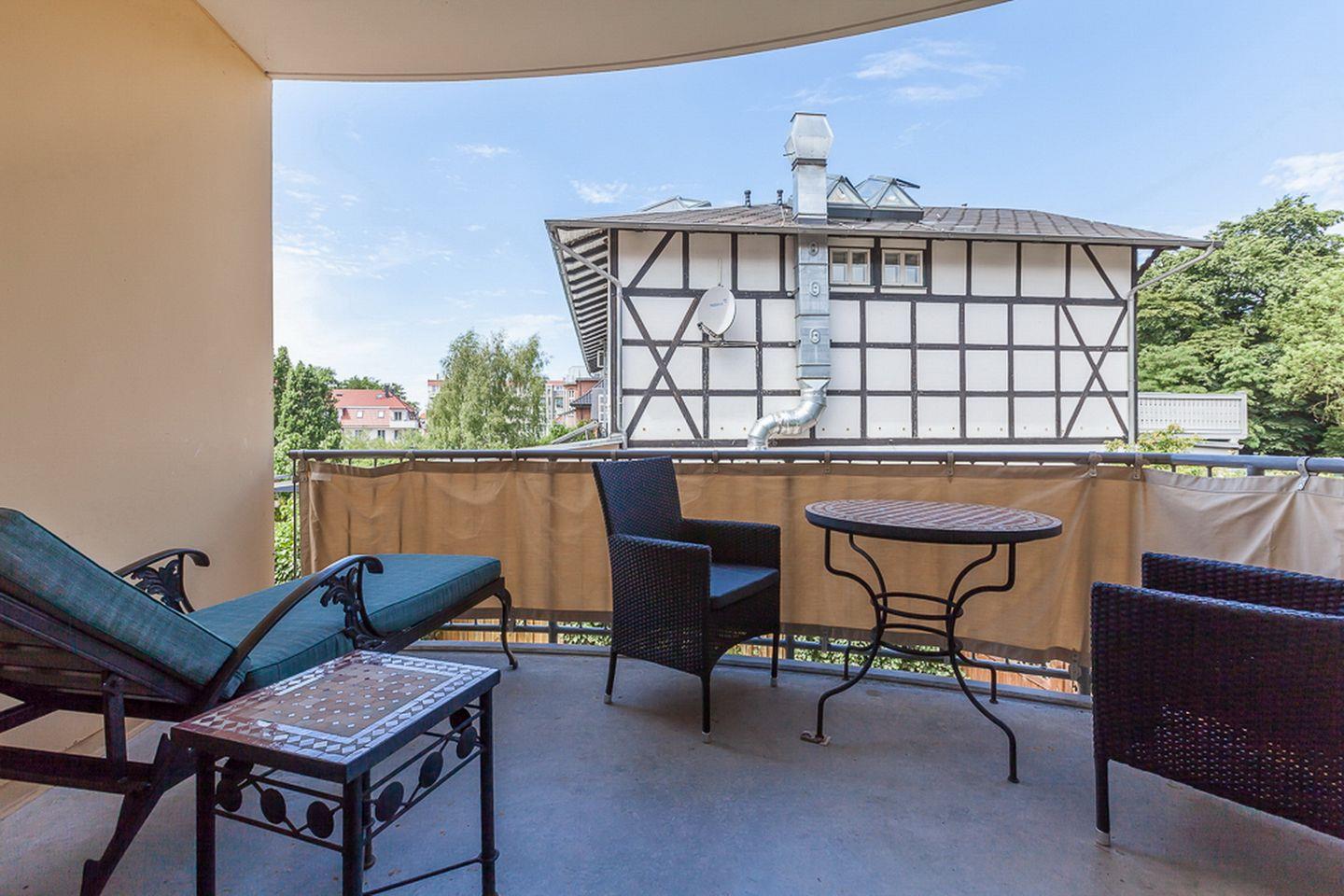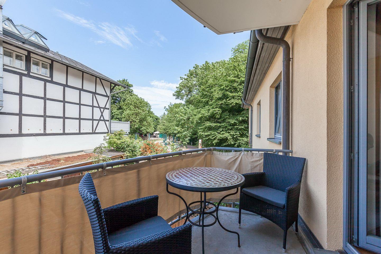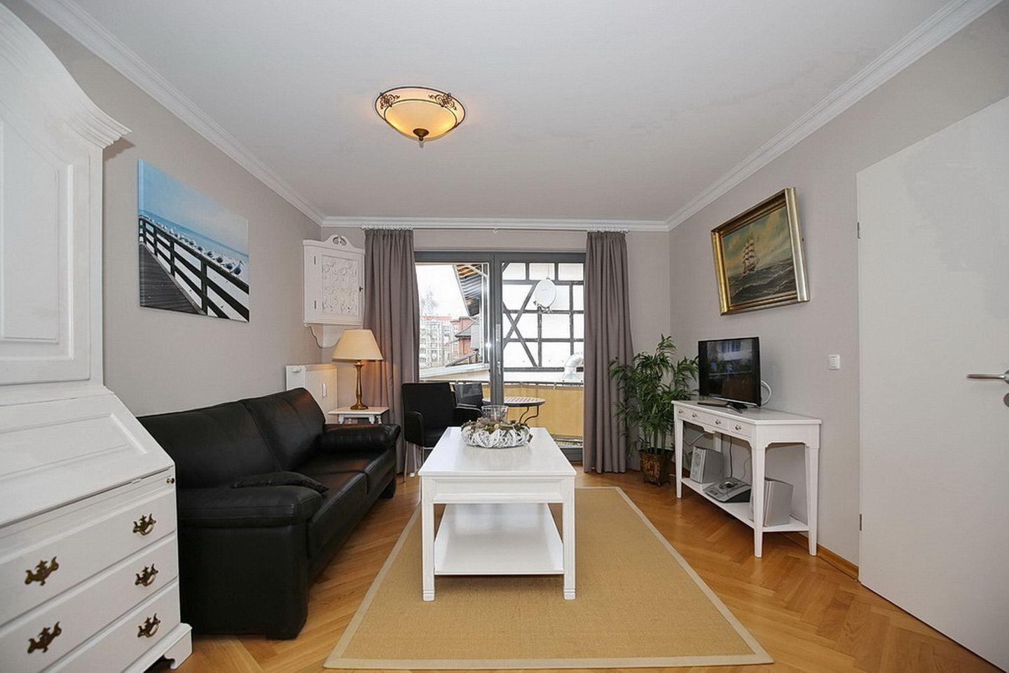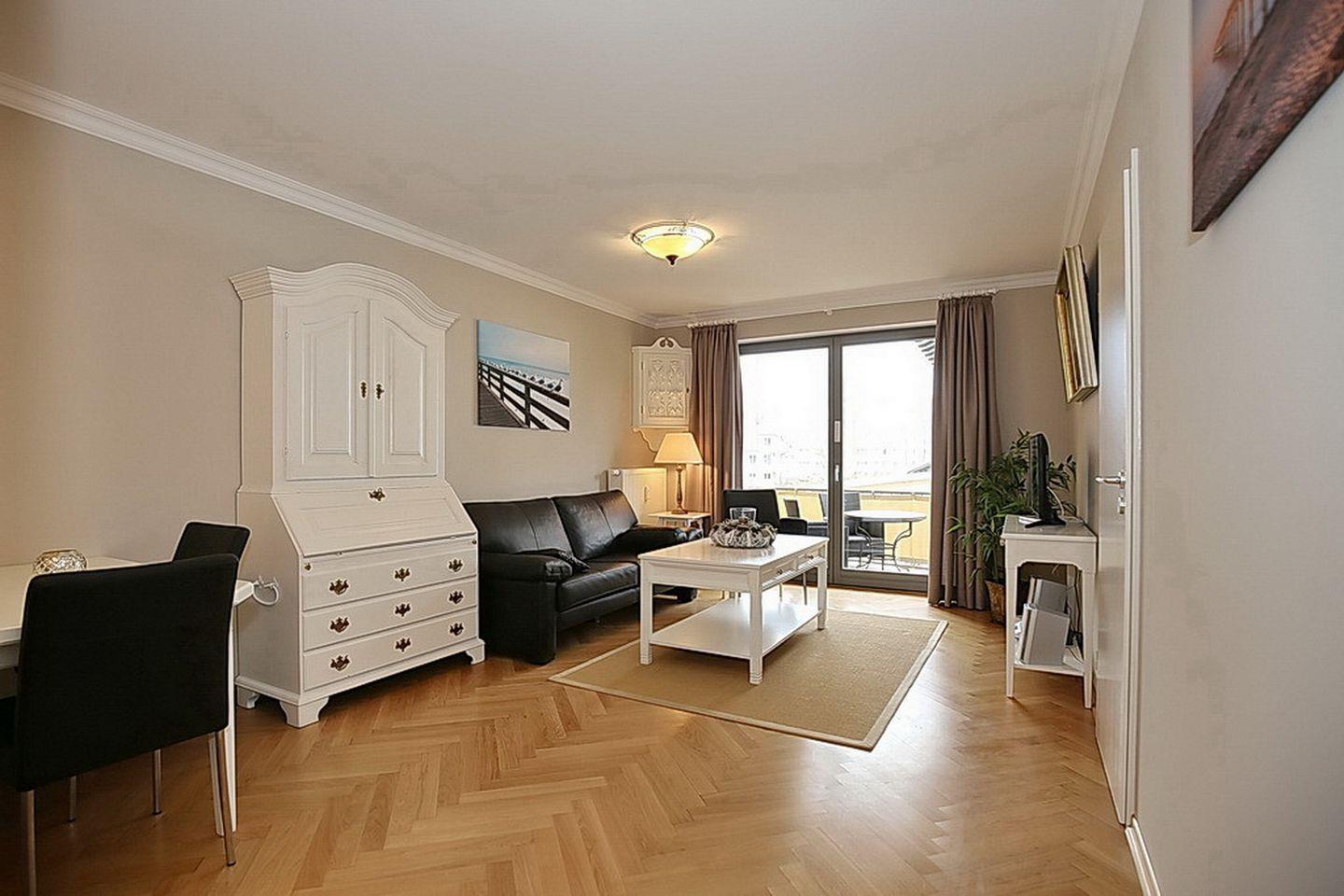Das stilvoll eingerichtete Wohnzimmer ist mit Parkett ausgelegt und verfügt über eine bequeme Sitzecke mit TV-Flatscreen und Radio. Vom Wohnzimmer aus gelangst du auf den mit zwei Stühlen, Tisch und einer bequemen Liege ausgestatteten West-Balkon und kannst hier gemütlich frühstücken oder einfach nur die Ostseeluft genießen.