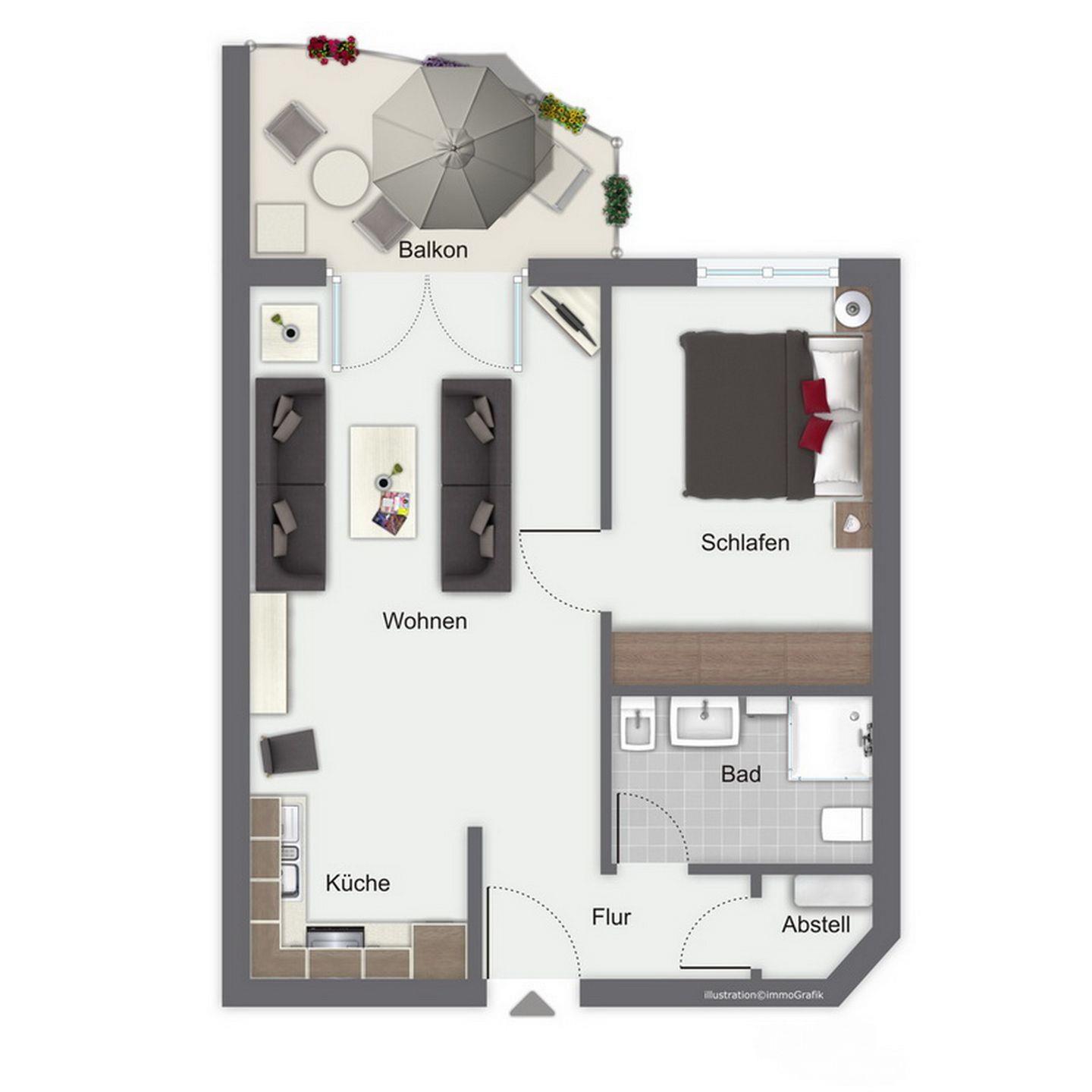 Die integrierte Küchenzeile ist gefliest und komplett ausgestattet. Ein 4-Platten-Cerankochfeld mit Backofen, Kühlschrank mit Gefrierfach, ausreichend Küchenutensilien und Geschirr stehen dir zur Verfügung.