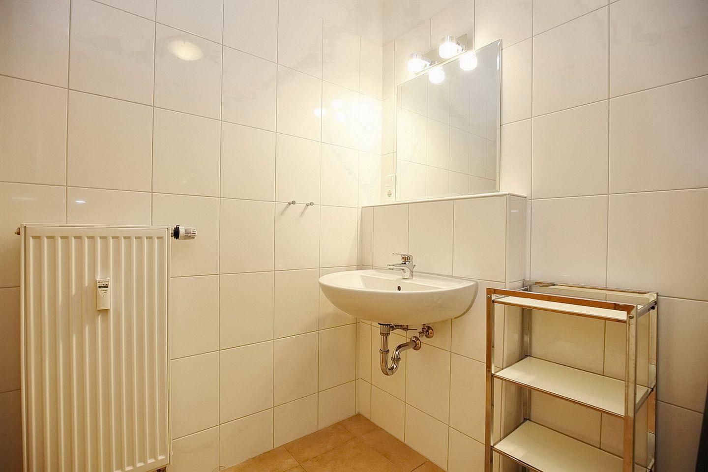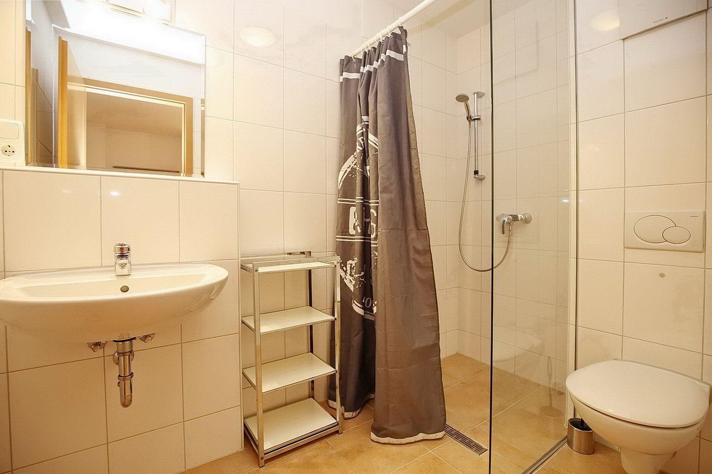 Im funktionellen Bad findest du eine bodengleiche Dusche. Ein kleines Badregal bietet Ablageplatz für die wichtigsten Utensilien.