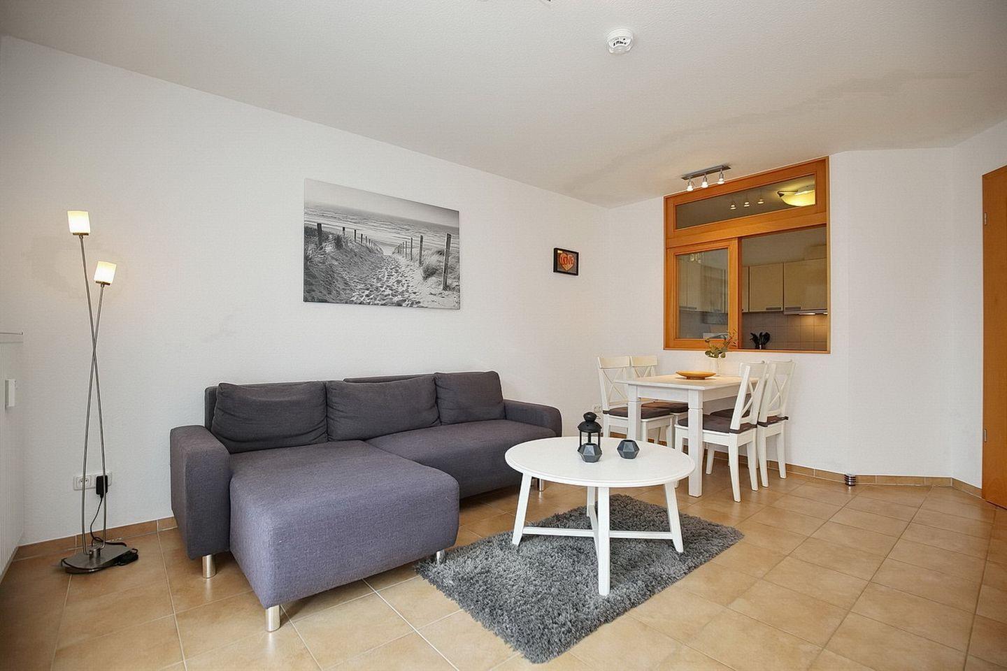 Der Wohnbereich ist hell und mit modernen Möbeln eingerichtet. Hier lädt die gemütliche Couch zum Verweilen ein. Es stehen dir Flachbild-TV und eine Stereoanlage zur Verfügung. Die Couch (130 x 190 cm) kann durch Ausklappen in einen Komfortschlafplatz für eine Person verwandelt werden. In der Ferienwohnung steht unseren Gästen kostenlos WLAN (ohne Gewähr) zur Verfügung.
