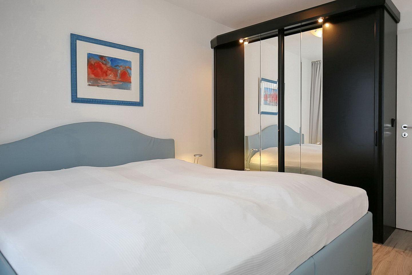 Das Schlafzimmer dieser Ferienwohnung verfügt über ein Doppelbett (2 x 90 x 200 cm) und einen Kleiderschrank mit viel Stauraum. Die Matratzen wurden im Mai 2022 erneuert. Vorhänge sind im Schlafzimmer vorhanden. Für die kleinen Gäste steht ein Kinderreisebett (ohne Matratze und Bettzeug) zur Verfügung. Der Bodenbelag im Schlafzimmer ist Design Belag. Die Ferienwohnung ist eine Nichtraucherwohnung. Haustiere sind hier nicht gestattet.
