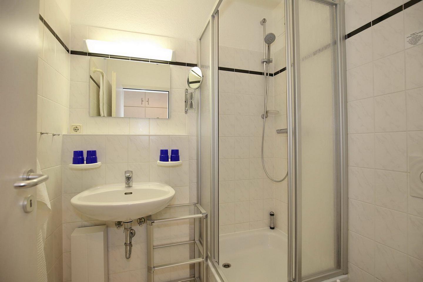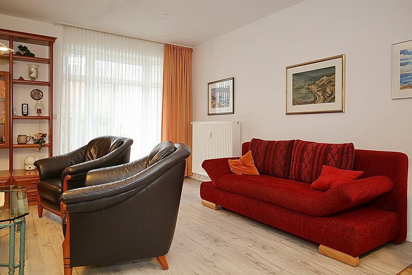 In dieser Erdgeschoss-Ferienwohnung mit einer Größe von ca. 50 m² findest du ein helles Wohnzimmer mit Küchenzeile und Zugang zur Nord-Terrasse, ein Schlafzimmer und ein gefliestes Duschbad. Zum Strand sind es nur ca. 100 Meter.