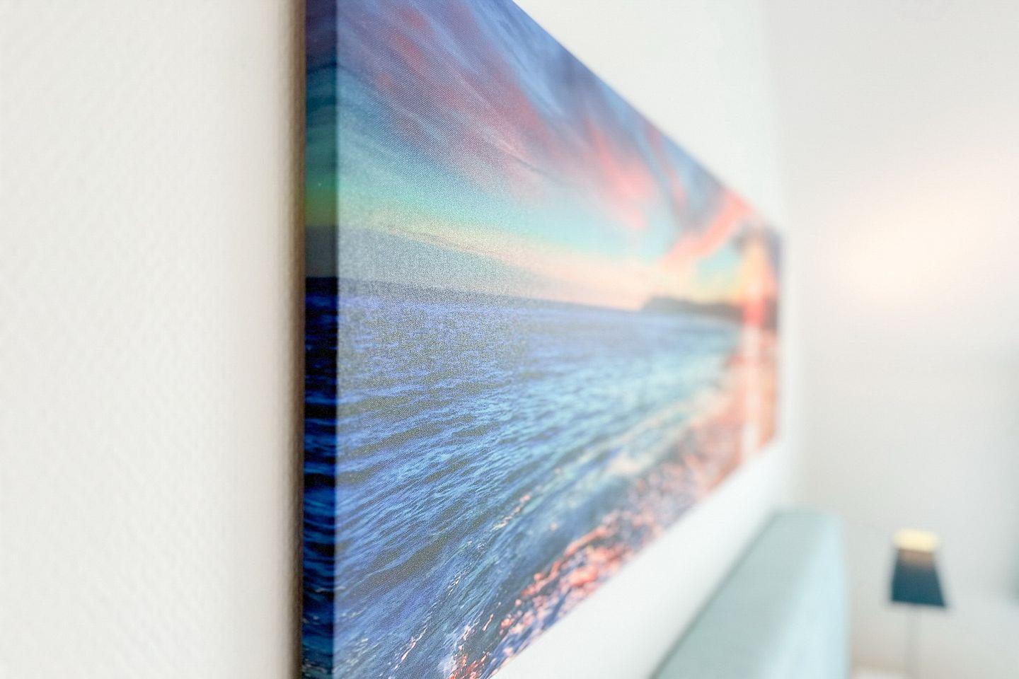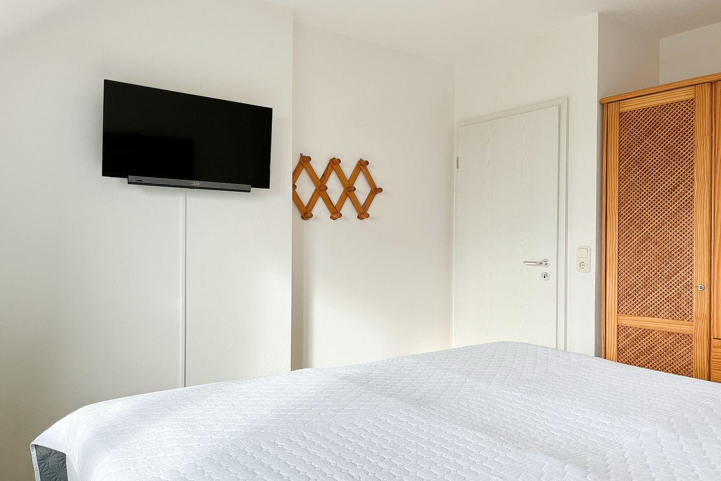 Das Schlafzimmer verfügt über ein Boxspringbett (2x 90 x 200 cm) und einen Kleiderschrank mit viel Stauraum. Außerdem findest du im Schlafzimmer einen weiteren Flachbildfernseher vor. Die Wohnung ist mit Laminat ausgelegt. Vorhänge dienen als Sichtschutz.