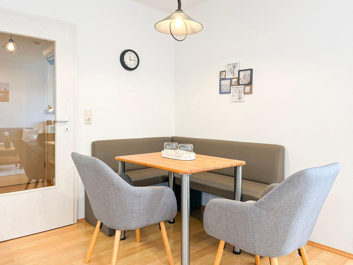 Der Wohnbereich ist hell und modern eingerichtet. Hier lädt die gemütliche Couch zum Verweilen ein. Es stehen dir ein Flachbild-TV und eine Stereoanlage zur Verfügung. Zusätzlich lassen die zahlreichen Bücher keine Langeweile aufkommen. Die Couch (160 x 200 cm) kann durch Ausklappen in einen Komfortschlafplatz für zwei Personen verwandelt werden. Der moderne Esstisch bietet den idealen Platz für gemeinsame Mahlzeiten. Vom Wohnzimmer aus hast du Zugang zum Süd-Balkon mit Ausblick ins Grüne.