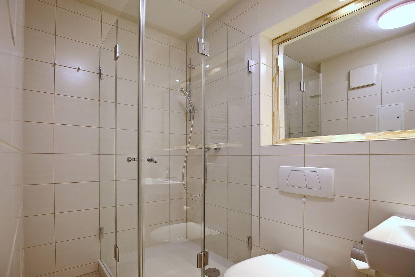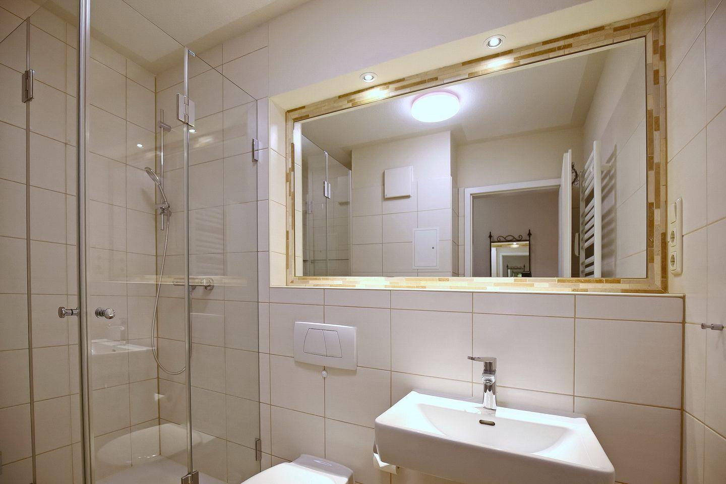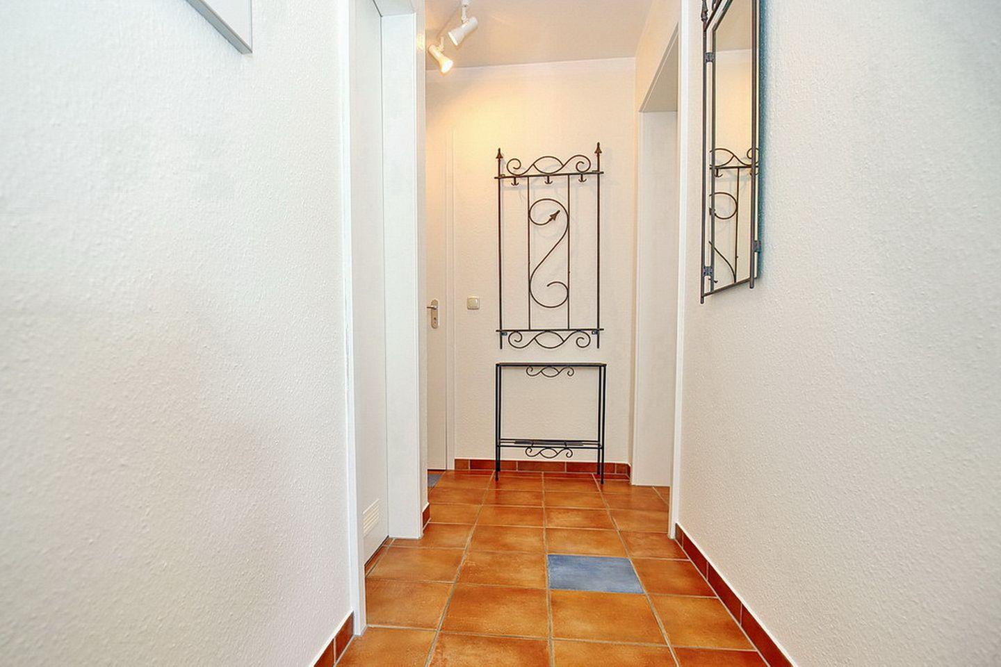 Genießen Sie die Ostseeluft auf der Terrasse! Hier stehen Ihnen Tisch und Stühle mit Auflagen zur Verfügung. Im Flur ist ein Einbauschrank mit Staubsauger, Besen u. a. Reinigungsutensilien und einem Wäscheständer. Ein Teil des Schrankes kann für die Garderobe genutzt werden. Das Duschbad mit Duschkabine, Waschbecken und WC macht die Wohnung komplett.