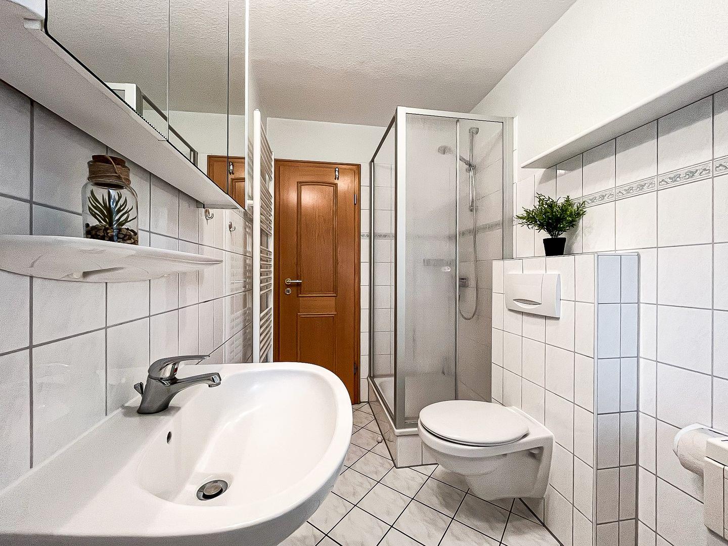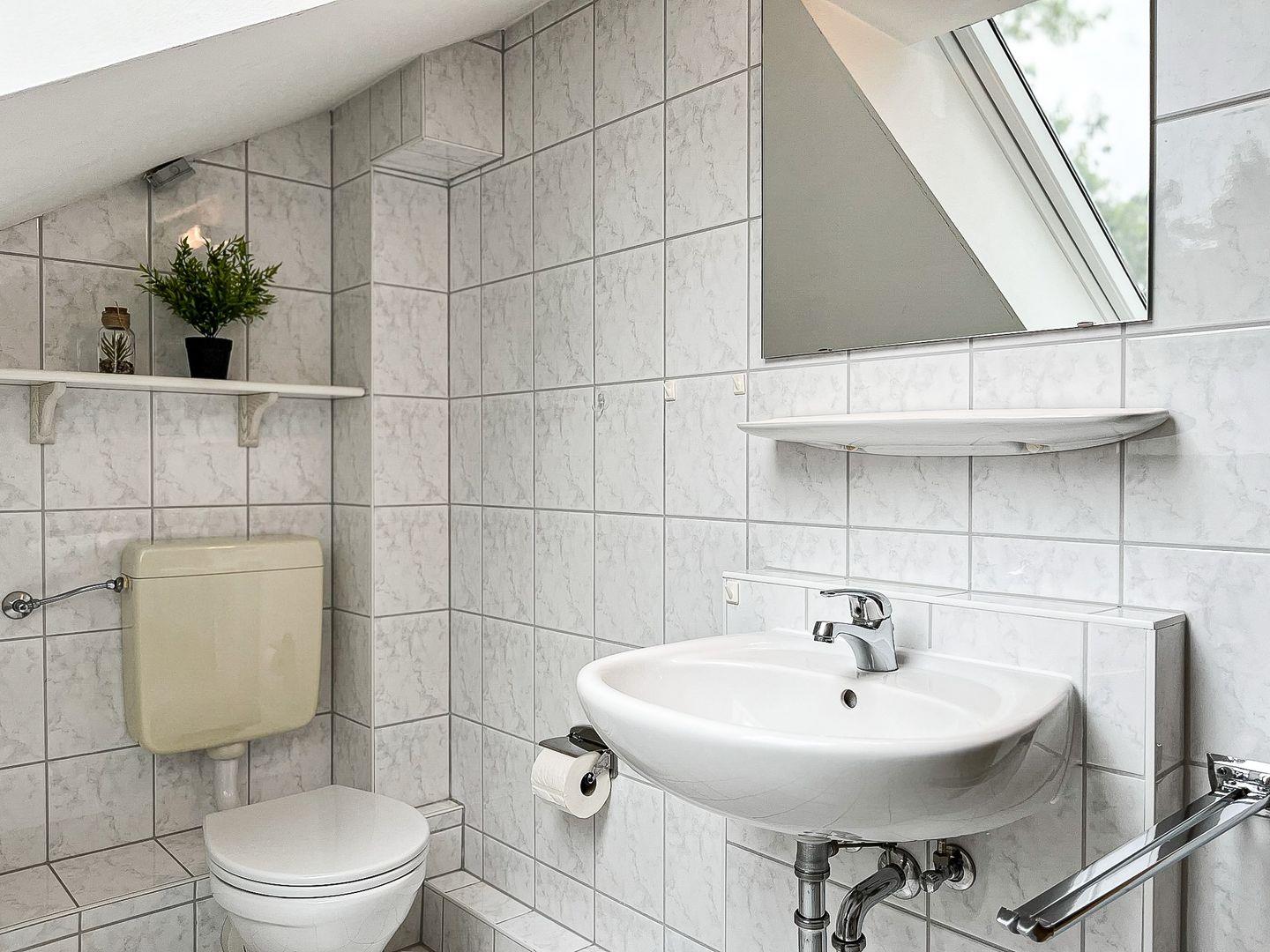 Im Duschbad mit Fenster findest du neben der Dusche auch eine Waschmaschine, die du kostenfrei nutzen darfst. Alle Fußböden in diesem Ferienhaus sind mit Laminat oder Fliesen versehen.