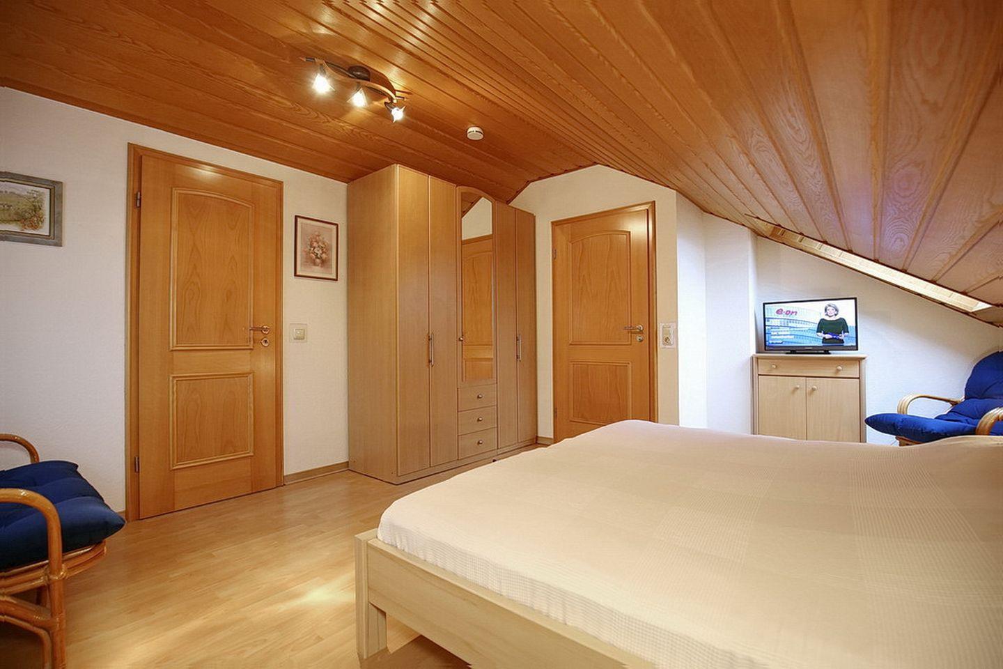 Im Schlafzimmer im Erdgeschoss stehen zwei Einzelbetten (90 x 200 cm) und ein Kleiderschrank. Das Schlafzimmer im 1. Obergeschoss hat ein Doppelbett (2x 90x 200 cm), einen Kleiderschrank und einen 2. TV. Von diesem Schlafzimmer aus erreichst du das Gäste-WC, das zusätzlich Platz für einen Wäschetrockner bietet. Die Fenster der Schlafzimmer lassen sich entweder mit Außenjalousien oder einem Rollo verdunkeln.