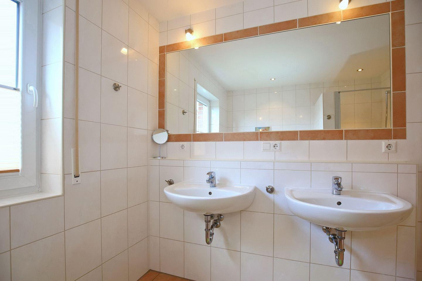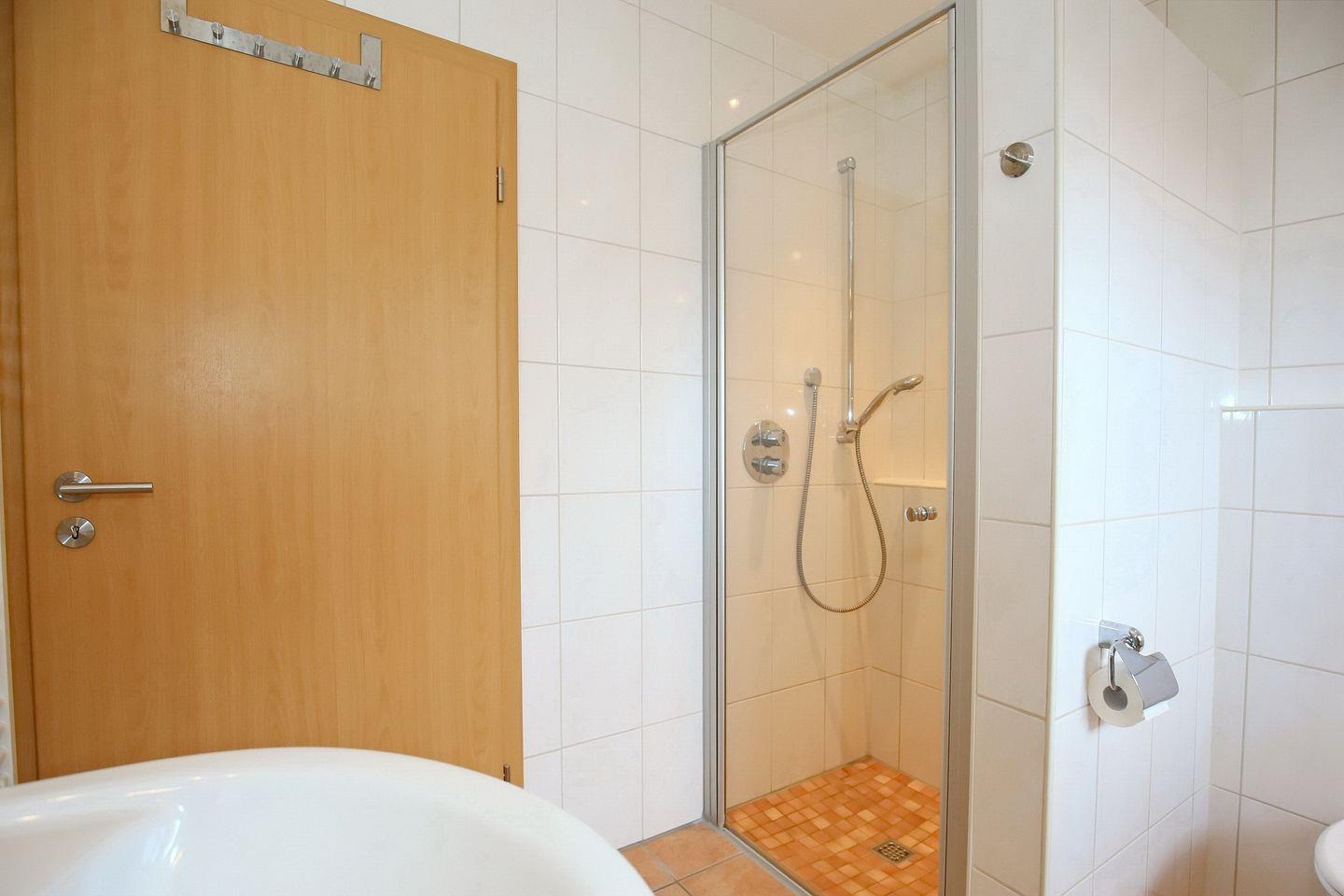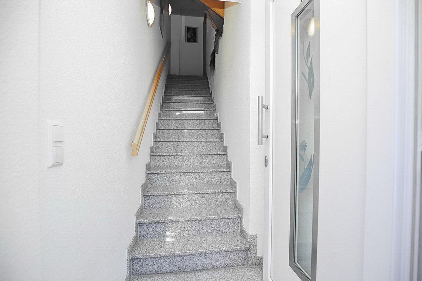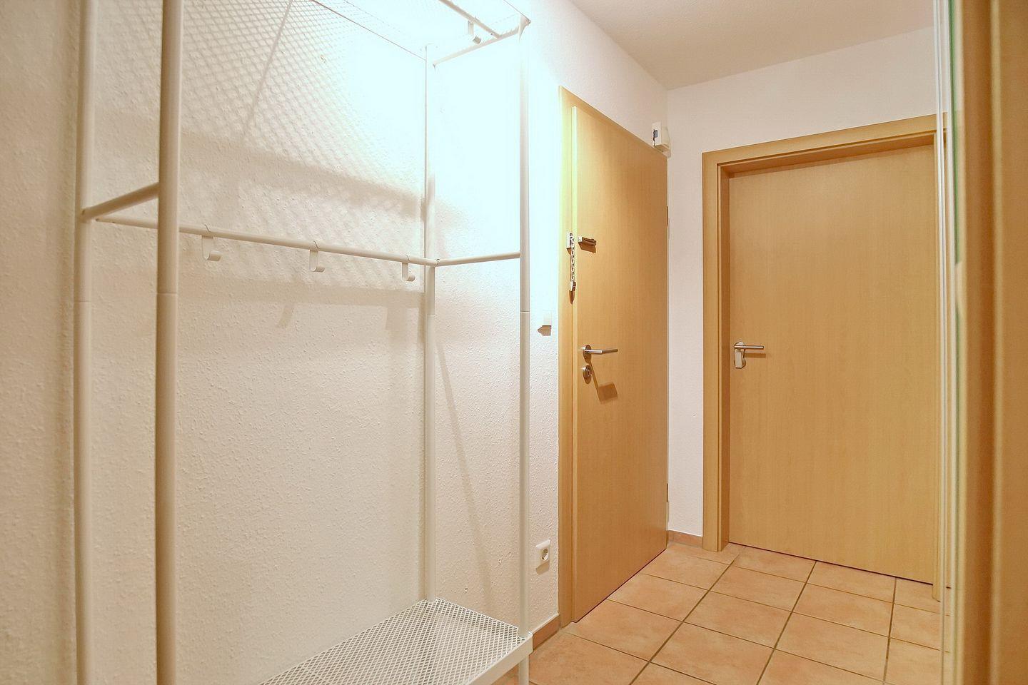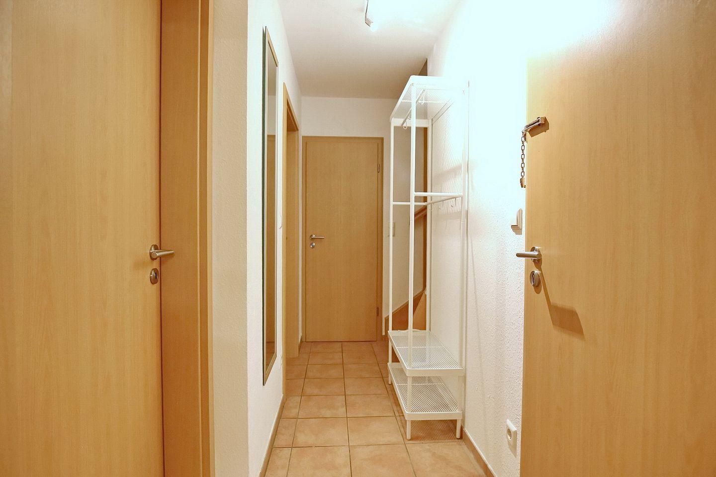 Auf der unteren Ebene der Wohnung befindet sich der Wohn-/Essbereich mit Küchenzeile. Der Wohnraum ist mit einem gemütlichen Essbereich für 6 Personen ausgestattet. Neben dem Essbereich liegt die moderne Küchenzeile mit Geschirrspüler und Backofen. Auf der unteren Ebene steht dir ein Schlafzimmer mit einem Doppelbett (2 x 90 x 200cm) sowie ein großer Kleiderschrank für deine Urlaubsgarderobe zur Verfügung. Vom Flur aus erreichst du das Duschbad und den Hauswirtschaftsraum mit Münzwaschmaschine und Münztrockner. Die untere Ebene ist bis auf das Schlafzimmer (Laminat) gefliest.