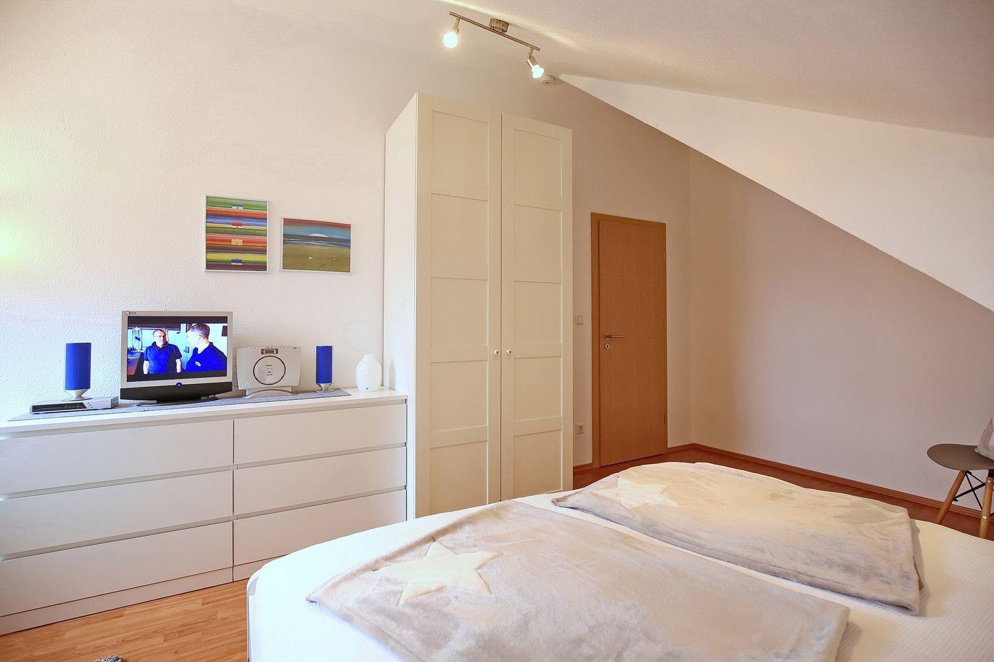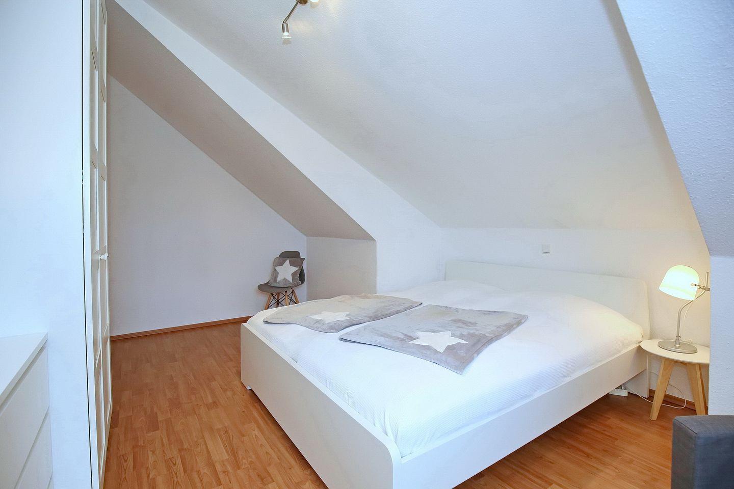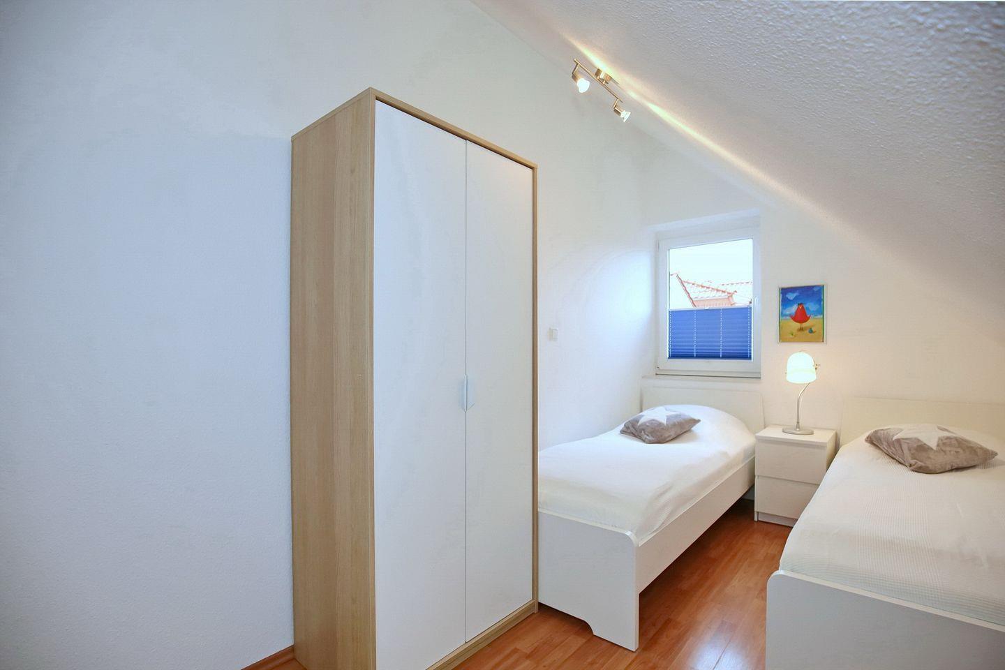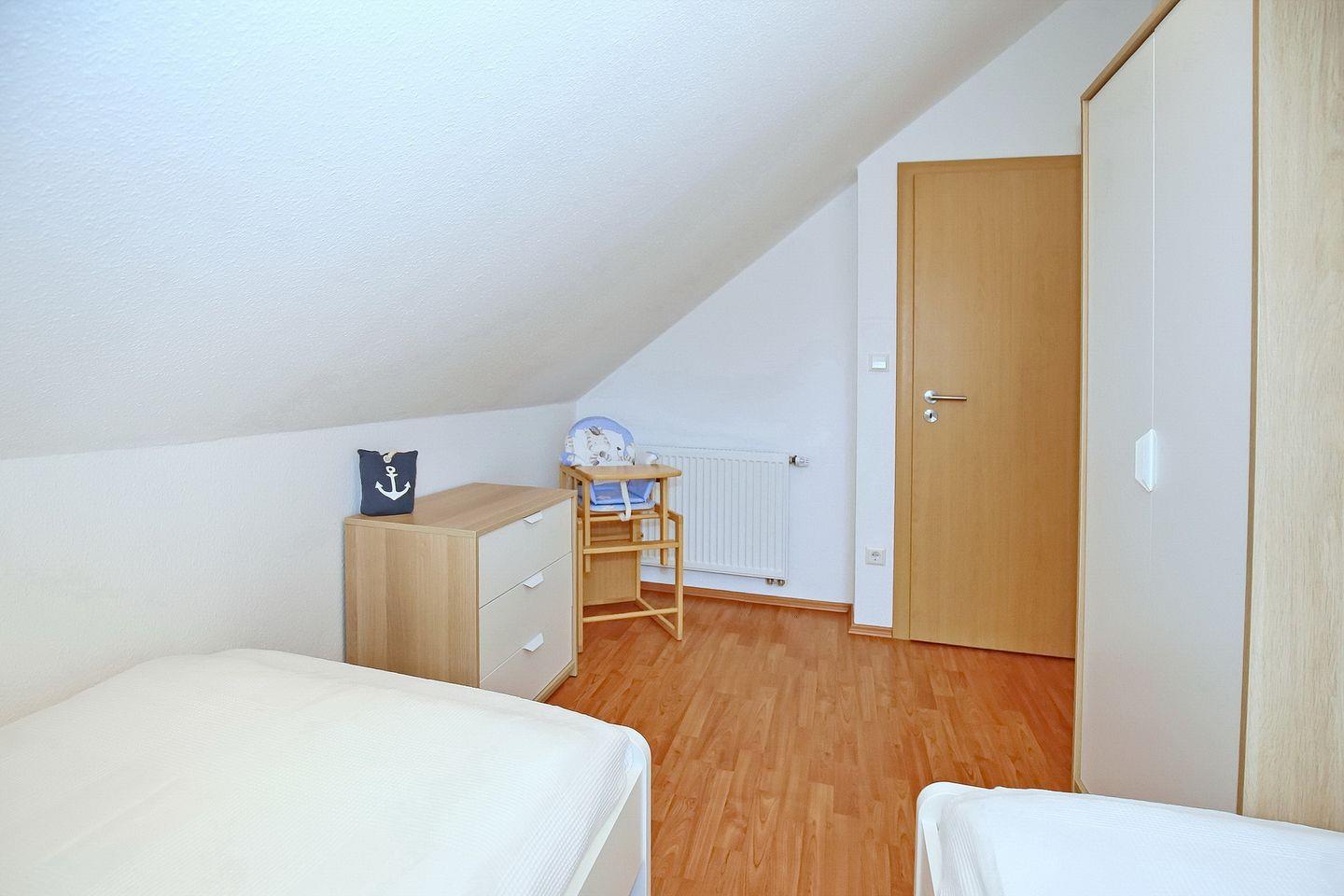 Im ersten Schlafzimmer im Dachgeschoss stehen dir eine Schlafcouch (160 x 200 cm), ein Kleiderschrank für deine Urlaubsgarderobe sowie ein TV zur Verfügung. Im zweiten Schlafzimmer, ebenfalls im Dachgeschoss, befinden sich zwei Einzelbetten (2 x 90 x 200 cm) sowie eine Kommode für mitgebrachte Utensilien. Ein Treppenschutzgitter, ein Kinderhochstuhl, ein Babyphone und ein Kinderreisebett mit zusätzlicher Matratze sind vorhanden. Das gesamte Dachgeschoss ist mit Laminat ausgelegt.