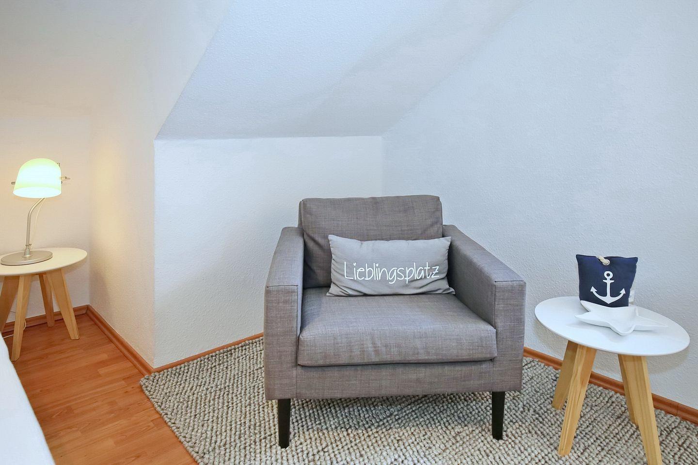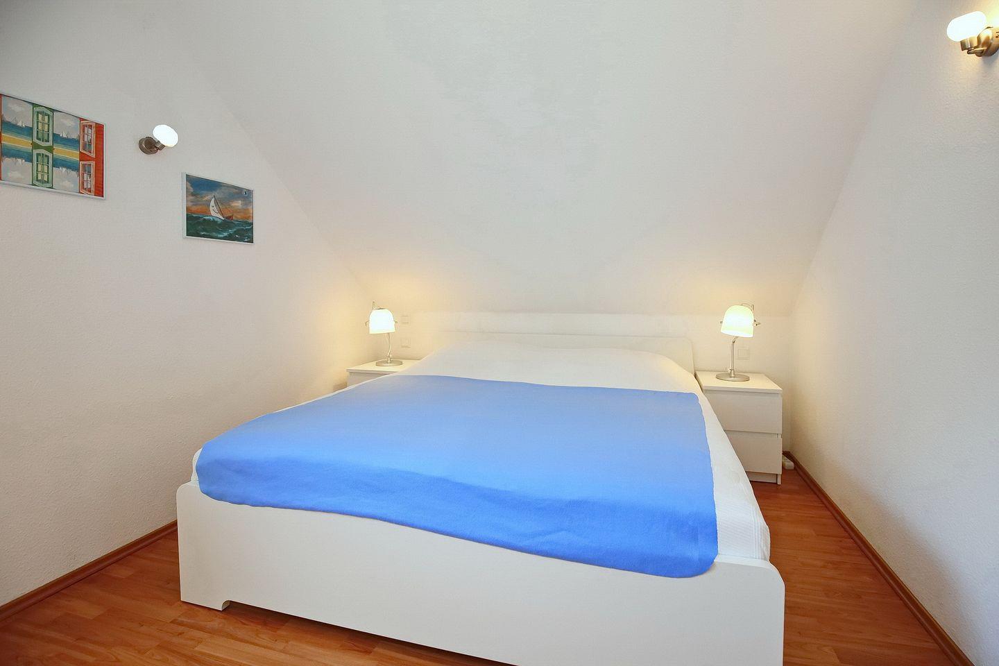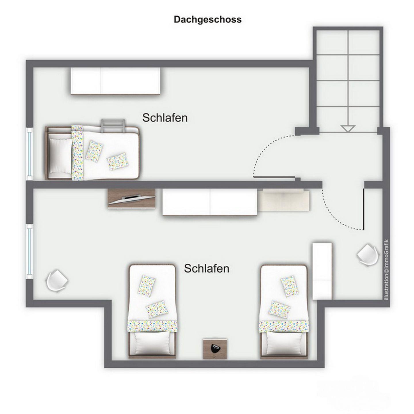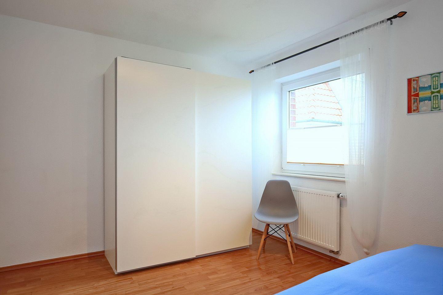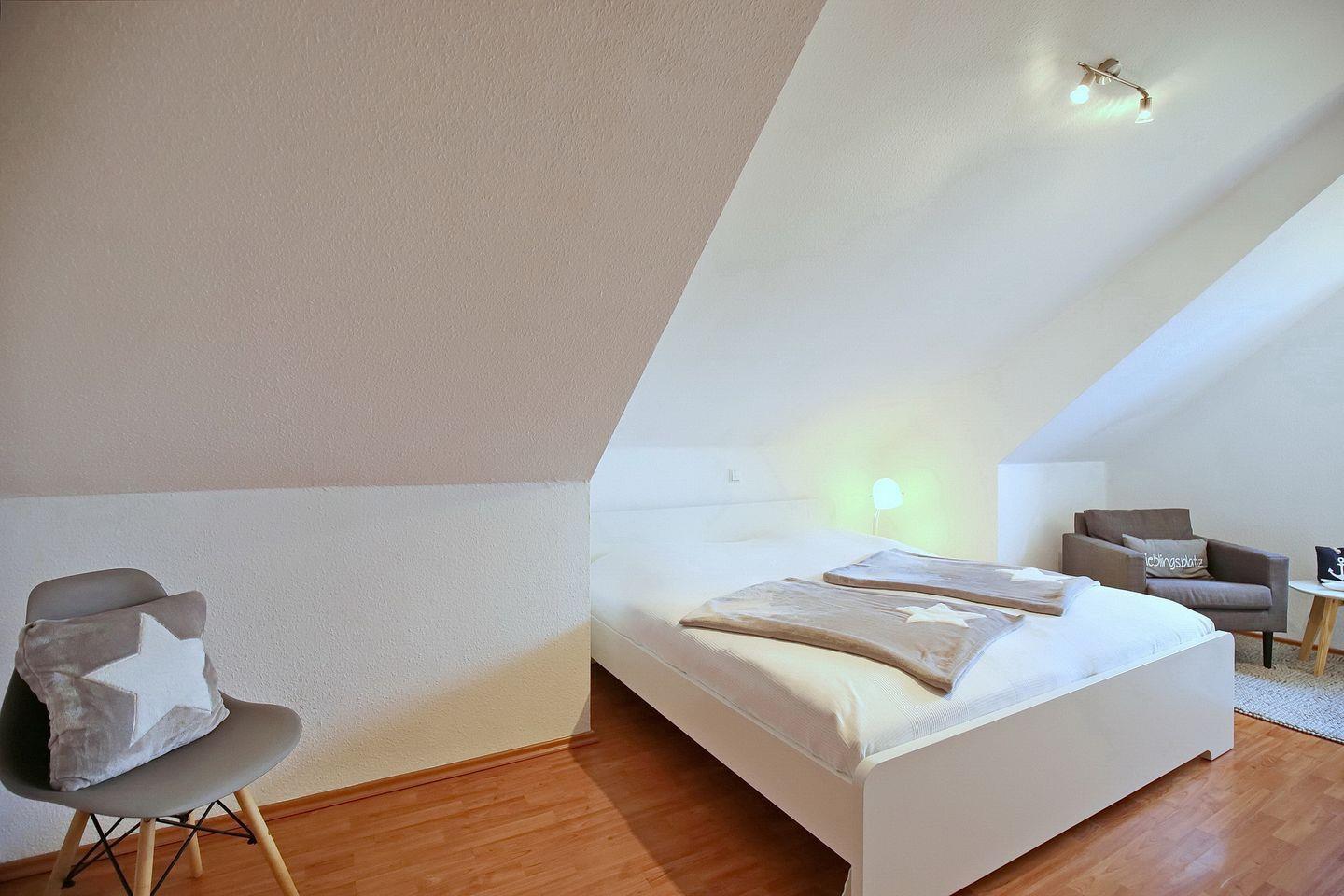 Im ersten Schlafzimmer im Dachgeschoss stehen dir eine Schlafcouch (160 x 200 cm), ein Kleiderschrank für deine Urlaubsgarderobe sowie ein TV zur Verfügung. Im zweiten Schlafzimmer, ebenfalls im Dachgeschoss, befinden sich zwei Einzelbetten (2 x 90 x 200 cm) sowie eine Kommode für mitgebrachte Utensilien. Ein Treppenschutzgitter, ein Kinderhochstuhl, ein Babyphone und ein Kinderreisebett mit zusätzlicher Matratze sind vorhanden. Das gesamte Dachgeschoss ist mit Laminat ausgelegt.