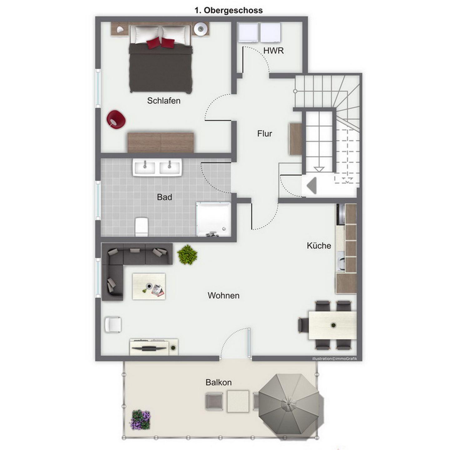 Der Zugang zum möblierten Südbalkon erfolgt vom Wohnbereich aus. Zu deiner Unterhaltung befindet sich im Wohnzimmer ein Flachbild-TV.