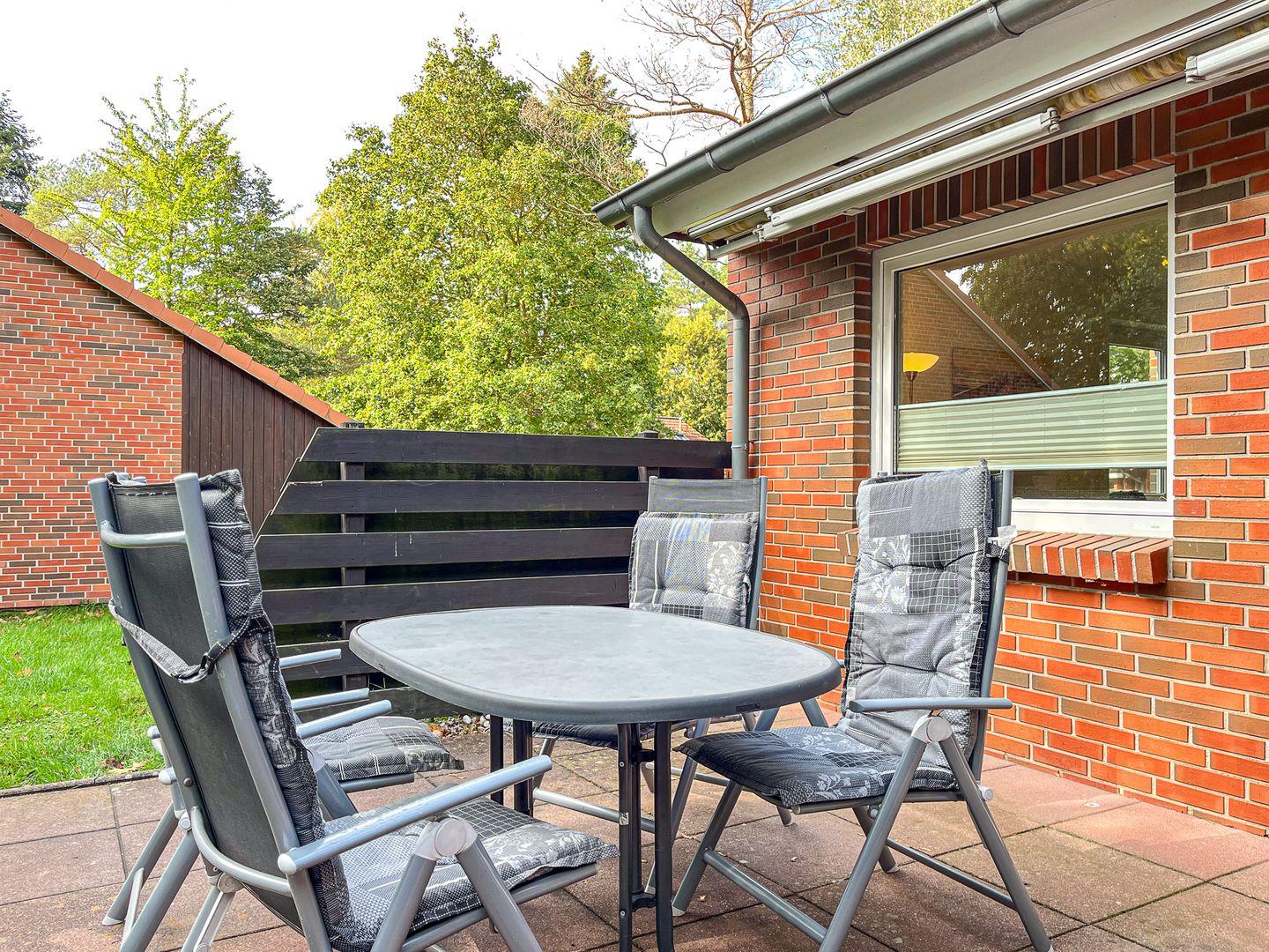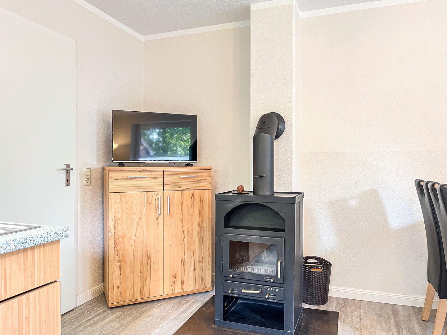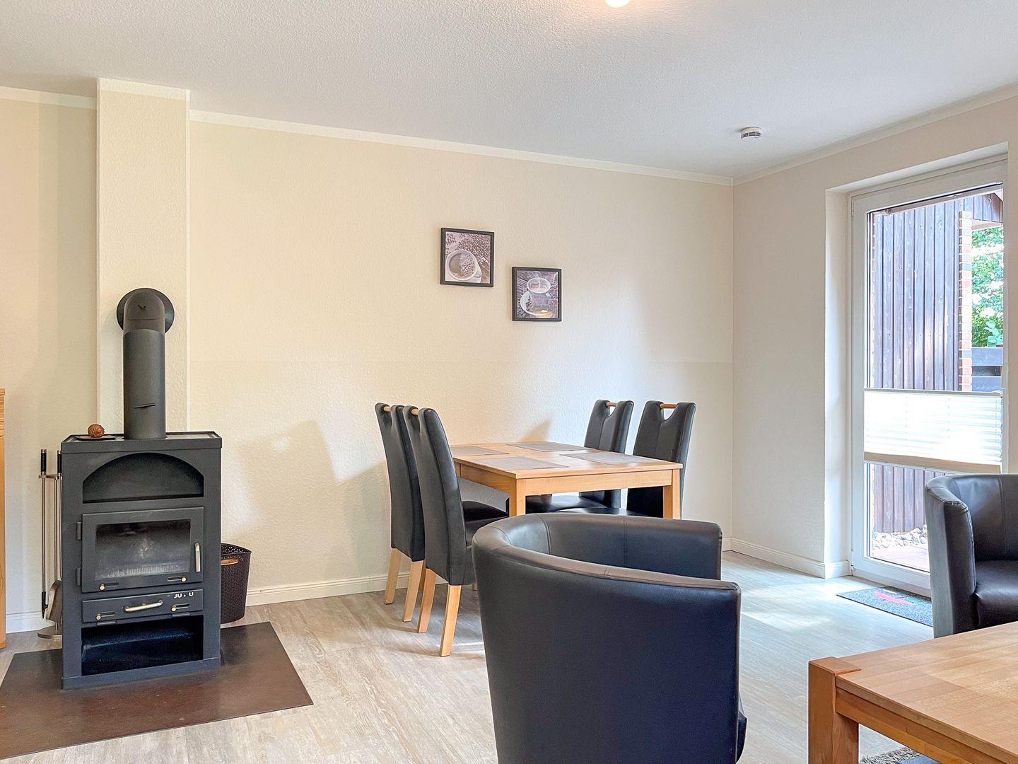 Erlebe unbeschwerte sonnige Tage auf der möblierten Süd Terrasse mit Markise. Das Wohnzimmer mit integrierter Küchenzeile ist ausgestattet mit einer Couchgarnitur und 2 Sessel. Ein Flachbild-TV, eine Stereoanlage, Bücher sowie Kartenspiele sorgen für Abwechslung in deinem Urlaub. Weiterhin steht dir ein Kamin für gemütliche Stunden zur Verfügung.