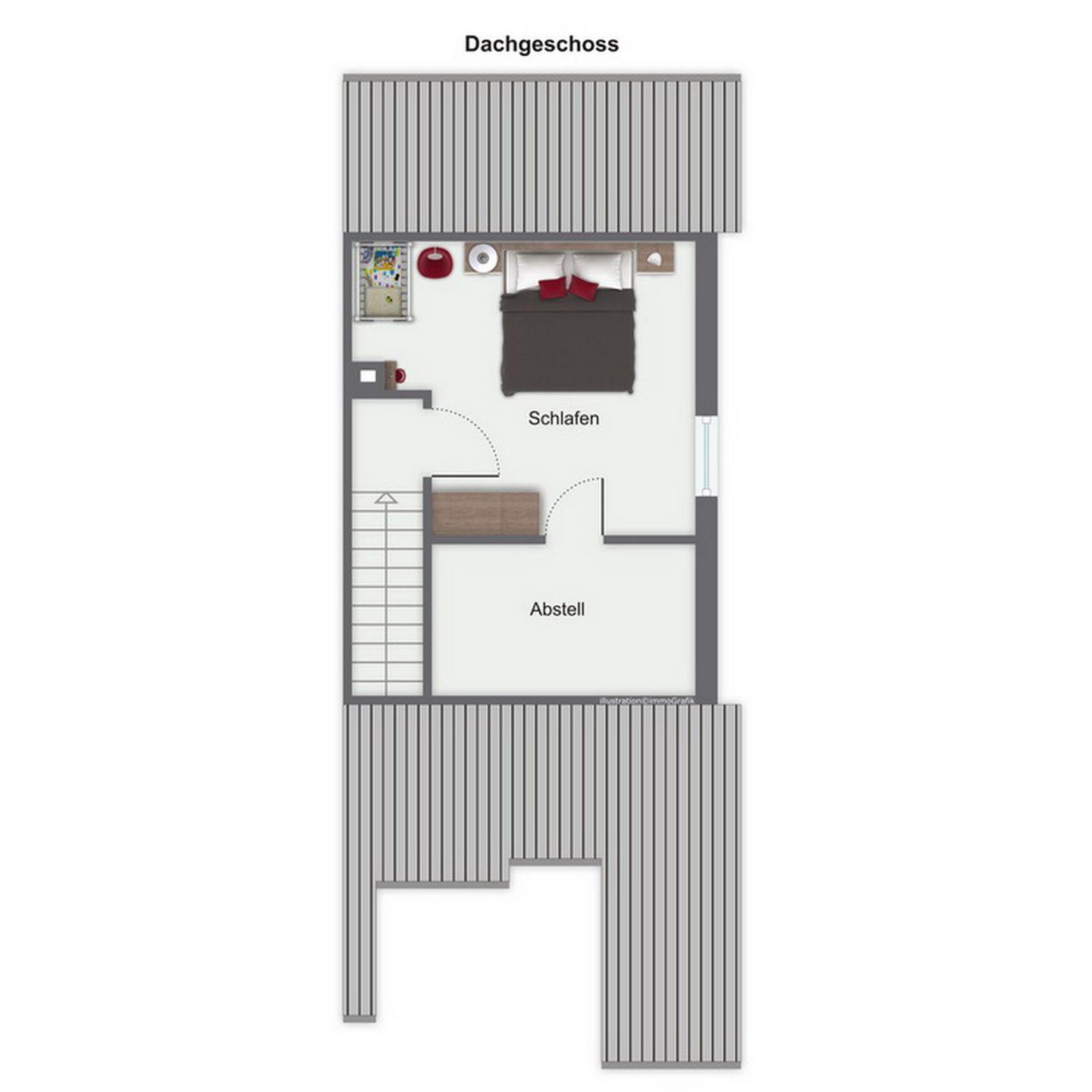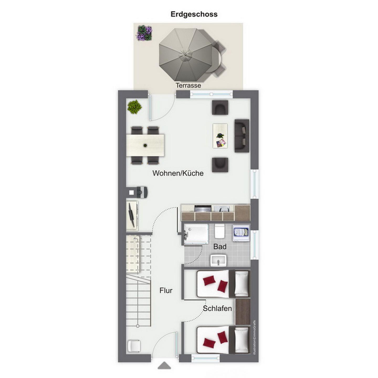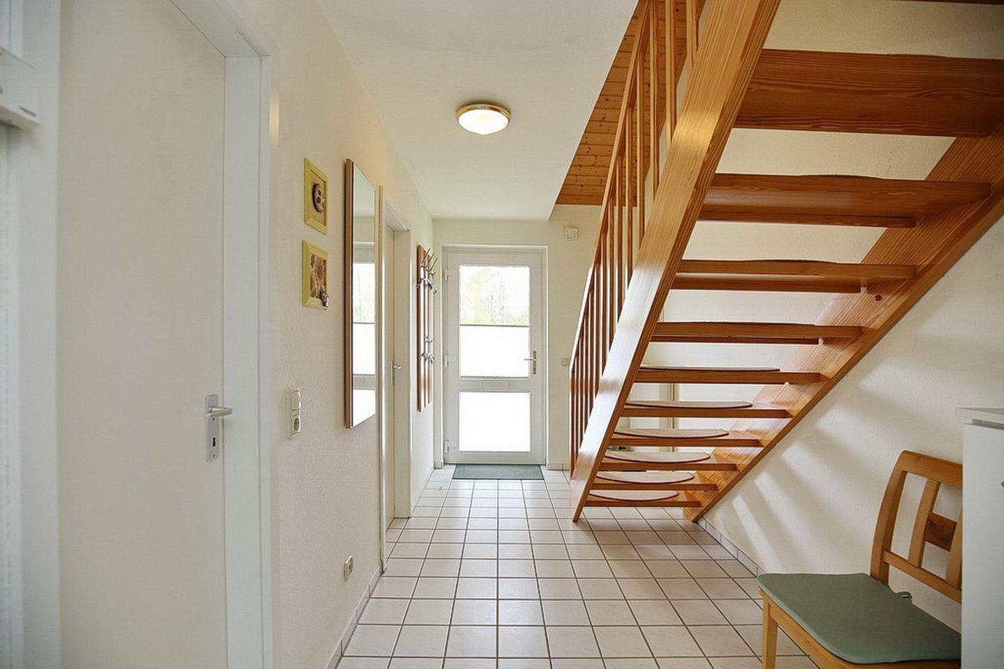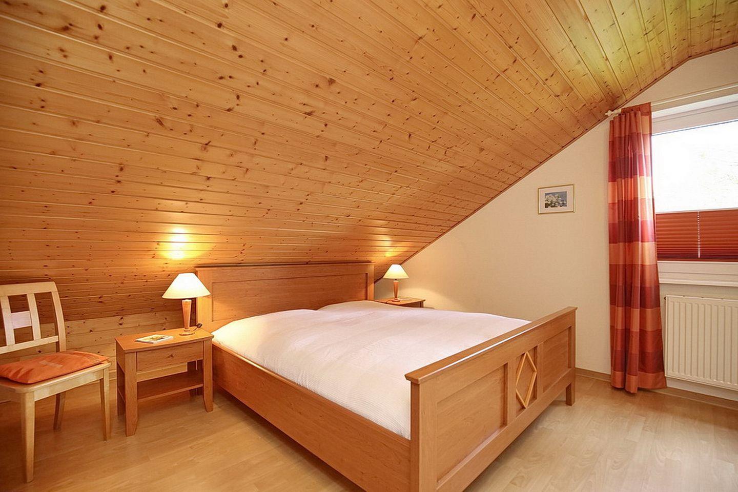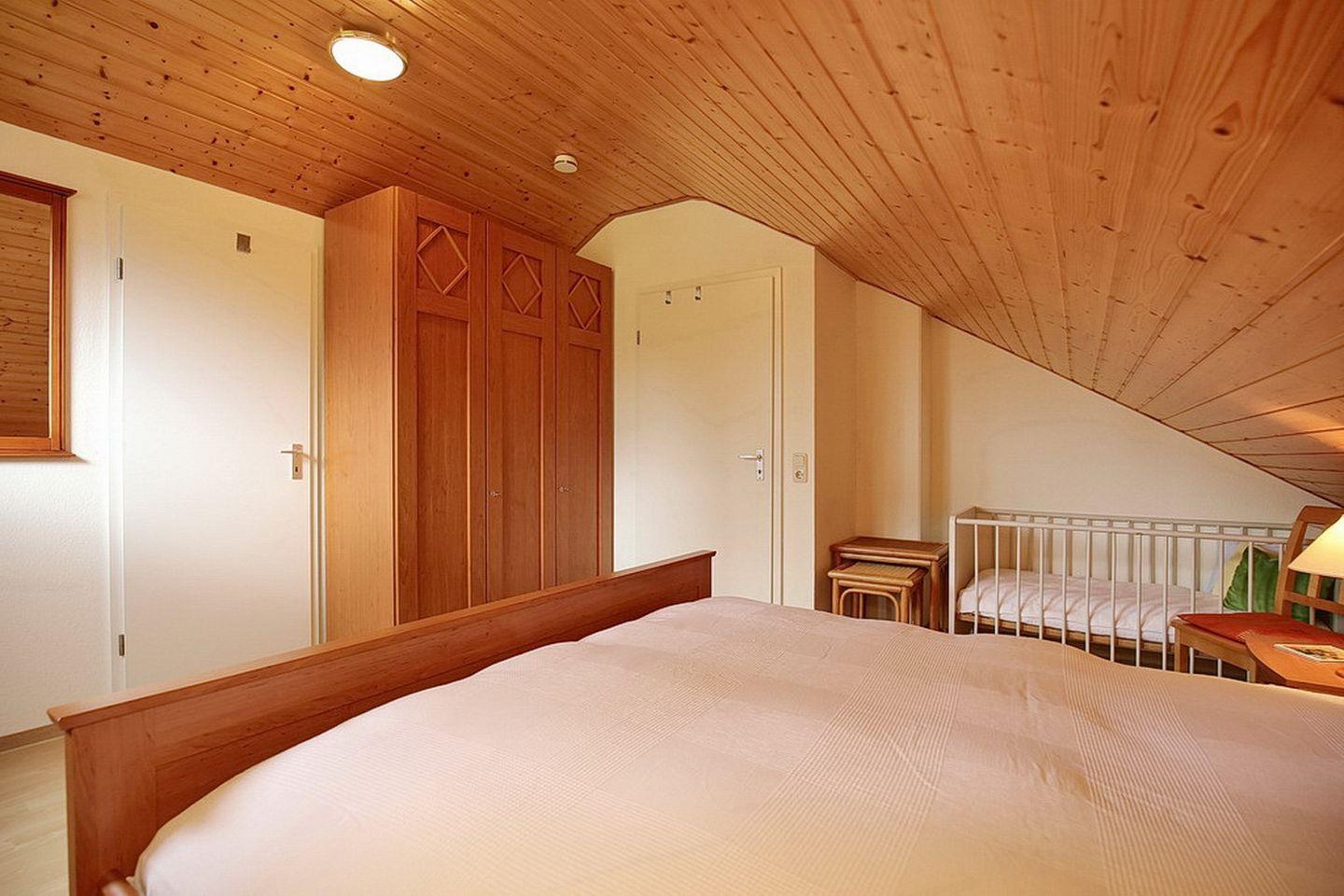 Eine Holztreppe führt in die helle und freundliche obere Etage. Hier findest du das 2. Schlafzimmer. Dieses ist mit einem Doppelbett (2x 90 x 200 cm), einem Kleiderschrank sowie 2 Nachtschränken ausgestattet. Weiterhin stehen dir Plissees und Vorhänge zur Verdunkelung zur Verfügung.