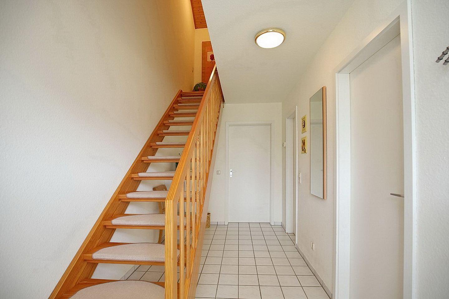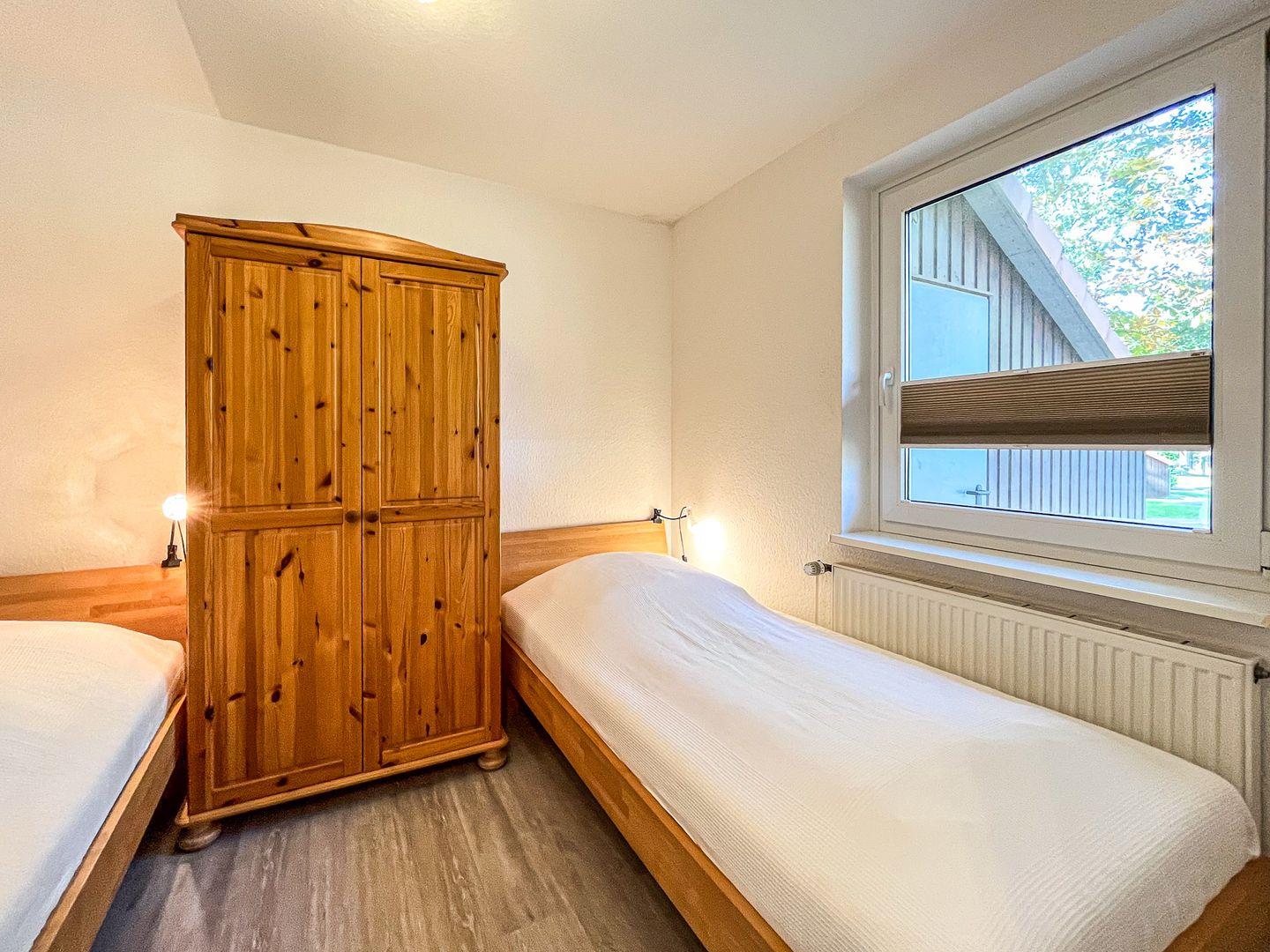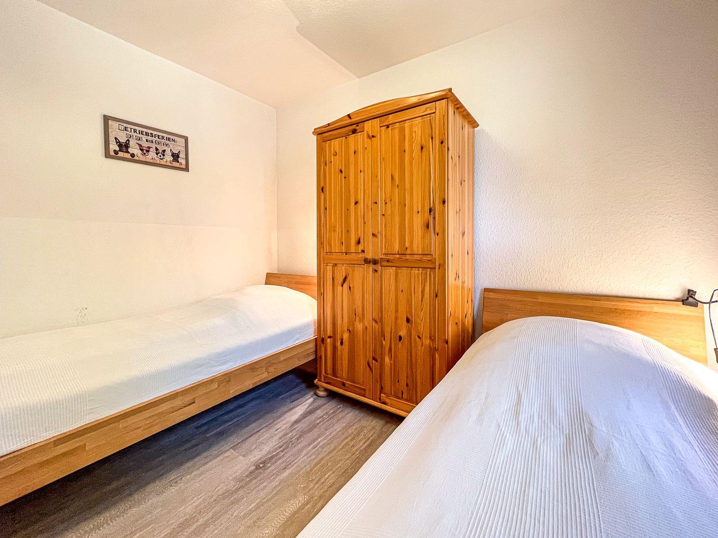 Das untere Schlafzimmer ist mit 2 Einzelbetten (90 x 200 cm) und einem Kleiderschrank versehen. Verdunklungsvorhänge an den Fenstern garantieren einen ruhigen und erholsamen Schlaf. Der Flurbereich ist hell und verfügt über einen Wandspiegel sowie eine Garderobe.