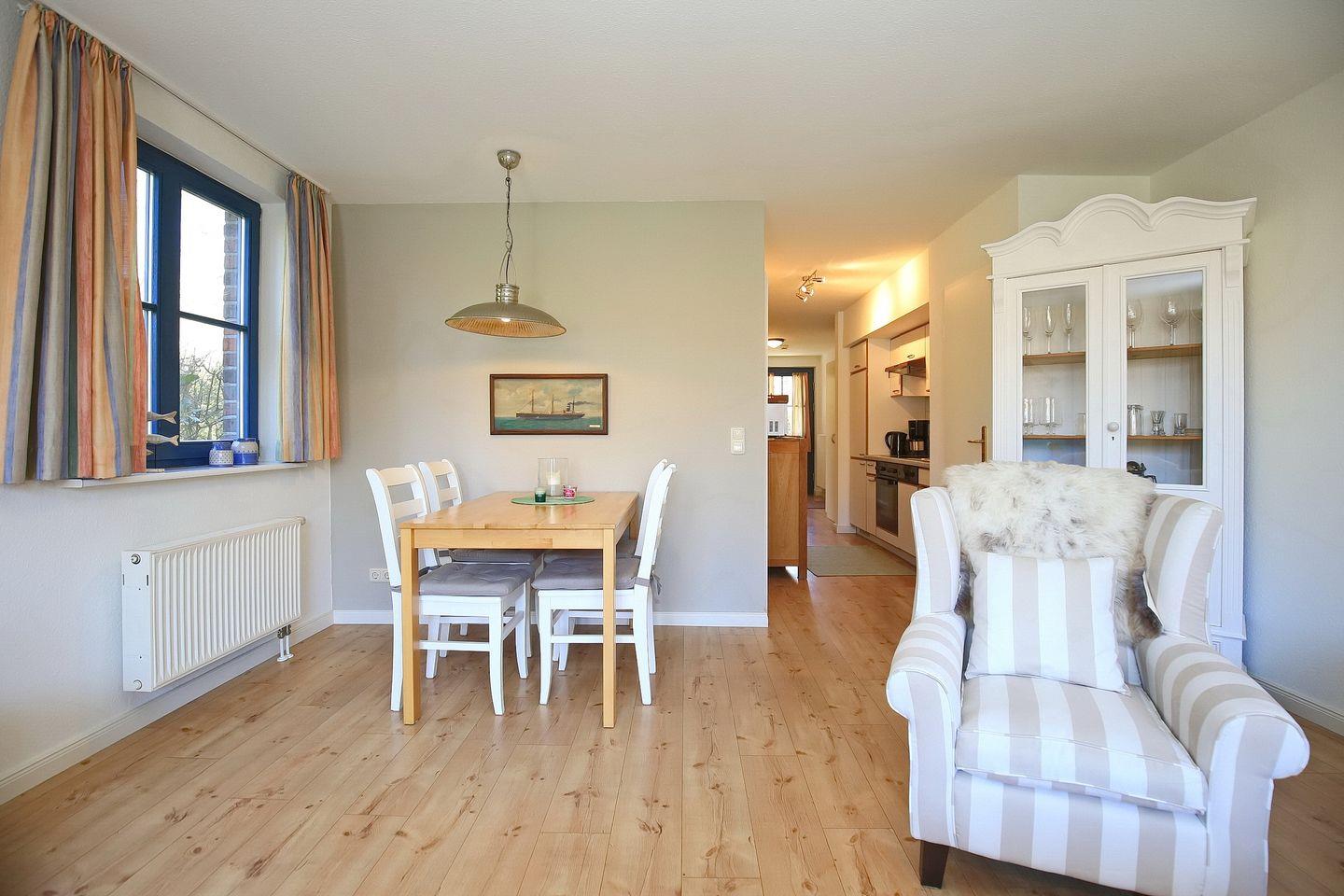 Im Erdgeschoss des Hauses liegt diese ca. 55 m² große lichtdurchflutete Außenwohnung. Deine überdachte Terrasse ist in Süd-West-Lage ausgerichtet und hat einen Strandkorb. Die Wohnung verfügt über einen Wohn- und Essbereich, ein Schlafzimmer, eine Küchenzeile und ein Duschbad. Zum Strand sind es vom Feriendorf Papillon nur etwa 250 m.