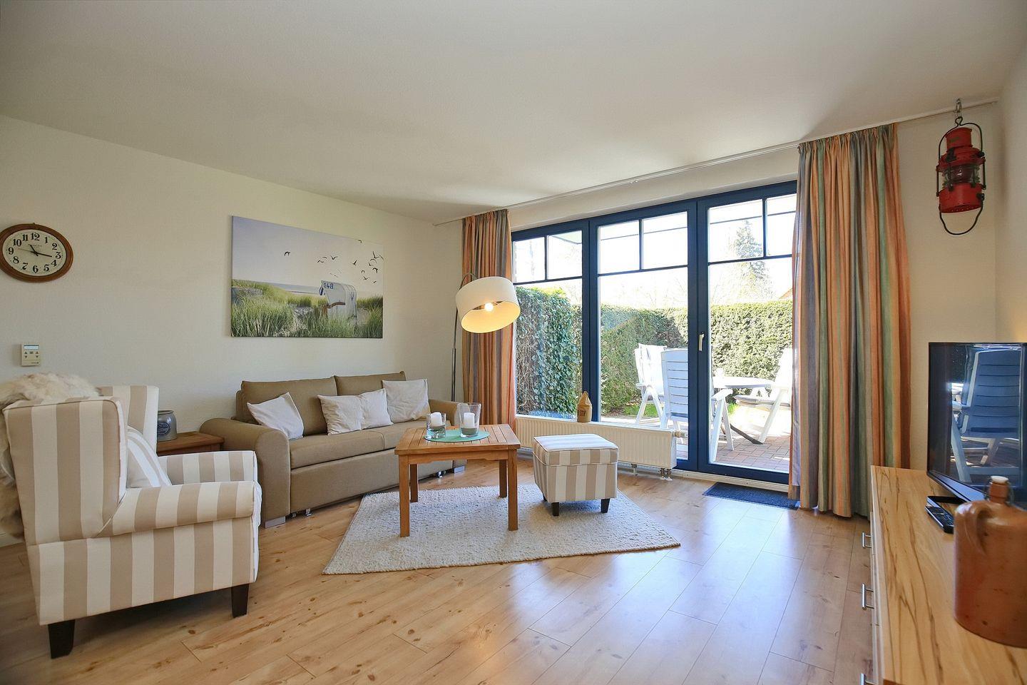 Auf der mit einer Sitzgarnitur und einem neuen Strandkorb möblierten Terrasse genießt du ganztägig die Sonne mit freiem Blick ins Grüne. Ein bequemes Schlafsofa für die dritte Person ist vorhanden. Zur Unterhaltung stehen dir ein großer Flachbildschirm, DVD-Player, DVDs, eine Hi-Fi-Anlage mit Dockingstation (für USB) und ein CD-Player zur Verfügung.