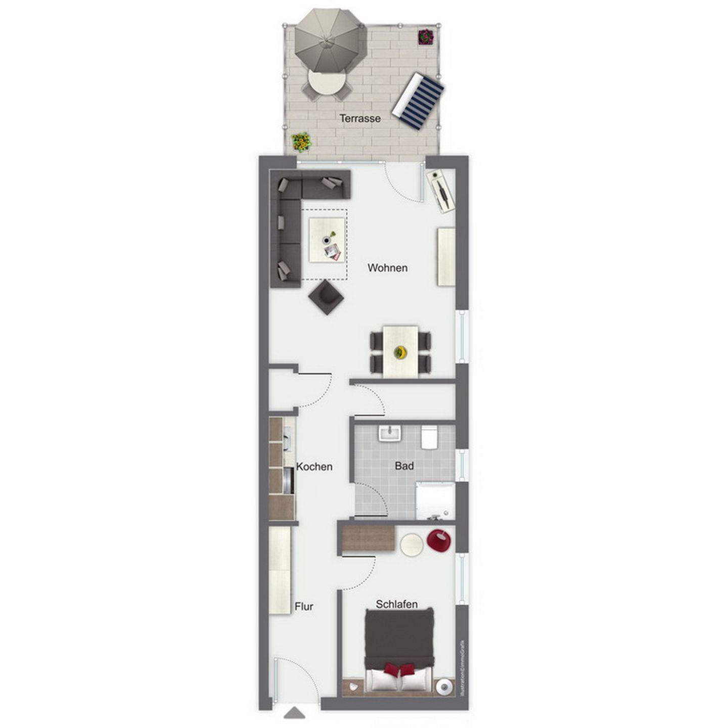Das Schlafzimmer ist mit einem bequemen Doppelbett (2x 90 x 200 cm) sowie einem Kleiderschrank ausgestattet. Zur Verdunklung dienen Vorhänge. Einen weiteren großen Kleiderschrank findest du auf dem Flur.