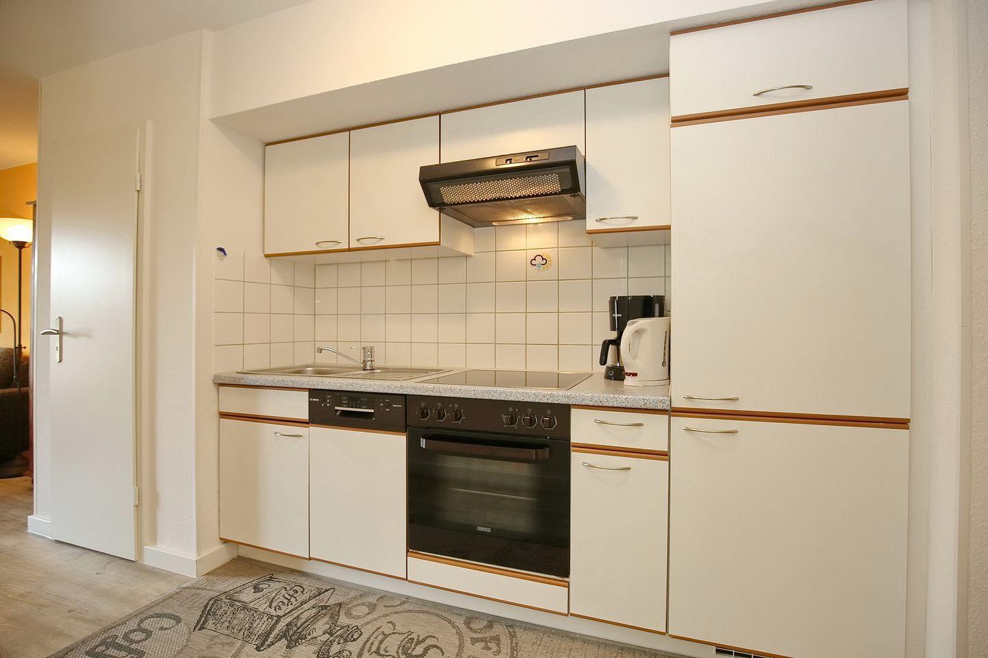 In der Küchenzeile findest du einen Geschirrspüler, ein 4-Platten-Cerankochfeld, einen Backofen, einen elektrischen Tischgrill und einen Kühlschrank mit Gefrierfach. Die Mahlzeiten können im großzügigen Essbereich im Wohnzimmer eingenommen werden.