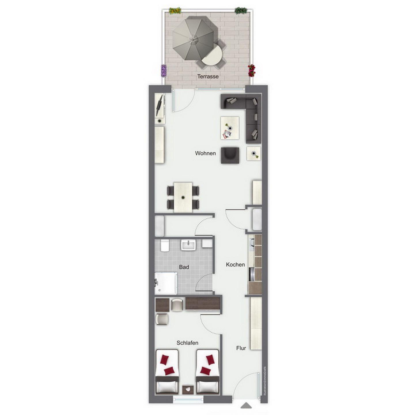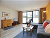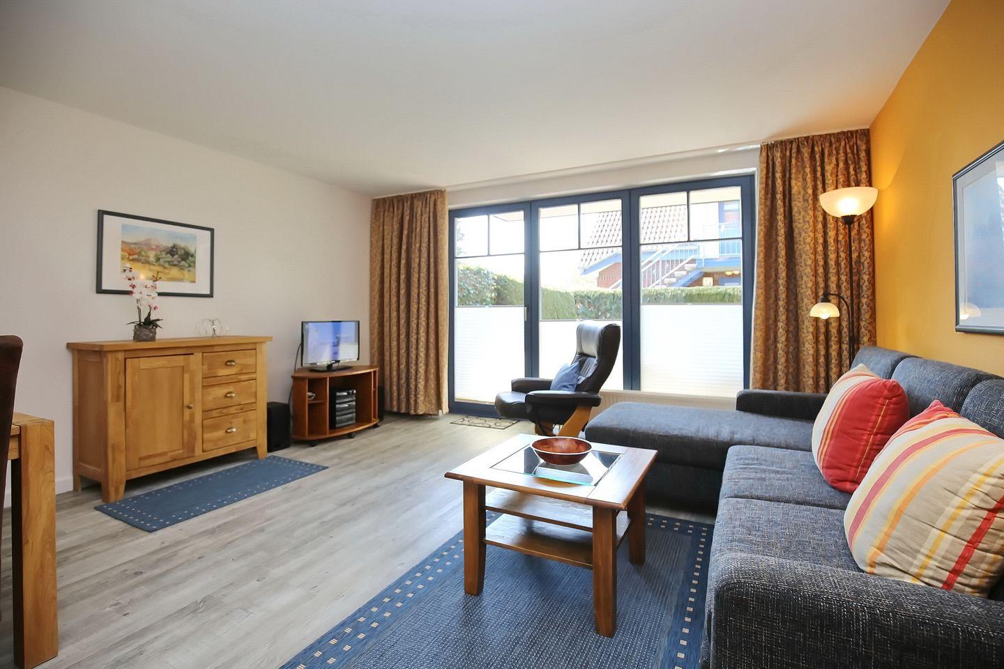 Die möblierte Terrasse ist überdacht und vom Wohnzimmer zu erreichen. Ein bequemes Sofa mit Schlaffunktion dient als Schlafmöglichkeit für zwei Personen (135 x 200 cm). Für Kurzweil sorgen ein Flachbild-TV und eine Stereo-Anlage. Das Schlafzimmer ist mit Teppichboden und der Rest der Wohnung mit Vinyl-Parkett ausgelegt.