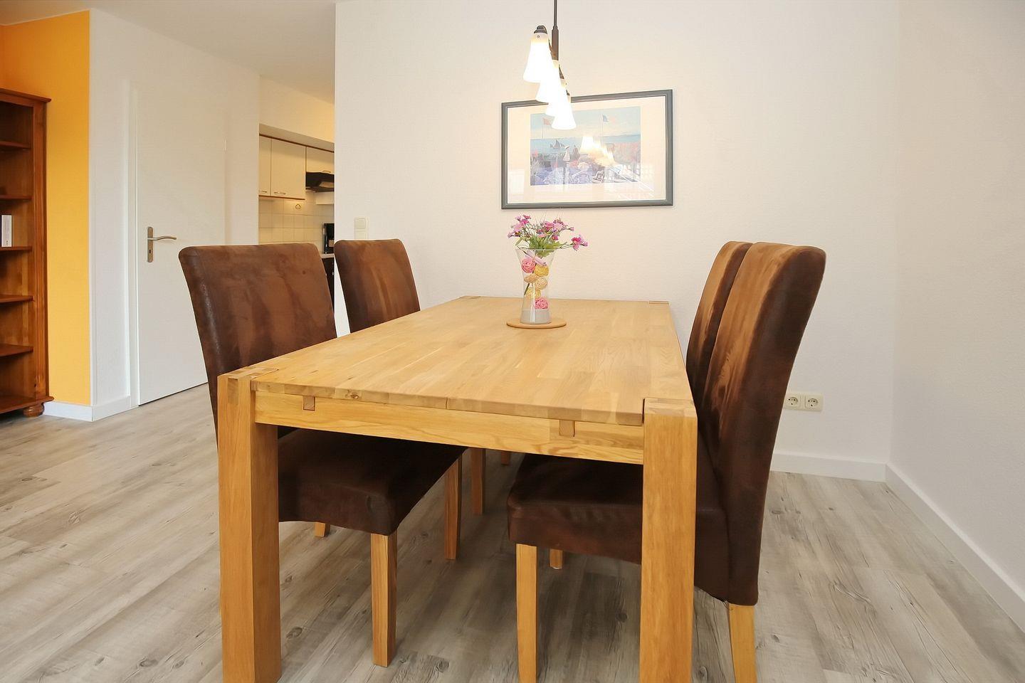Es erwartet dich in Süd-West-Lage eine ansprechend eingerichtete Ferienwohnung im Erdgeschoss des Hauses 2. Auf ca. 55 m² bewohnst du einen Wohn- und Essbereich, ein Schlafzimmer, eine Küchenzeile und ein Duschbad. Zum Strand sind es vom Feriendorf Papillon nur etwa 250 m.