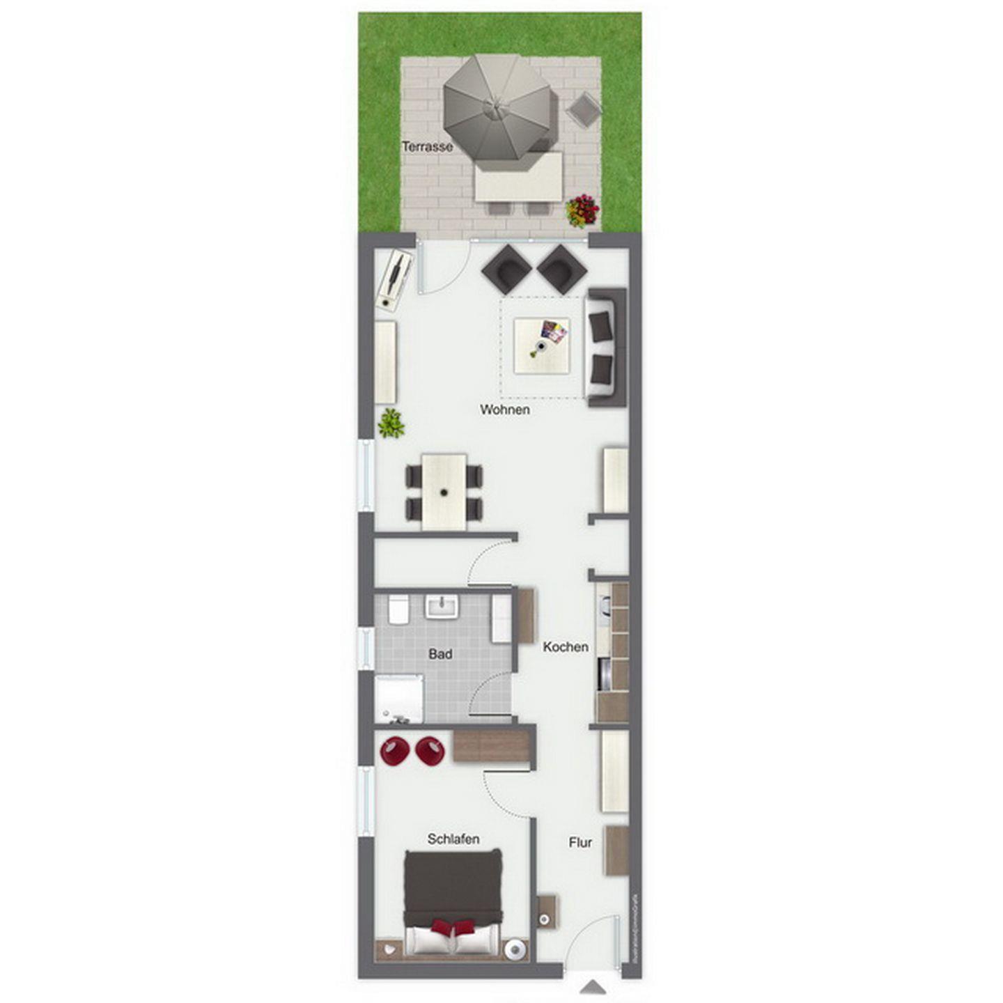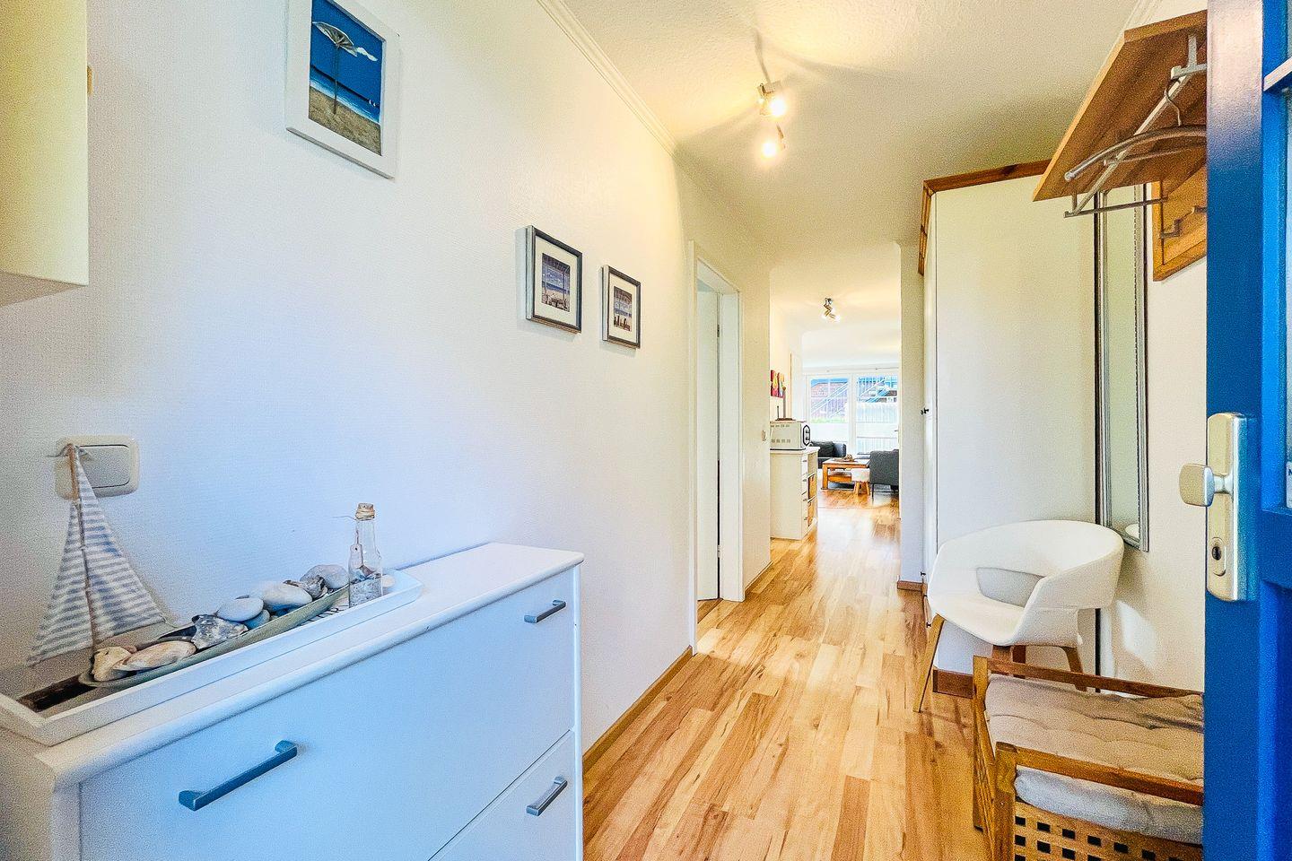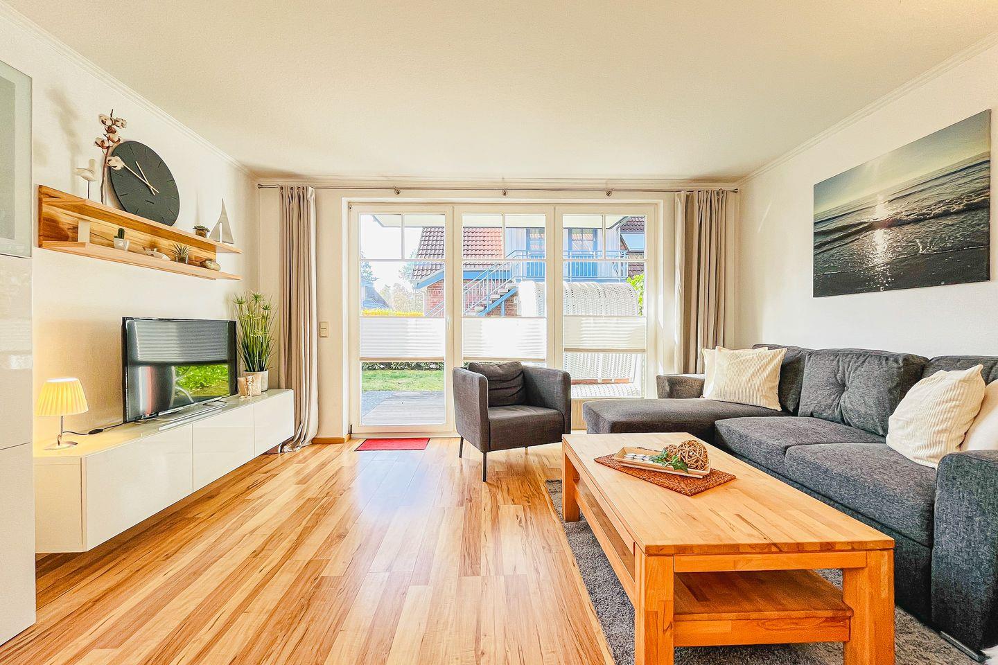 Die gemütliche Erdgeschoss-Wohnung, mit einer Terrasse und kleinem Garten in Süd-West-Lage, liegt am Ende des Hauses 3. Auf ca. 55 m² bewohnst du einen Wohn- und Essbereich, ein Schlafzimmer, eine Küchenzeile und ein Duschbad. Die Wohnung ist durch die Außenanlagen angenehm hell. Zum Strand sind es von der Ferienanlage Papillon etwa 250 m.