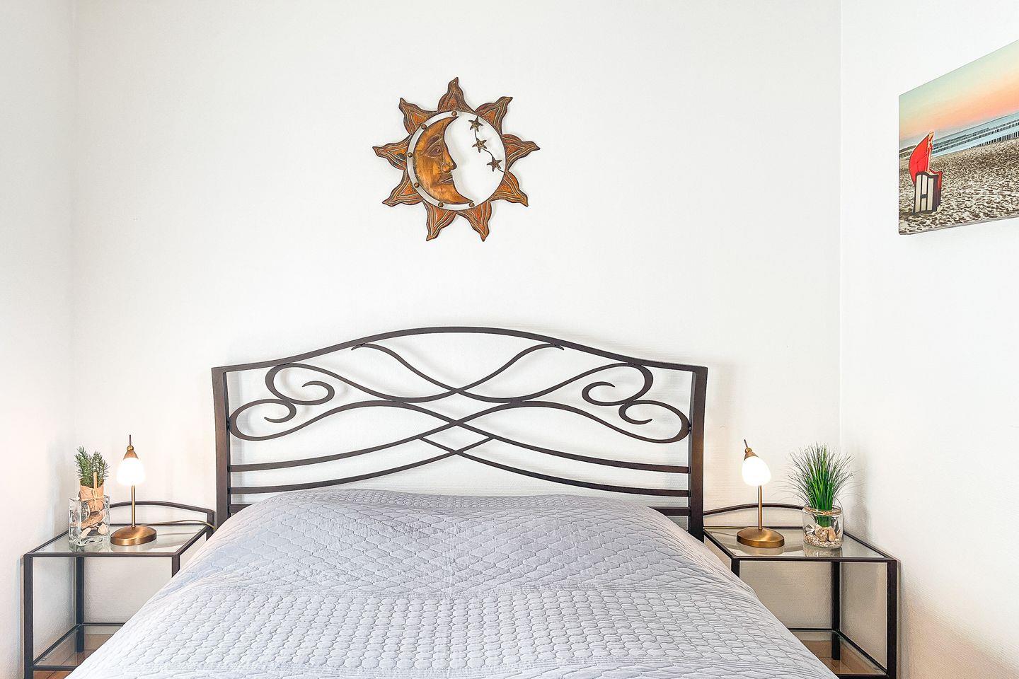 Im Schlafzimmer erwarten dich ein Doppelbett (2 x 80 x 200 cm) mit Ablagen rechts und links sowie und ein Kleiderschrank. Auf dem Flur findest du einen großen Kleiderschrank für dein übriges Reisegepäck. Plissees sowie zusätzlich Verdunklungsmöglichkeiten durch Vorhänge sind in der ganzen Wohnung vorhanden. Insektenschutz ist überwiegend vorhanden.