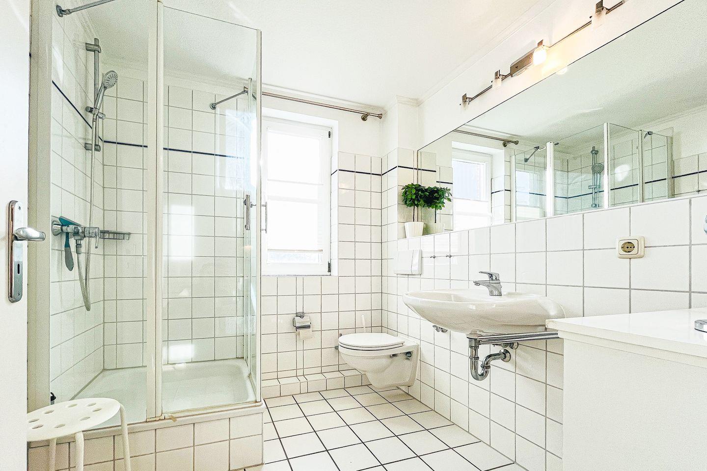 Das Duschbad verfügt über ein Fenster und ist mit Fön und Kosmetikspiegel ausgestattet. Fahrräder können im Fahrradständer am Haus abgestellt werden. Abstellmöglichkeiten sind außerdem in dem verschließbaren, wohnungseigenem Keller. Das Mitbringen von max. 2 Haustieren ist in der Nichtraucherwohnung gestattet.
