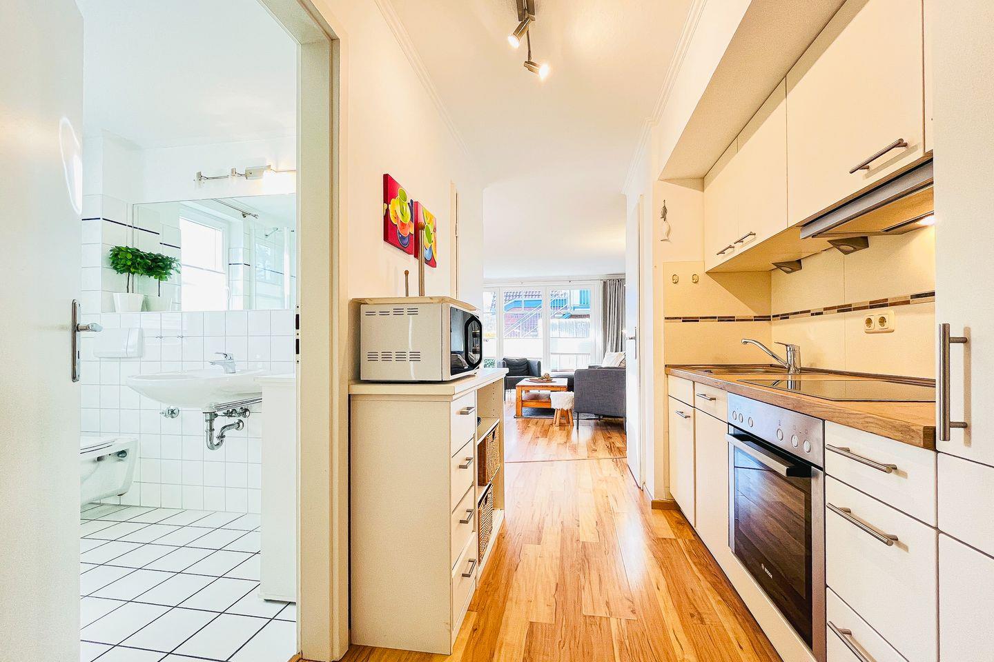 Die integrierte Küchenzeile ist neben einem 4-Platten-Cerankochfeld, Backofen, Geschirrspüler und Kühlschrank mit Gefrierfach zusätzlich mit einem Eierkocher, Wasserkocher, Mikrowelle, Toaster, Handmixer sowie den nötigen Utensilien für die Zubereitung der Mahlzeiten reichlich und gut ausgestattet. Als Bodenbelag wurde in der ganzen Wohnung Laminat verlegt.