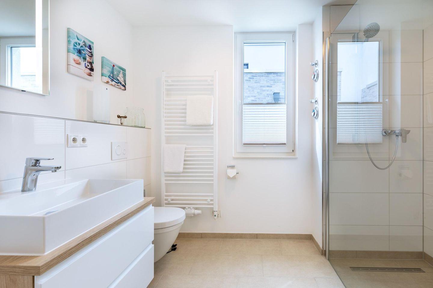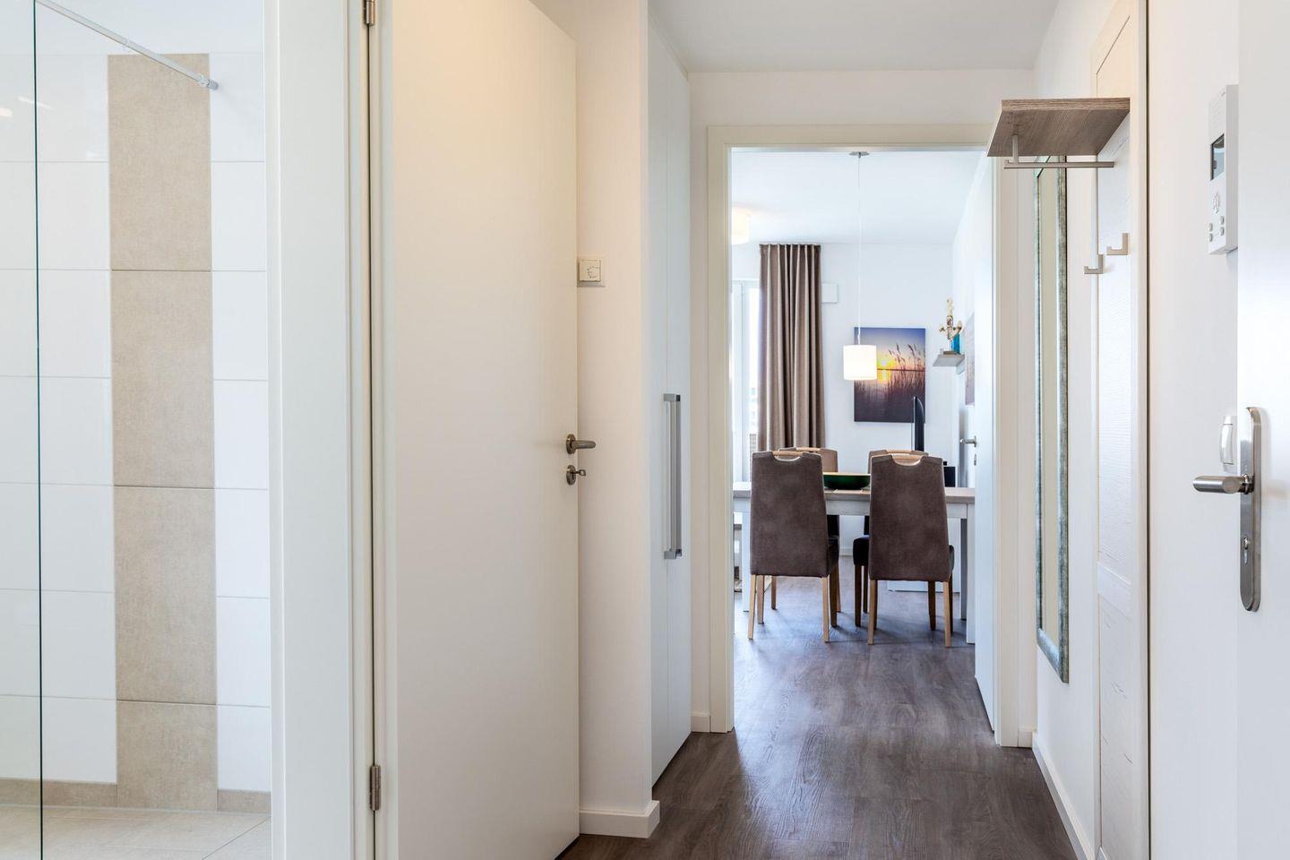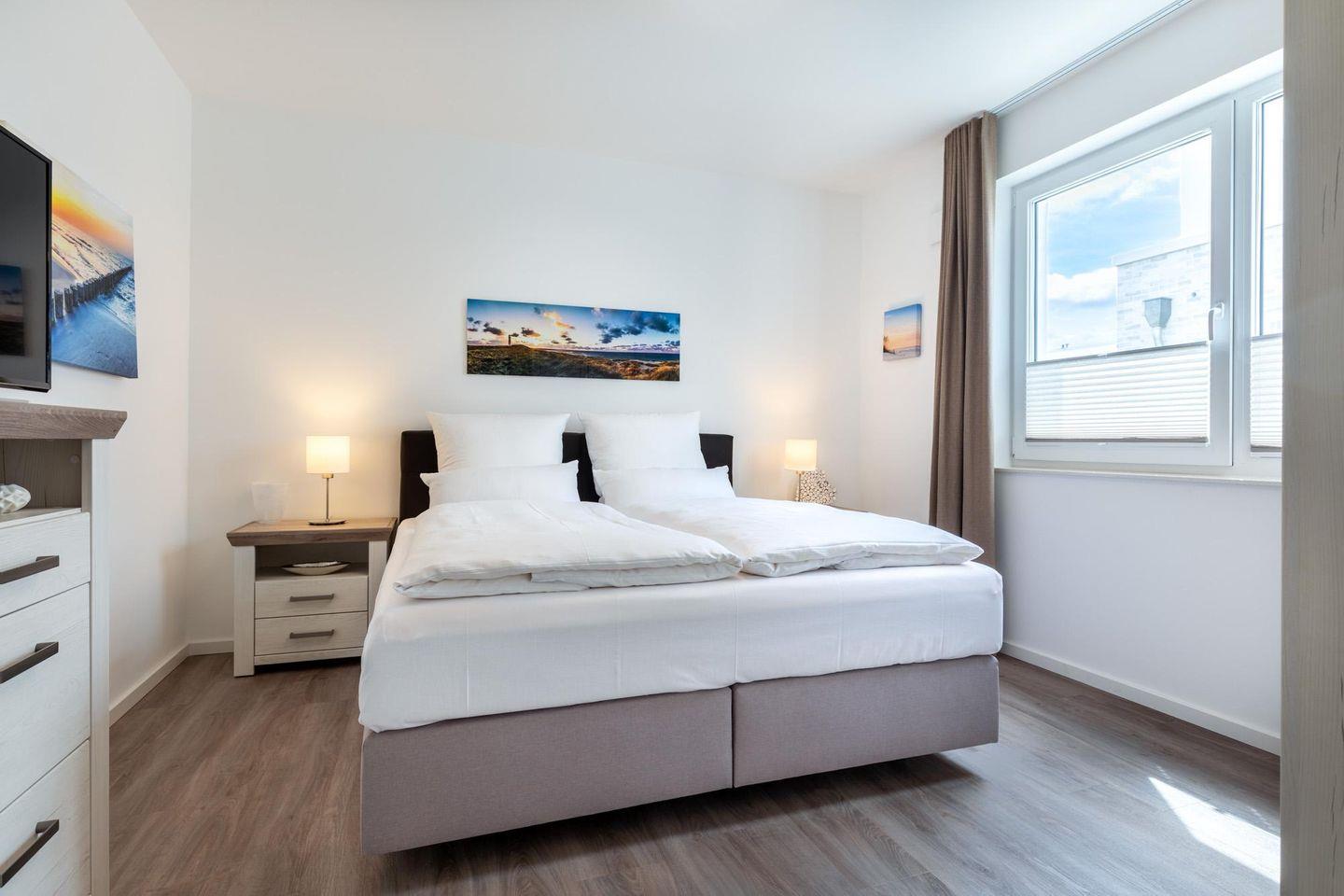 Das helle und moderne Nichtraucher-Apartment verfügt über Fußbodenheizung, bodentiefe Fenster mit 3-fach Isolierung, kostenfreies WLAN und eine voll ausgestattete offene Küche mit Geschirrspüler, Gefrierfach, Kaffeemaschine, Toaster, Wasserkocher, Backofen und Mikrowelle sowie über einen Essbereich. Im Wohnbereich befindet sich eine Doppelschlafcouch (1,60 x 2,00 m) und ein großer Flatscreen-TV mit Blu-ray-Player. Das separate Schlafzimmer ist mit einem modernen Boxspringbett (1,80 x 2,00 m) und einem Flatscreen-TV ausgestattet. Ein Kinderbett kann gegen Entgelt im Wohnbereich aufgestellt werden und auf Wunsch könnt ihr einen Kinderhochstuhl hinzubuchen. Im stilvollen Badezimmer befinden sich eine ebenerdige Dusche, ein Waschtisch mit Föhn, Kosmetikspiegel und Handtuchheizkörper. Das Apartment verfügt über einen Flur mit Garderobe. Nach einem erholsamen Urlaubstag lässt es sich auf dem mit Gartenmöbeln und Sonnenschirm ausgestatteten und sonnigen Balkon, herrlich entspannen. Der Balkon ist vom Wohnzimmer aus begehbar.