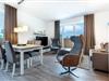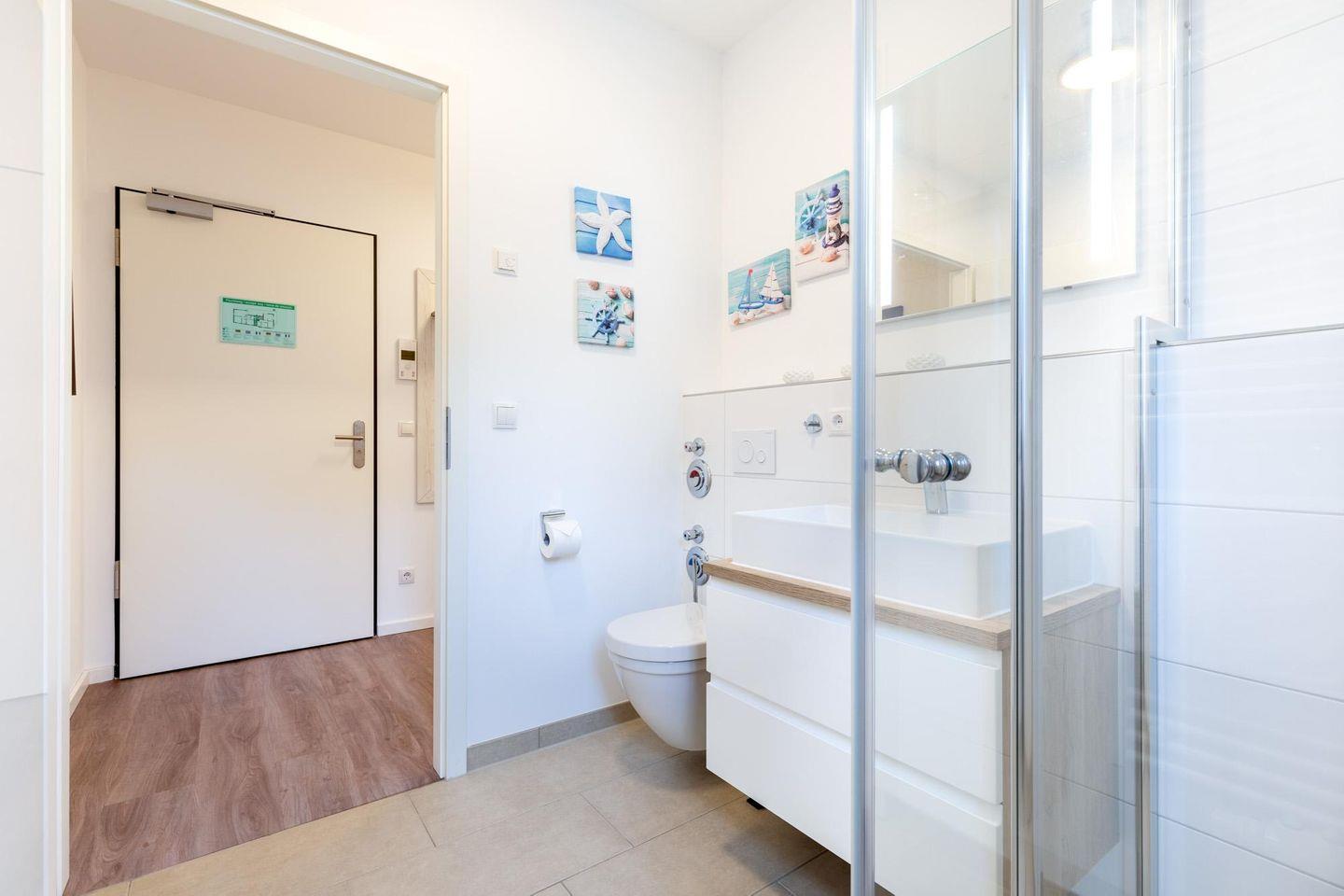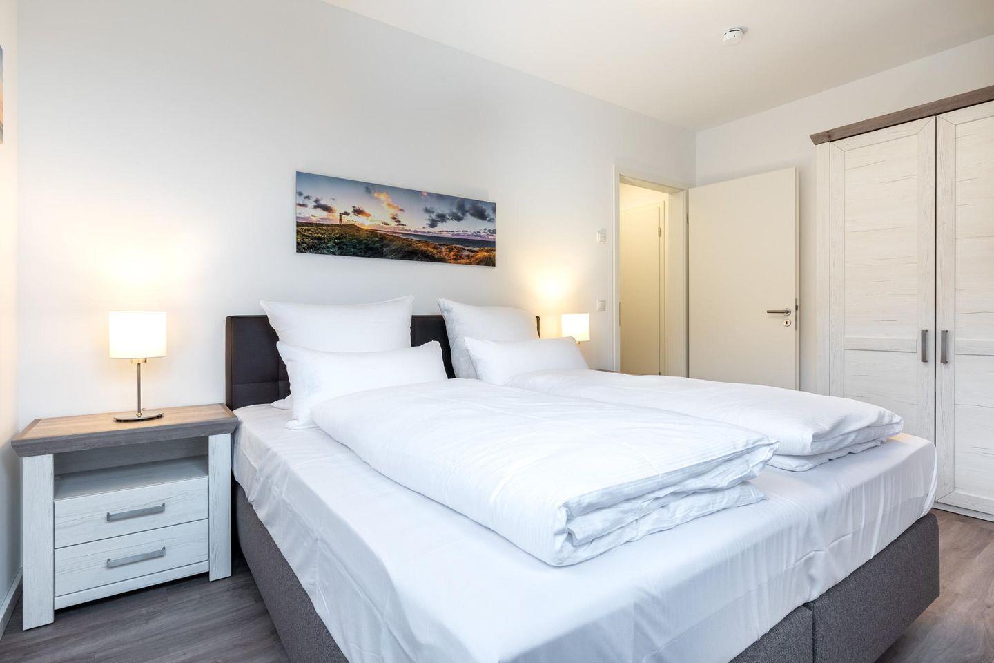 Das helle und moderne Nichtraucher-Apartment verfügt über Fußbodenheizung, bodentiefe Fenster mit 3-fach Isolierung, kostenfreies WLAN und eine voll ausgestattete offene Küche mit Geschirrspüler, Gefrierfach, Kaffeemaschine, Toaster, Wasserkocher, Backofen und Mikrowelle sowie über einen Essbereich. Im Wohnbereich befindet sich eine Doppelschlafcouch (1,60 x 2,00 m) und ein großer Flatscreen-TV mit Blu-ray-Player. Beide separaten Schlafzimmer sind jeweils mit einem modernen Boxspringbett (1,80 x 2,00 m) und Flatscreen-TV ausgestattet. Das großzügig konzipierte und stilvolle Badezimmer verfügt über eine ebenerdige Dusche, WC, Waschtisch, Föhn, Kosmetikspiegel und Handtuchheizkörper. Das Apartment verfügt über einen geräumigen Flur mit Garderobe. Auf der mit Gartenmöbeln und Sonnenschirm ausgestatteten Dachterrasse, lässt sich herrlich entspannen, sonnenbaden und gesellig beisammen sitzen. Die Dachterrasse ist vom Wohn-Essbereich aus begehbar. Das Apartment ist barrierefrei konzipiert.