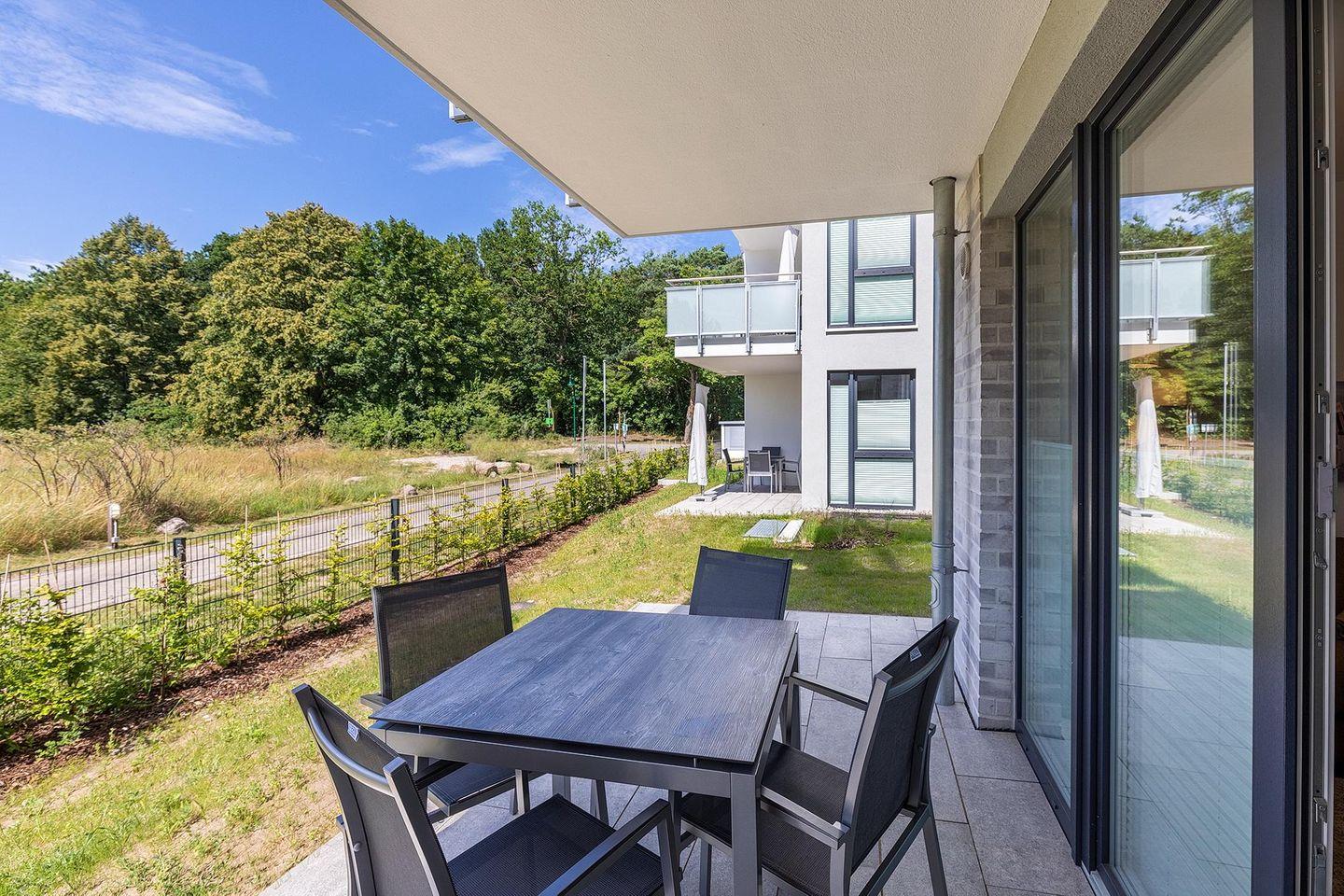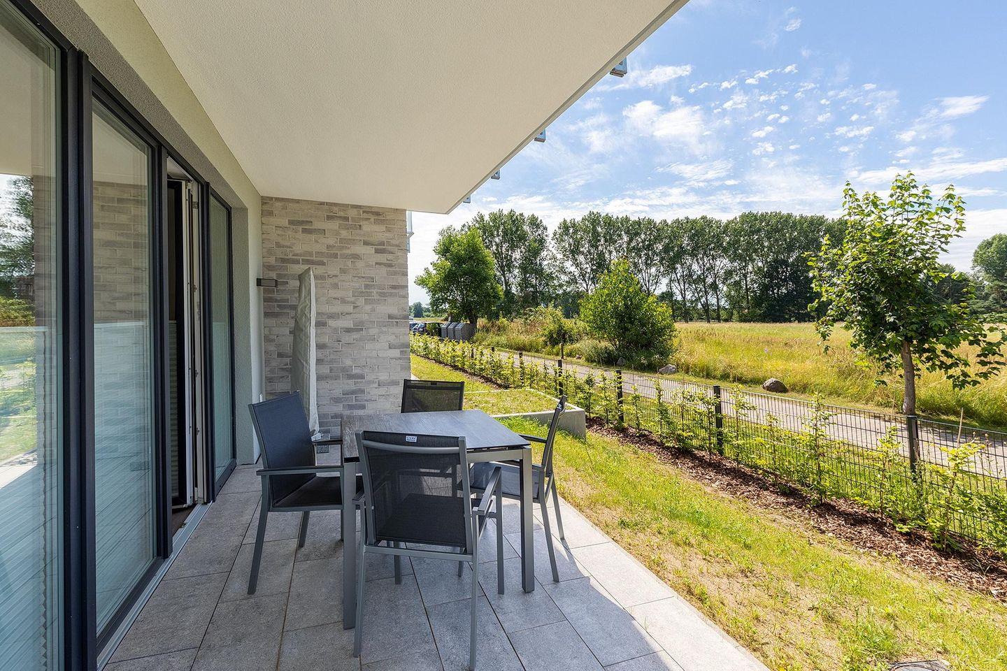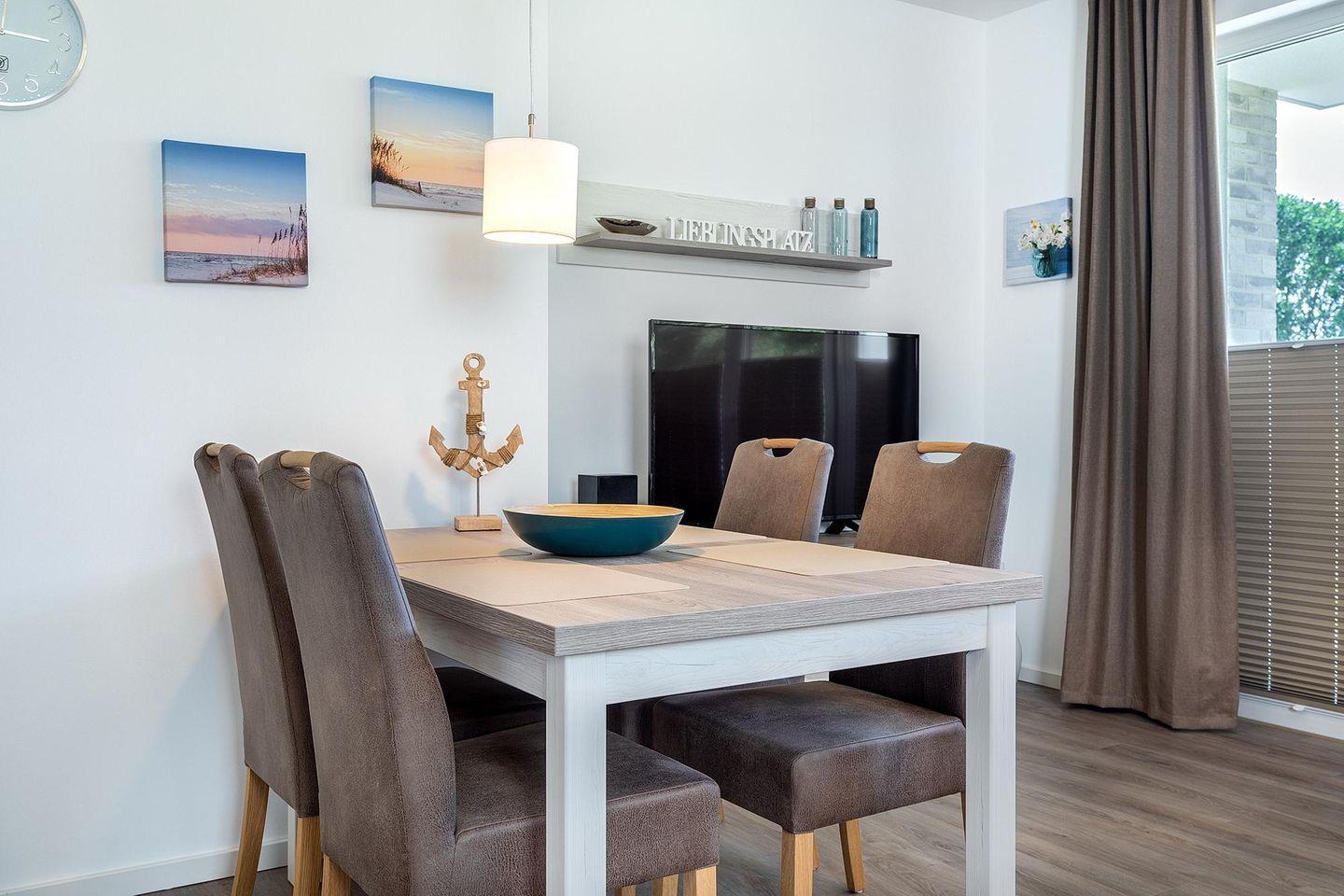 Das 56 m² große und barrierearme 2-Zimmer Apartment ist für bis zu 4 Personen geeignet. Besonders hervorzuheben ist die großzügige Terrasse in Nord-West-Lage; hier lässt sich nach einem erholsamen Urlaubstag die Sonne und die Seeluft bis in den Abend hinein genießen.