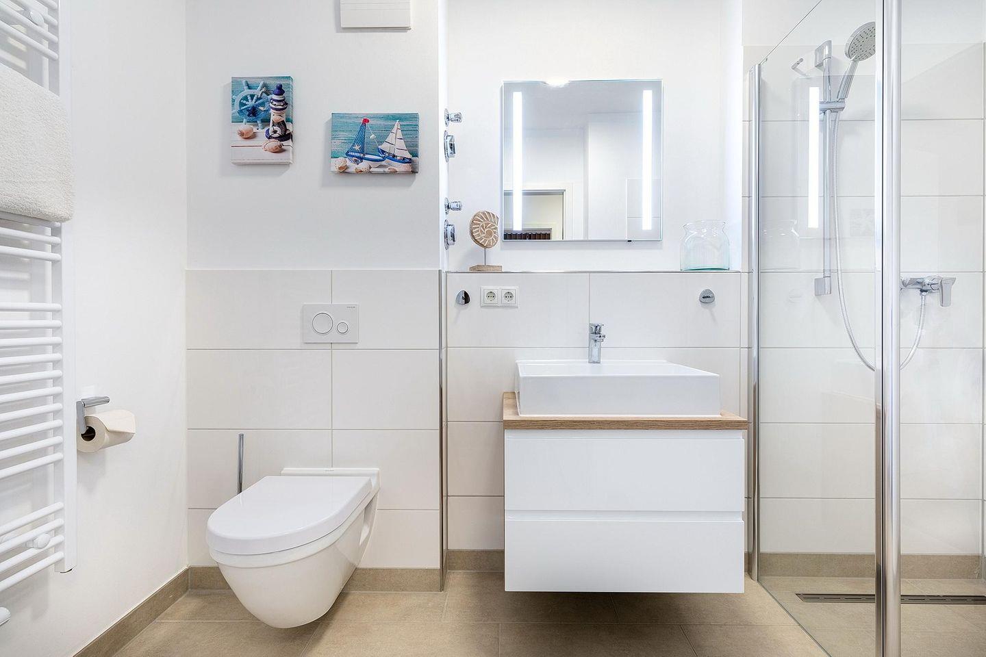Das familienfreundliche und moderne Nichtraucher-Apartment verfügt über Fußbodenheizung, bodentiefe Fenster mit 3-fach Isolierung, kostenfreies WLAN und eine voll ausgestattete offene Küche mit Geschirrspüler, Gefrierfach, Kaffeemaschine, Toaster, Wasserkocher, Backofen und Mikrowelle sowie über einen Essbereich. Im Wohnbereich befindet sich eine Doppelschlafcouch (1,60 x 2,00 m) und ein großer Flatscreen-TV mit Blu-ray-Player. Das separate Schlafzimmer ist mit einem modernen Boxspringbett (1,80 x 2,00 m) und einem Flatscreen-TV ausgestattet. Ein Kinderbett kann gegen Entgelt aufgestellt werden und auf Wunsch könnt ihr einen Kinderhochstuhl hinzubuchen. Im stilvollen Badezimmer befinden sich eine ebenerdige Dusche, ein Waschtisch mit Föhn, Kosmetikspiegel und Handtuchheizkörper. Das Apartment verfügt über einen Flur mit Garderobe. Nach einem Tag am Meer könnt ihr auf der mit Gartenmöbeln und Sonnenschirm ausgestatteten Terrasse in Westlage entspannen und dabei die Abendsonne genießen. Die Terrasse ist vom Wohnbereich aus begehbar.