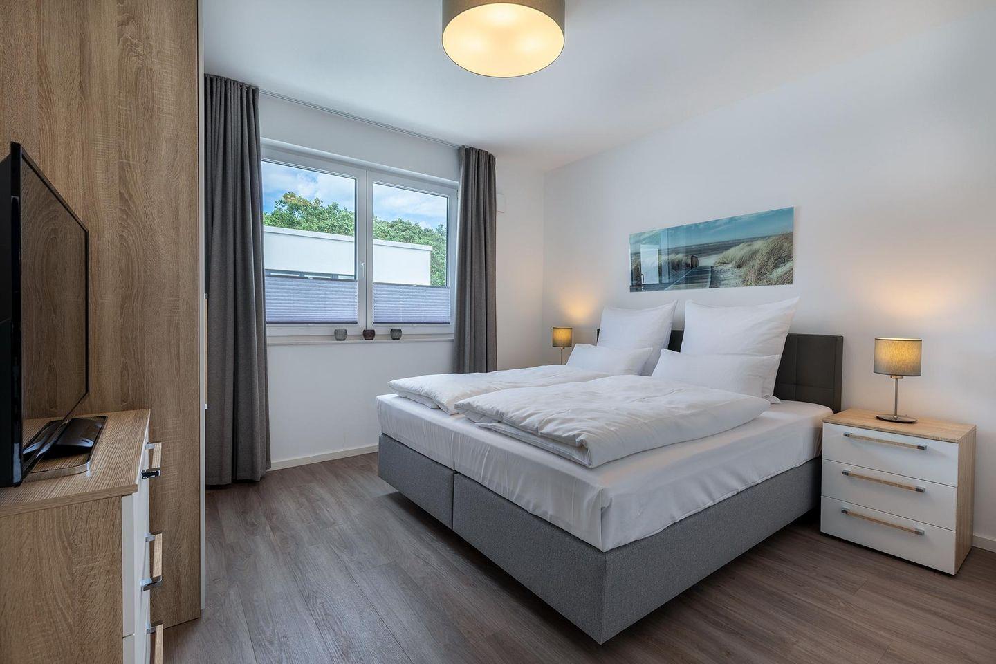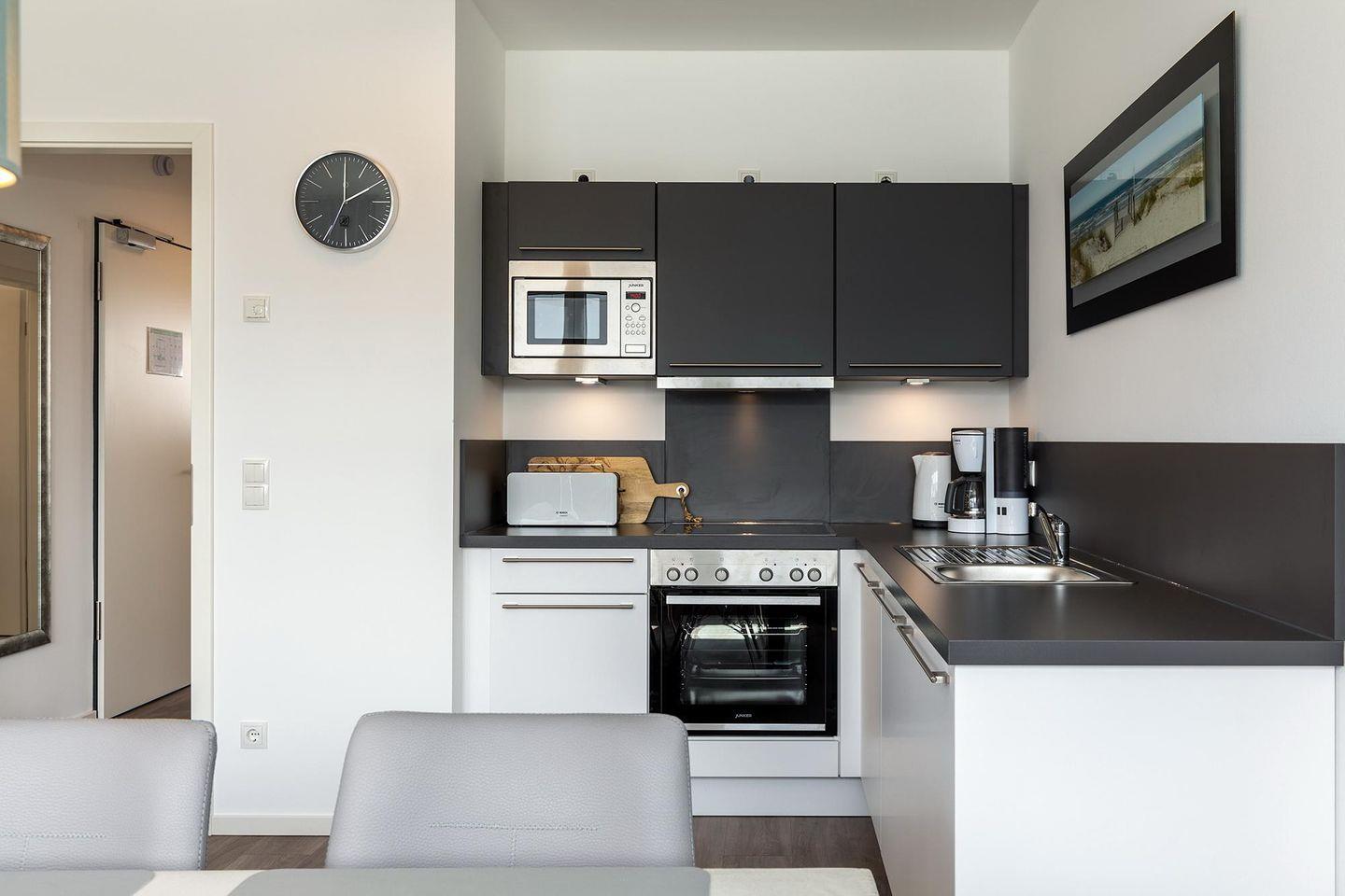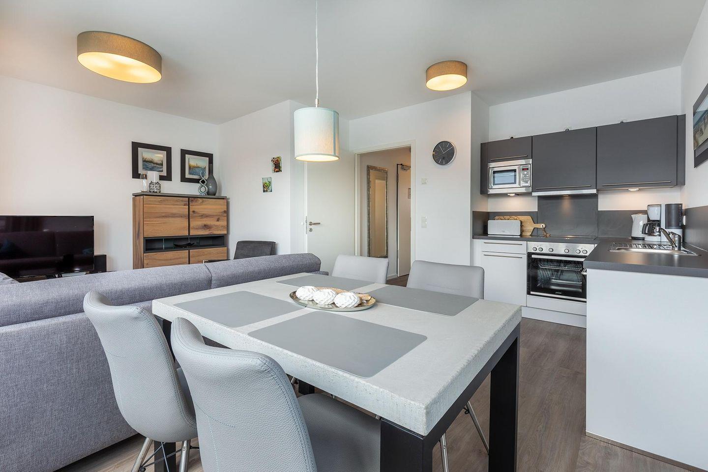 Das helle und moderne Nichtraucher-Apartment verfügt über Fußbodenheizung, bodentiefe Fenster mit 3-fach Isolierung, kostenfreies WLAN und eine voll ausgestattete offene Küche mit Geschirrspüler, Gefrierfach, Kaffeemaschine, Toaster, Wasserkocher, Backofen und Mikrowelle sowie über einen Essbereich. Im Wohnbereich befindet sich eine Doppelschlafcouch (1,60 x 2,00 m) und ein großer Flatscreen-TV mit Blu-Ray-Player. Das separate Schlafzimmer ist mit einem modernen Boxspringbett (1,80 x 2,00 m) und einem 2. Flatscreen-TV ausgestattet. Im stilvollen Badezimmer befinden sich eine ebenerdige Dusche, ein Waschtisch mit Föhn, Kosmetikspiegel und Handtuchheizkörper. Das Apartment verfügt über einen Flur mit Garderobe. Auf der mit Gartenmöbeln und Sonnenschirm ausgestatteten sonnigen Dachterrasse könnt ihr nach Lust und Laune eure Urlaubstage genießen. Die Dachterrasse ist vom Wohnbereich aus begehbar. Von hier aus habt ihr einen einmaligen Blick in den nahen Küstenwald in nordöstlicher Richtung und in das Landschaftsschutzgebiet Tarnewitzer Urwald in südlicher Richtung. Bis auf eine Schwelle zur Dachterrasse, ist das Apartment barrierefrei konzipiert.